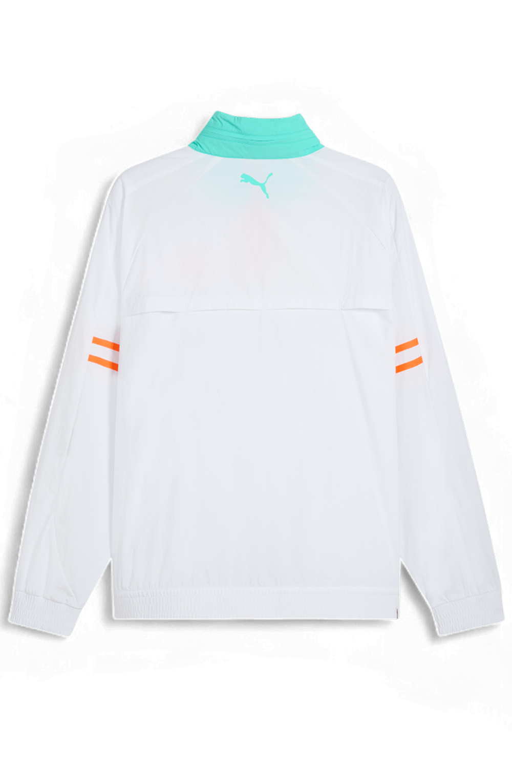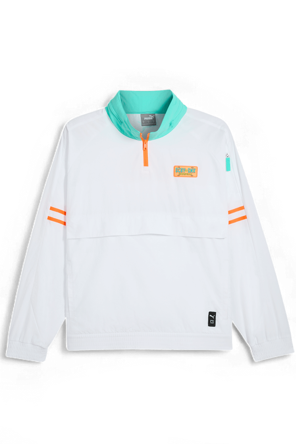 ז'קט חצי רוכסן בגזרה נינוחה מתוך שיתוף הפעולה בין מותג הספורט Puma בליין Hoops, לבין סדרת האנימציה האייקונית Scooby Doo. הז'קט עשוי תערובת ניילון בצבע לבן, בשילוב דיטיילס בצבע כחול וכתום עם פאץ' לוגו בצד החזה. הז'קט מעוצב בטכנולוגיית windCELL המגנה מפני רוח.