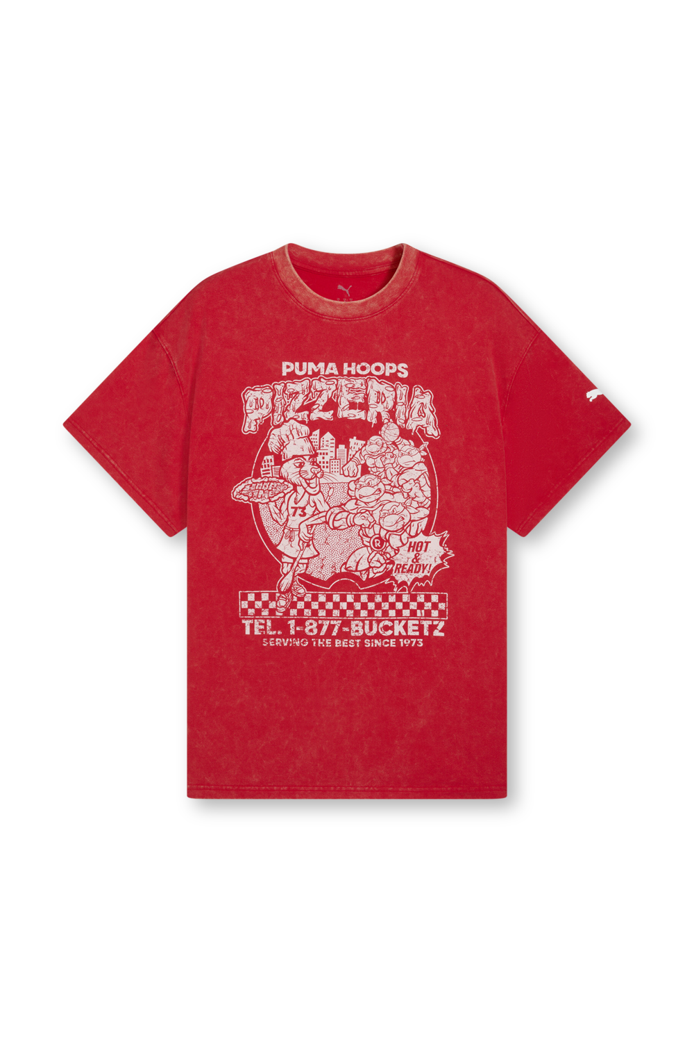 חולצת טי בגזרה משוחררת מתוך שיתוף הפעולה PUMA HOOPS x TMNT. היא עשויה כותנה בצבע אדום עם הדפס.