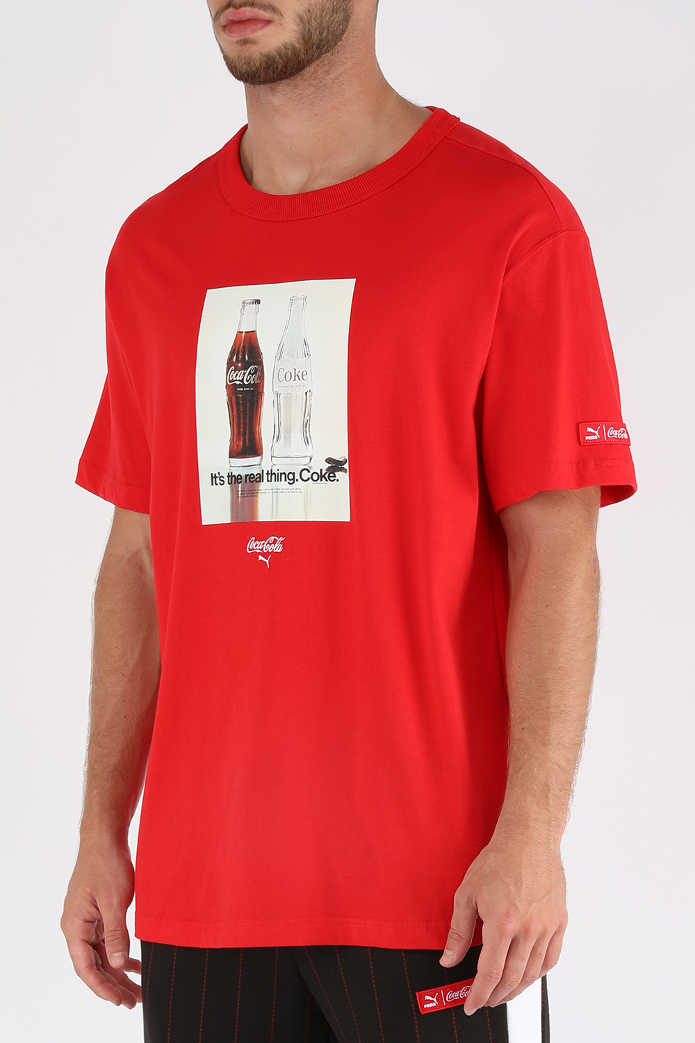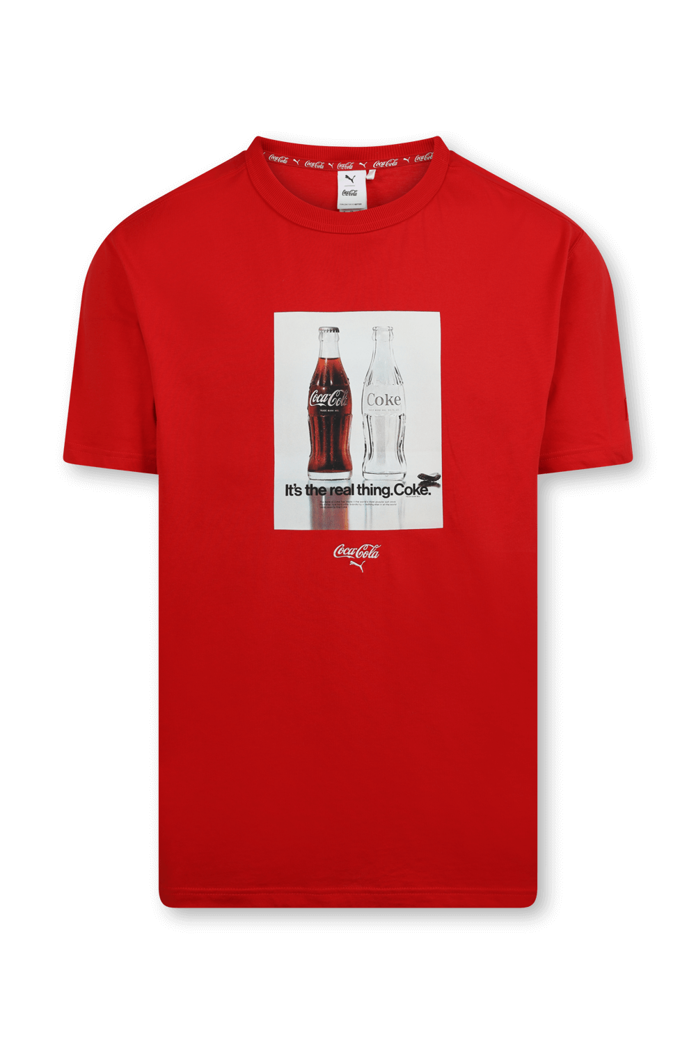 בשיתוף פעולה חדש בין Puma ו-Coca Cola, חולקים שני המותגים האייקונים היסטוריה עשירה, אופטימיות מנצחת ואת היכולת להניע דברים קדימה. חולצת טי בגוון אדום, היא חלק מהשת"פ הזה, והיא מגיעה בגזרת ישרה עם שרוולים קצרים וצווארון מעוגל. צילום באווירה נוסטלגית של שני בקבוקי קוקה קולה משולב בחזית, ומתחתיו מופיעים שמות שני המותגים בגוון קונטרסטי. החולצה תעיד שגם אכפת לך מהסביבה, והיא עשויה 100% כותנה המגודלת בחוות אקו-פרנדלי.