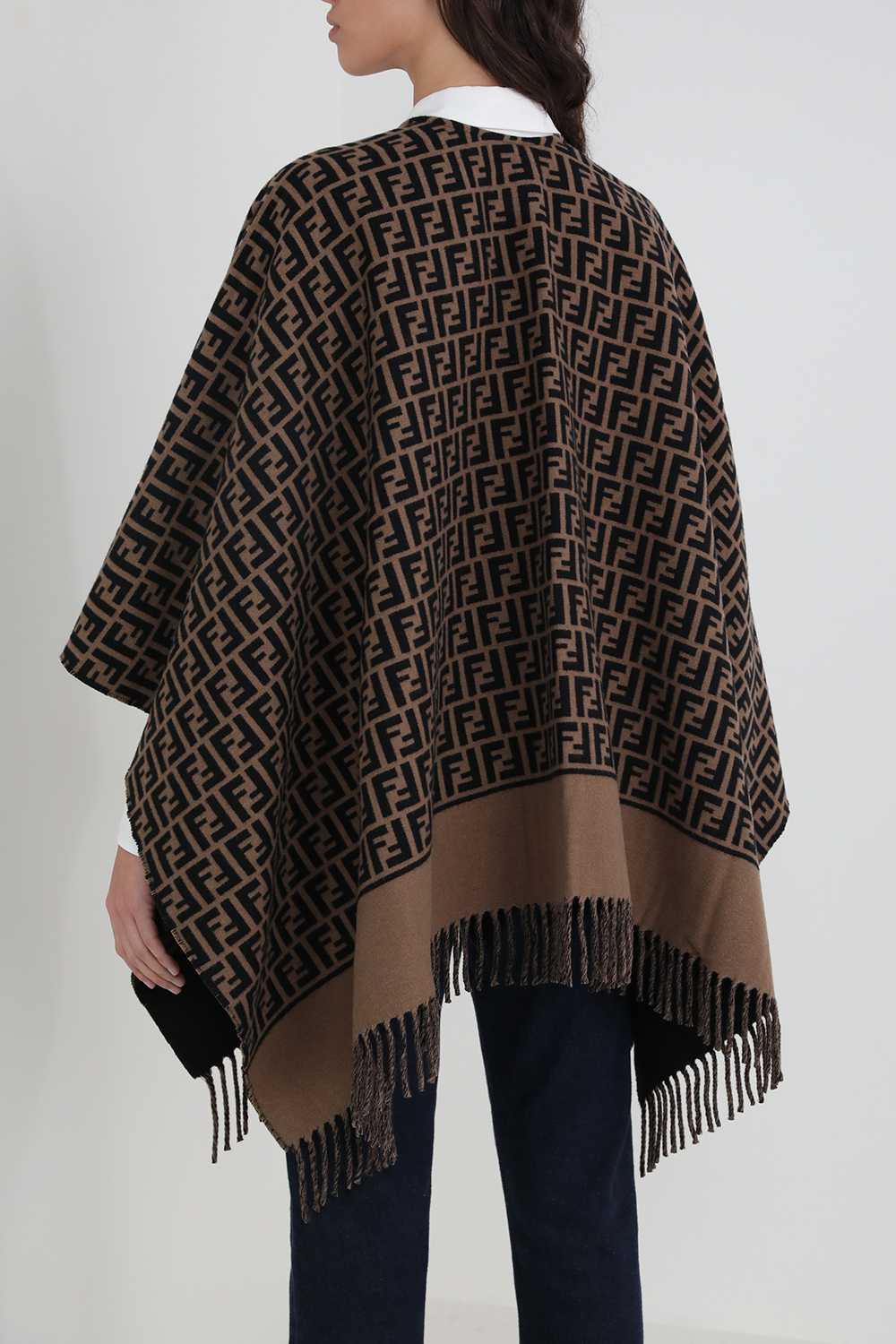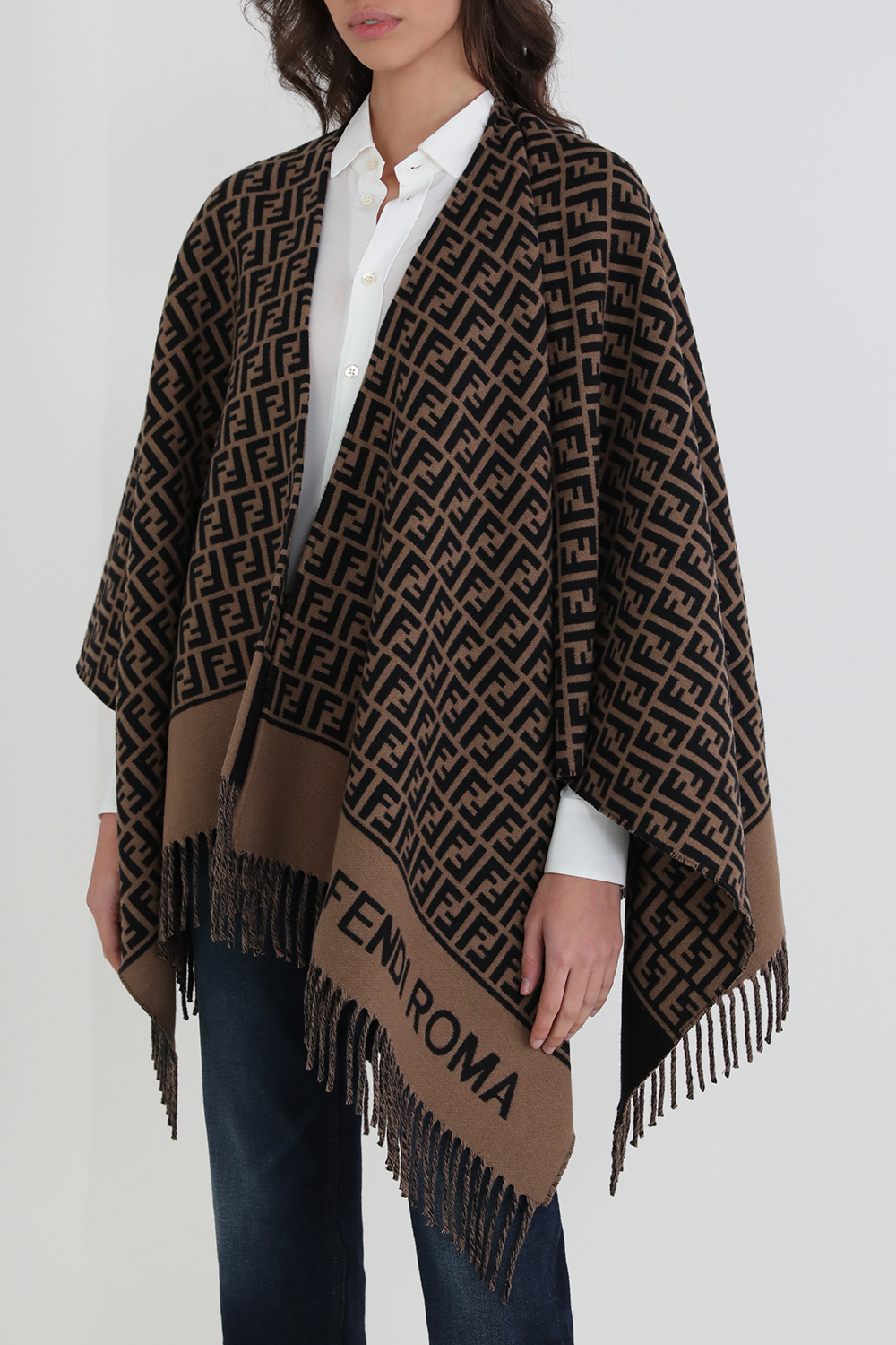 פונצ'ו מבית Fendi, עשוי צמר וקשמיר בצבע חום עם הדפס מונוגרמי בצבע שחור ובסיומת פרנזים.