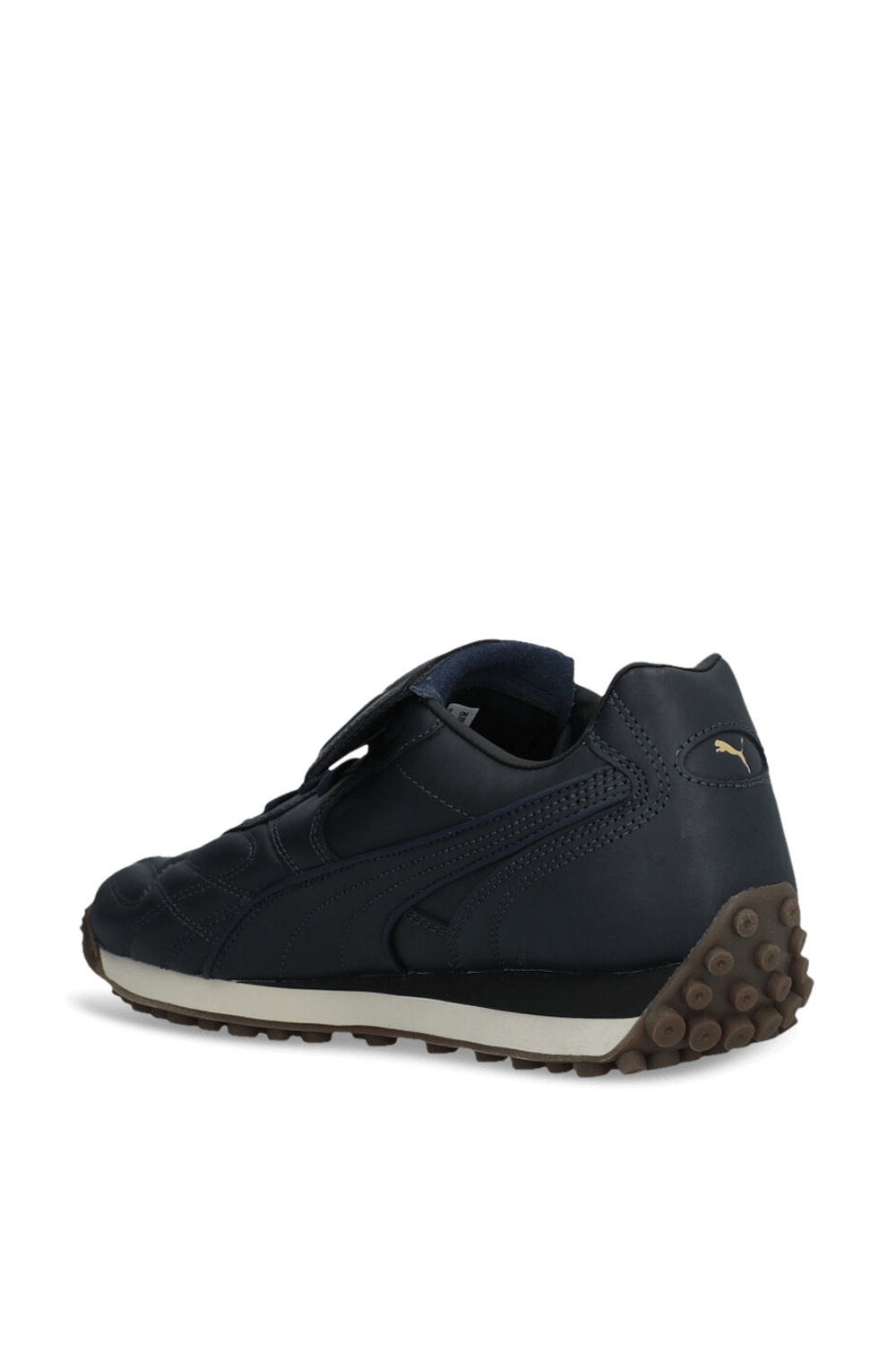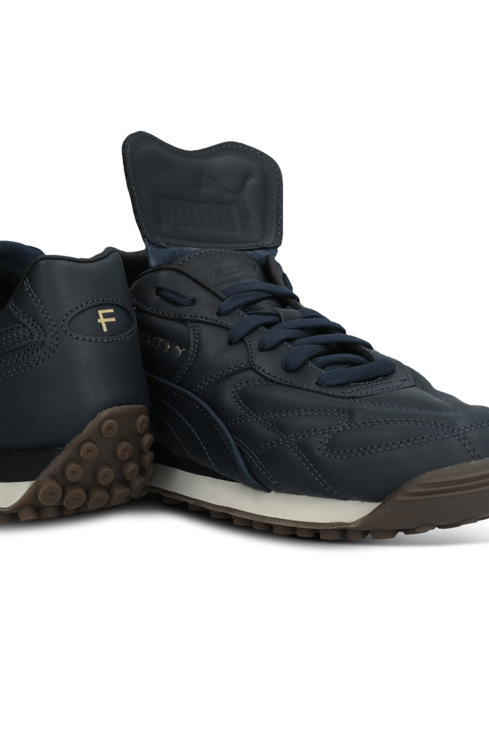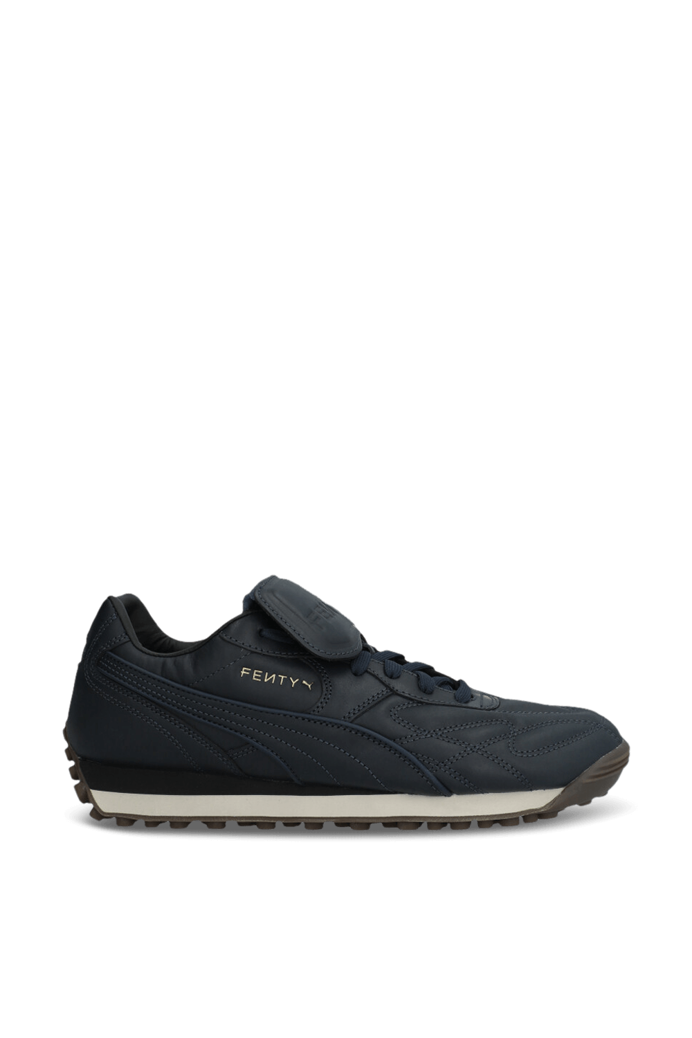 נעלי סניקרס מתוך שיתוף הפעולנ בין Puma X Fenty, עשויות עור בצבע כחול נייבי עם תיפורים דקורטיבים והדפס לוגו. הנעליים מאריכון המותג ובהשראת נעלי ספורט וינטג'.