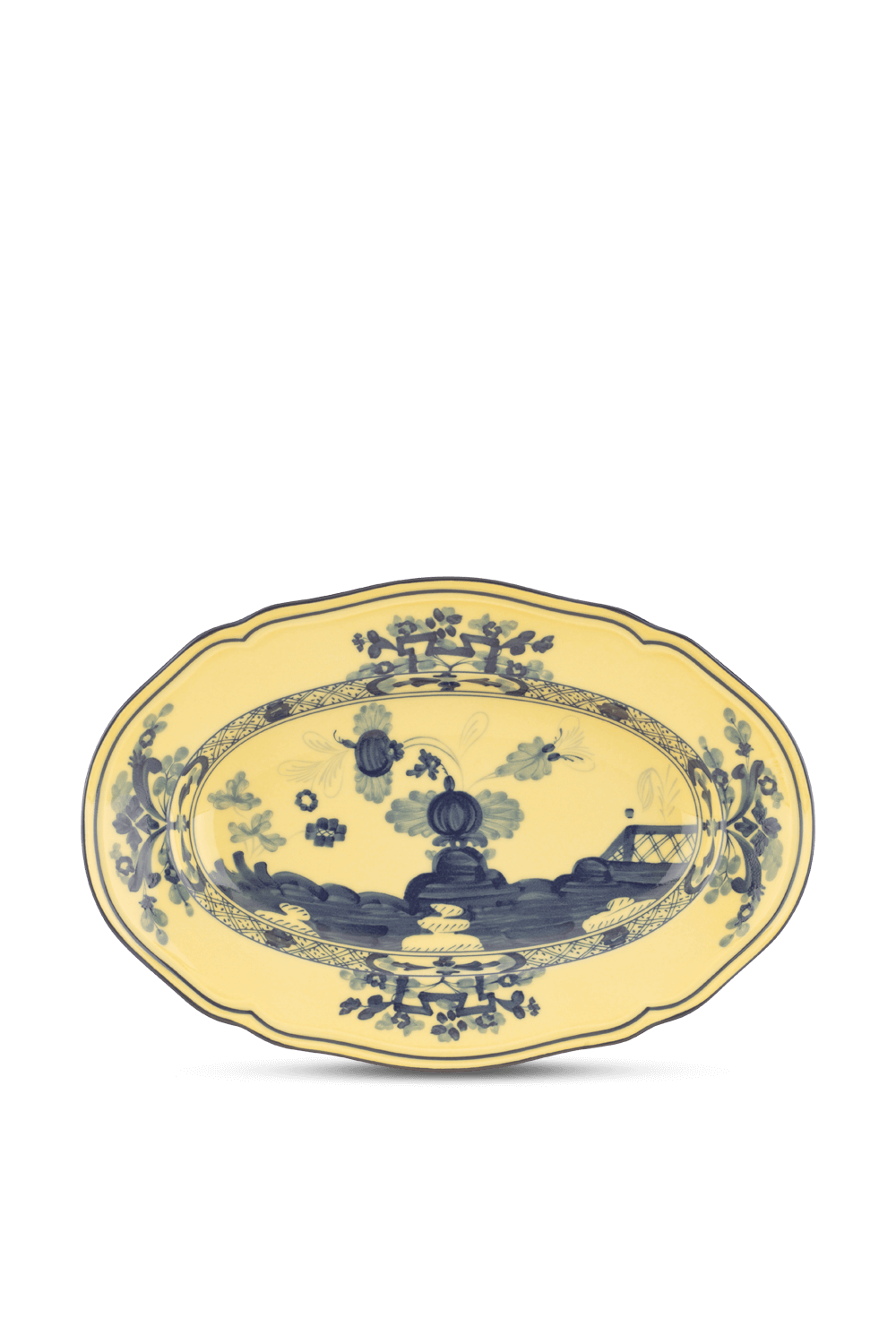צלחת הגשה אובלית מבית Ginori 1735 היוקרתי מאיטליה, מתוך קולקציית Oriente Italiano, המביאה איתה רמיזות לסיפורים וזכרונות רחוקים. הצלחת עשויה פורצלן בצבע צהוב ומעוטרת באיורי בסגנון המזרח הרחוק ופרחי ציפורן העשויים בעבודת יד. גודל: 34 סמ.