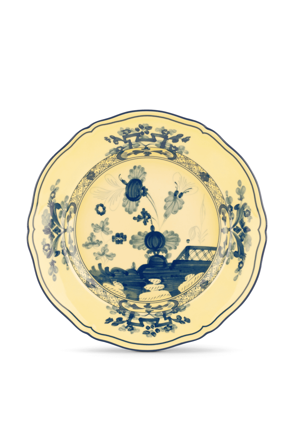 צלחת קינוח מבית Ginori 1735 היוקרתי מאיטליה, מתוך קולקציית Oriente Italiano, המביאה איתה רמיזות לסיפורים וזכרונות רחוקים. הצלחת עשויה פורצלן בצבע צהוב ומעוטרת באיורי בסגנון המזרח הרחוק ופרחי ציפורן העשויים בעבודת יד. גודל: 21 סמ.