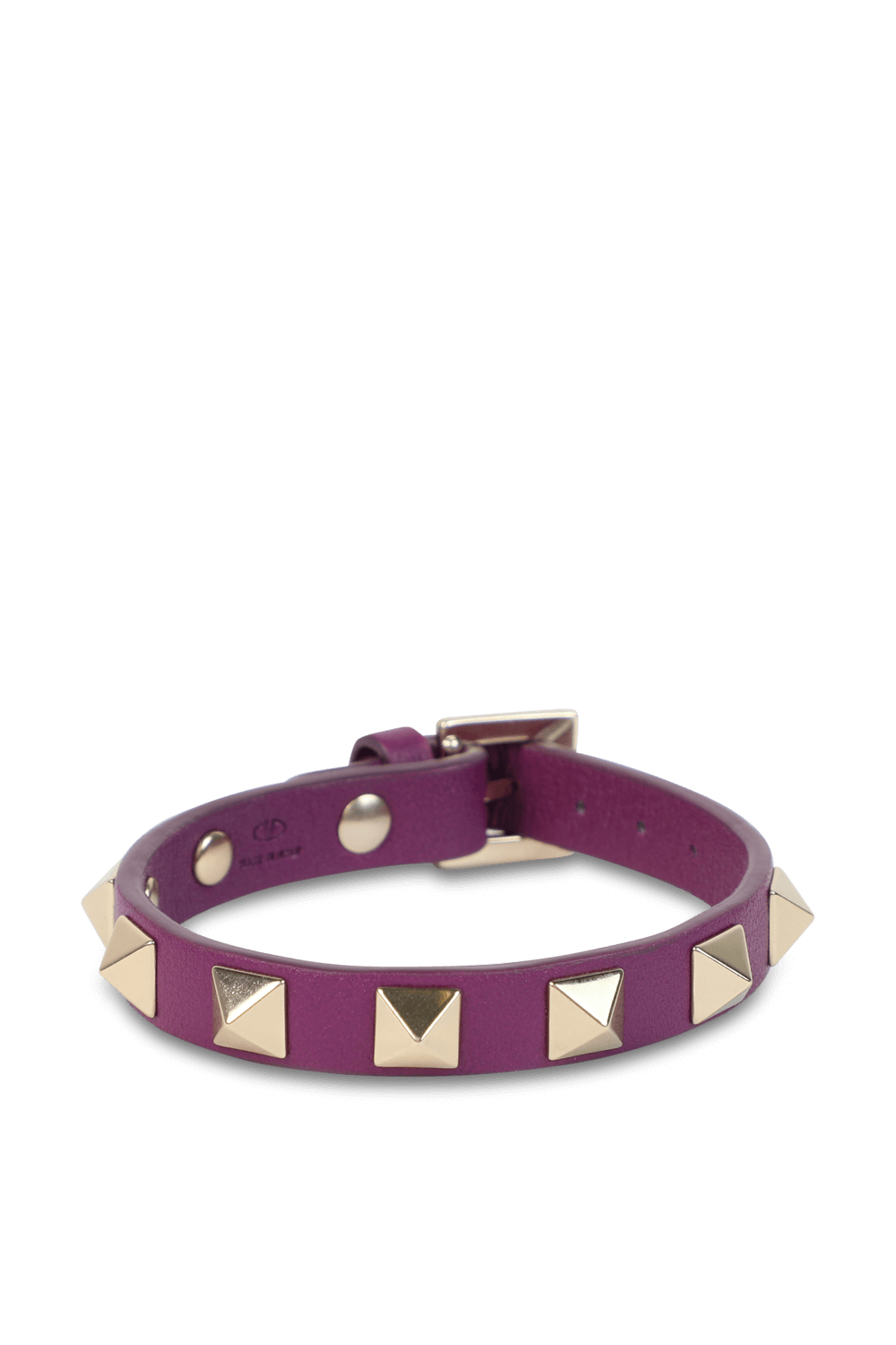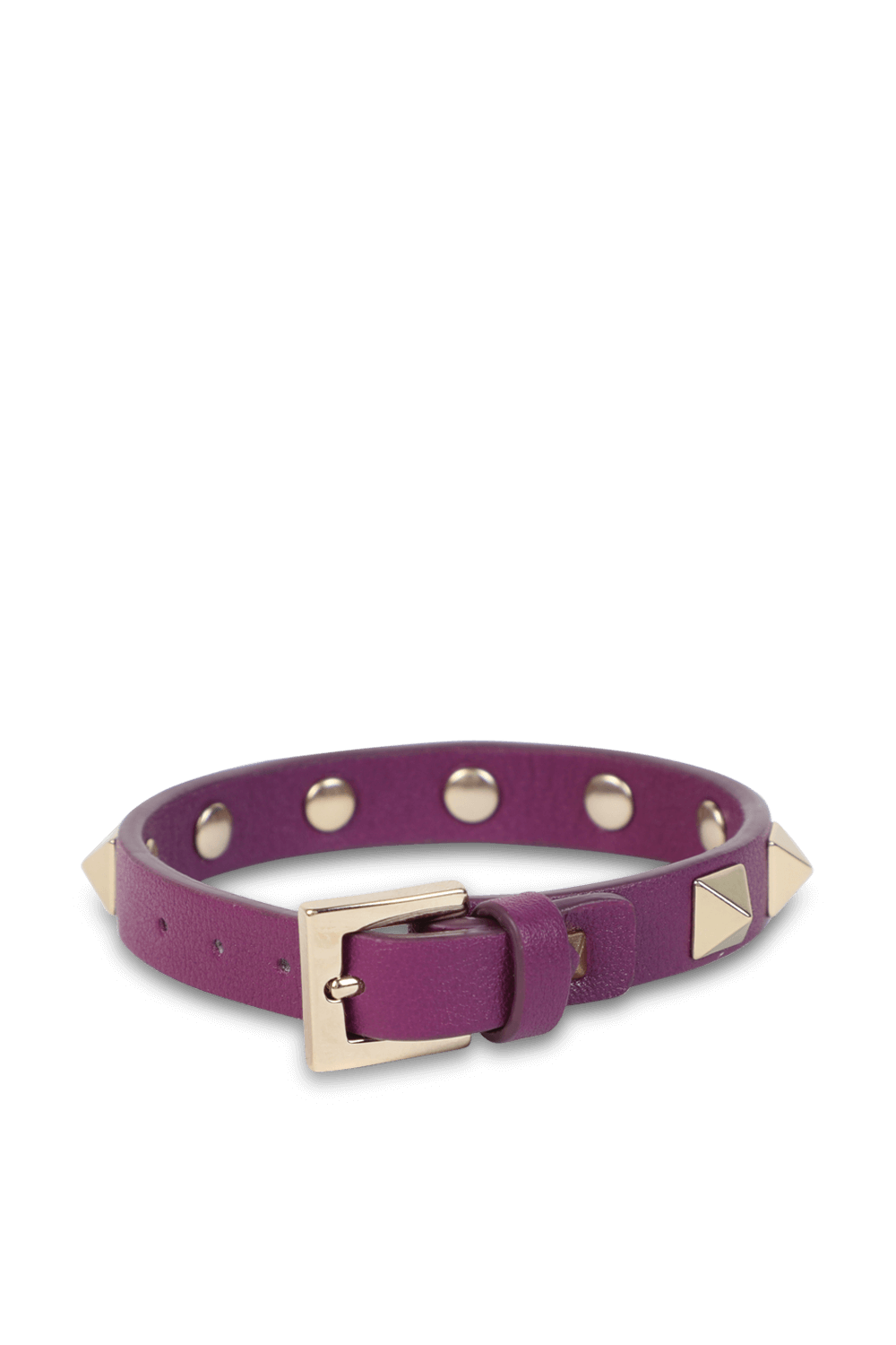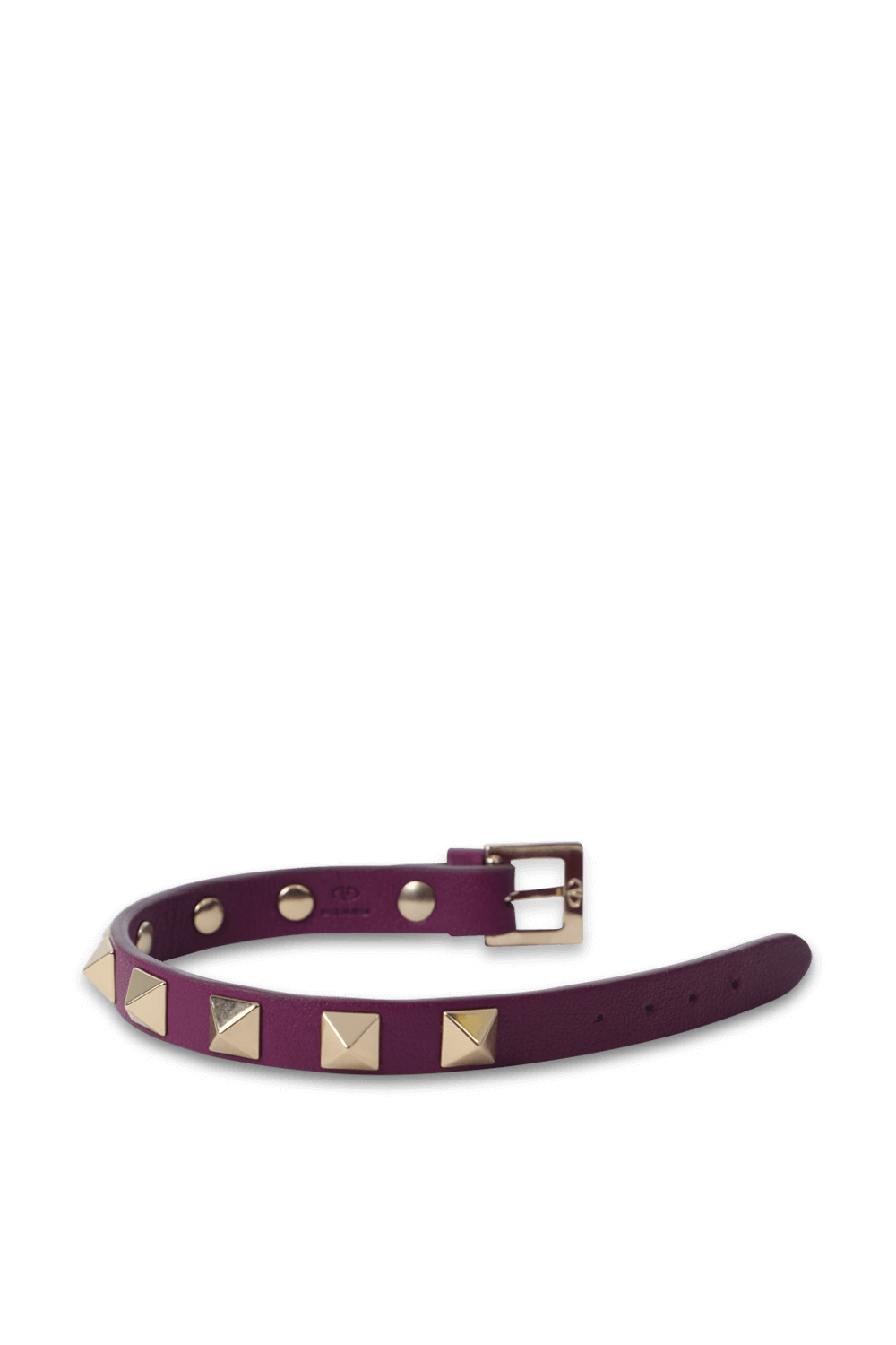 "צמיד מבית מותג העל Valentino, העשוי עור משובח בגוון סגול. לאקססורי יוקרתי זה עיטור ניטים זהובים המזוהים עם המותג, ולו שלל חורי הידוק לצד סגירת אבזם זהוב."