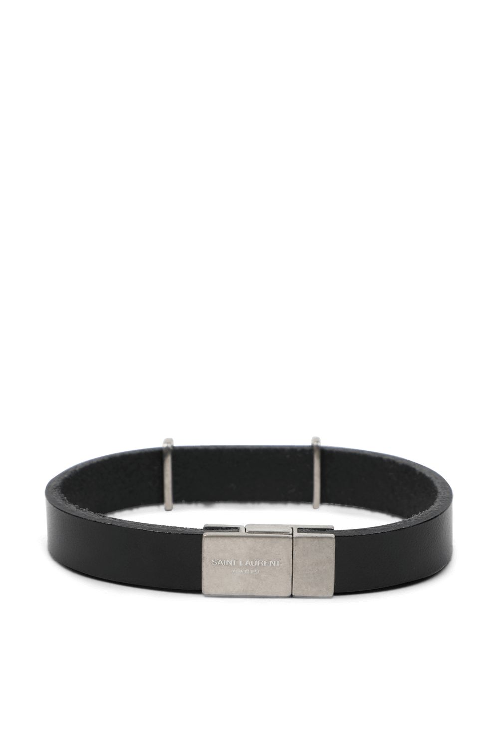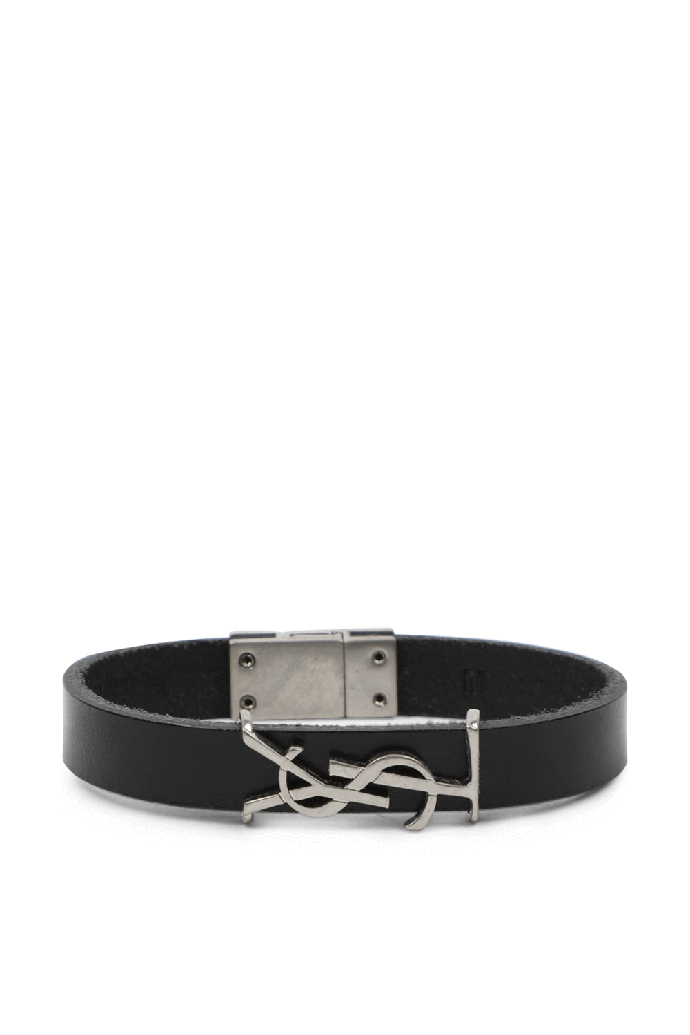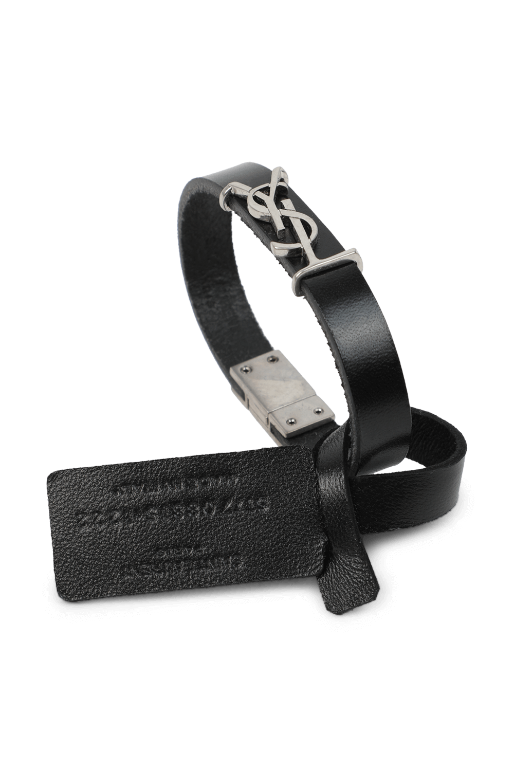 צמיד מבית Saint Laurent, העשוי מעור איכותי בצבע שחור עם אבזם מטאלי מונוגרמי כסוף.