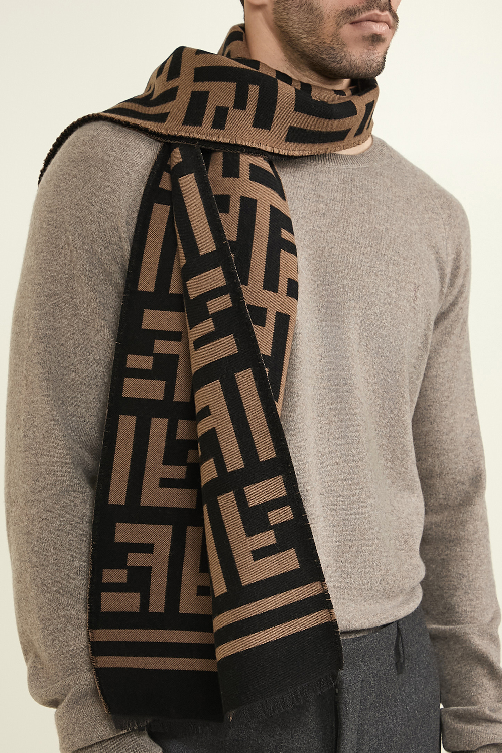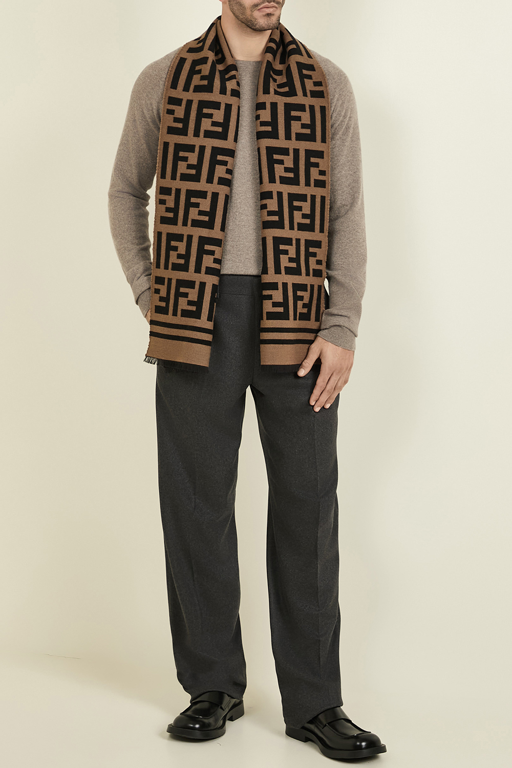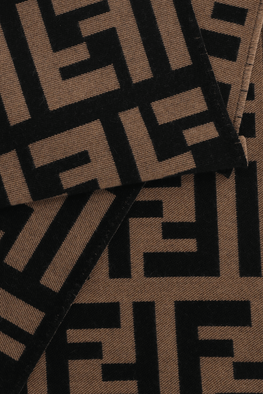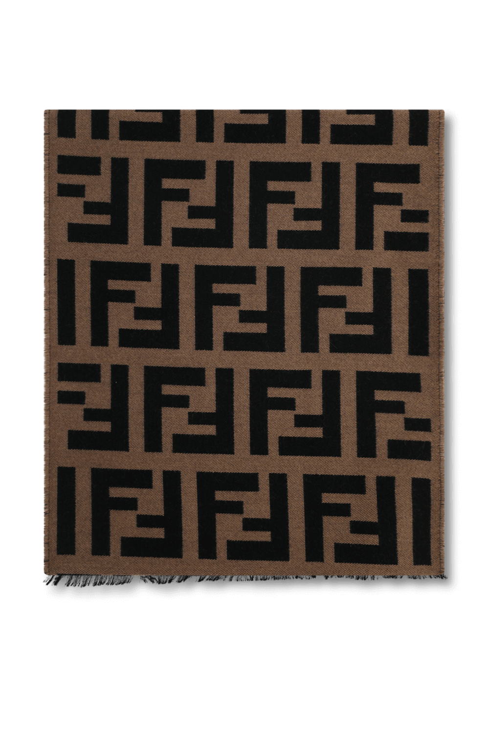 צעיף מבית Fendi, תוצרת איטליה, עשוי תערובת צמר ומשי בצבע חום בשילוב רקמת לוגו המותג ובסיומת במראה פרום.
