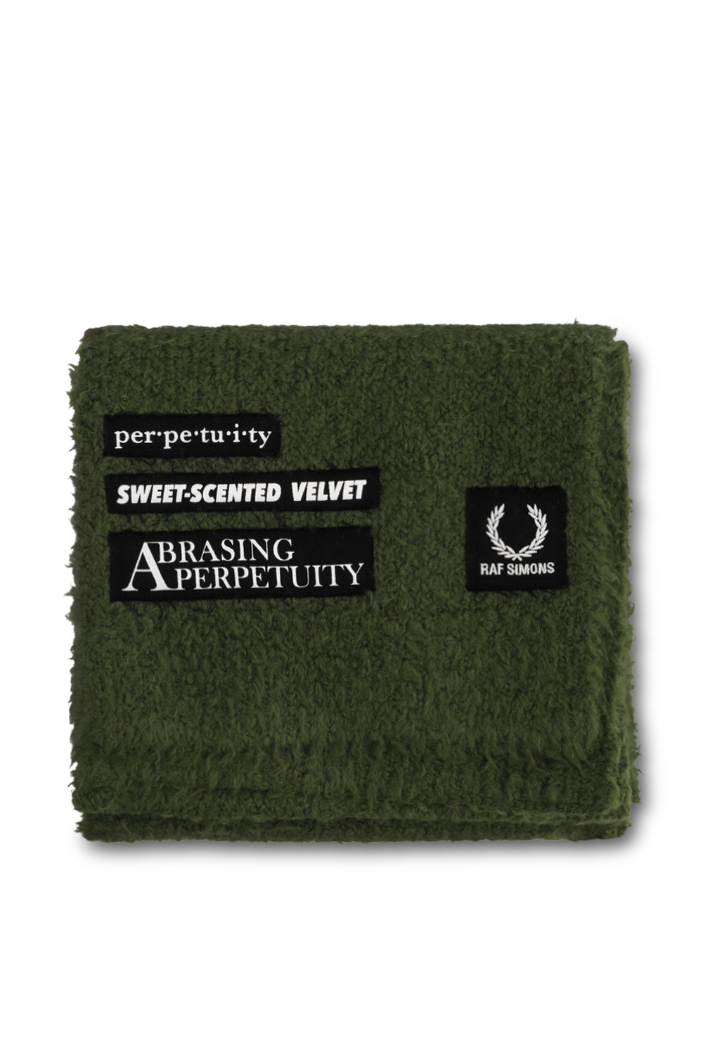 צעיף בעיצוב Fred Rerry, עשוי צמר ופוליאמיד רך ונעים בצבע ירוק, עם תוספת פאצ`ים בקצה הצעיף.
