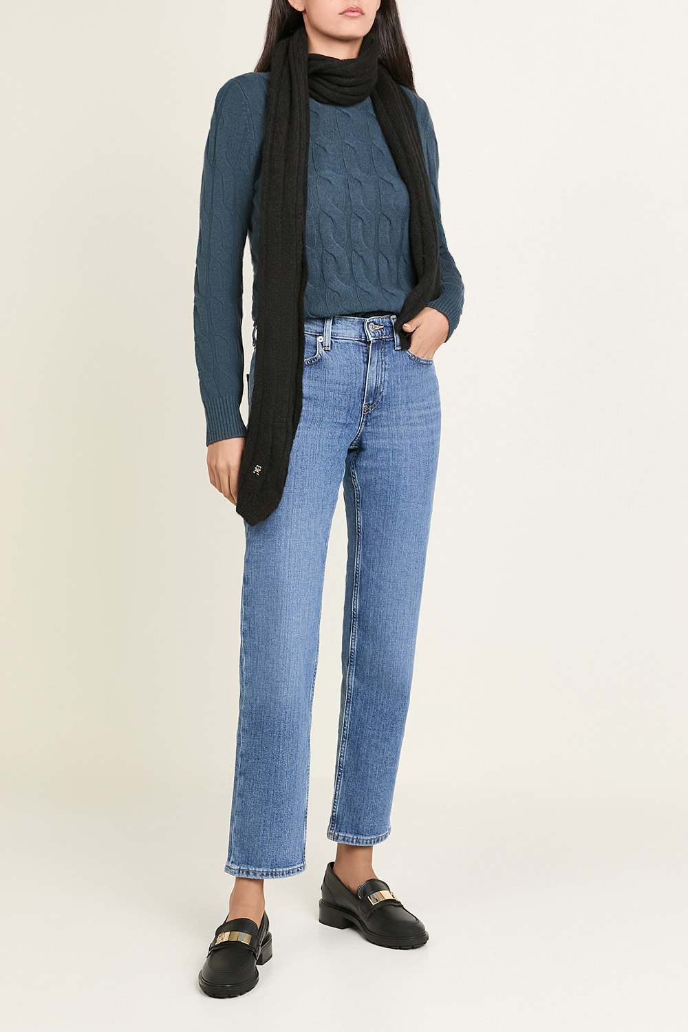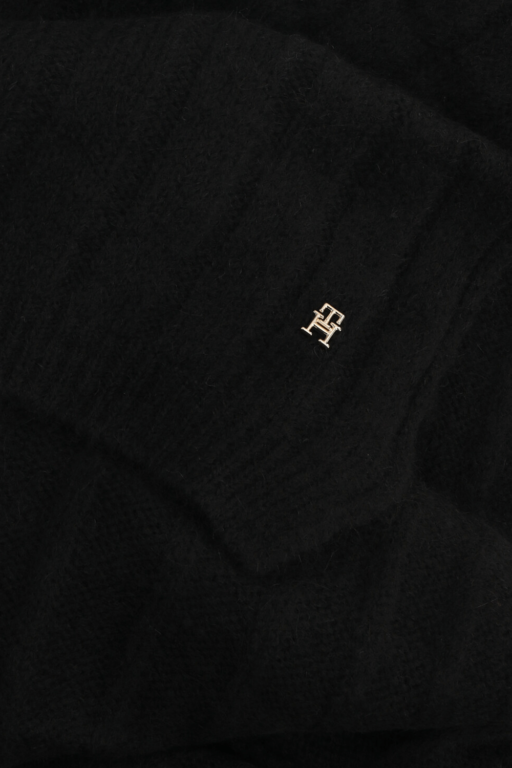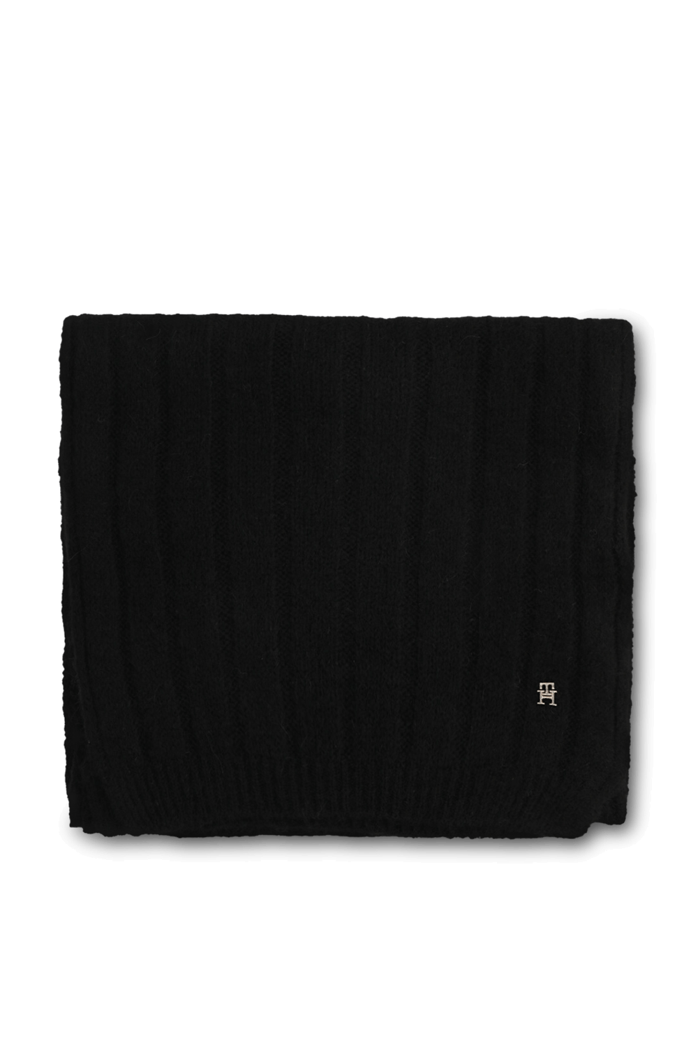 צעיף מבית Tommy Hilfiger, תוצרת איטליה, עשוי תערובת אקריליק - גמיש, חזק ומחמם יותר מצמר, פוליאמיד וצמר בצבע שחור ובמרקם סרוג.