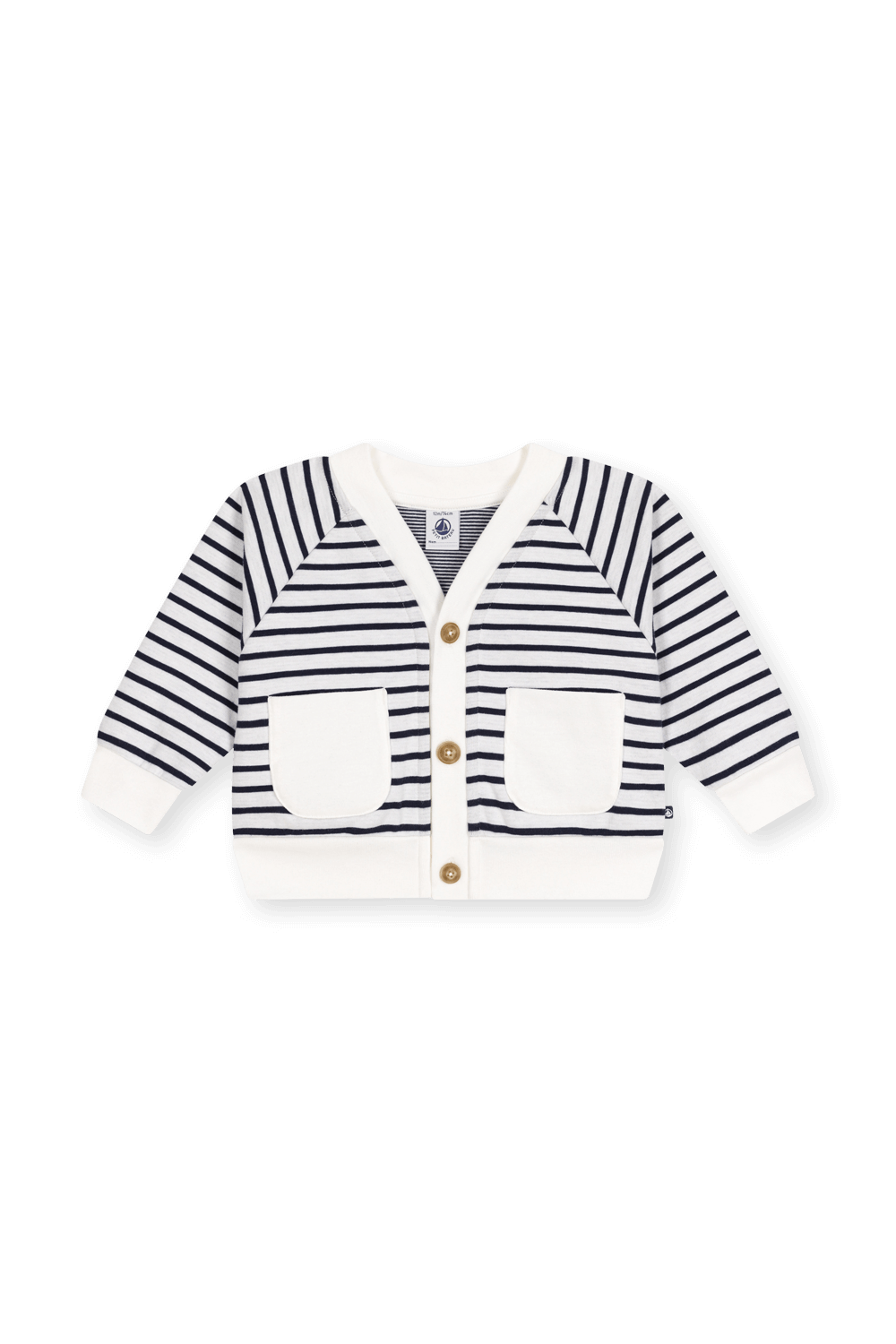 קרדיגן מבית Petit Bateau, עשוי כותנה אורגנית בדוגמת פסים כחול-לבן עם שני כיסים קדמיים, ובסגירת שלושה כפתורים ללבישה קלה ונוחה.