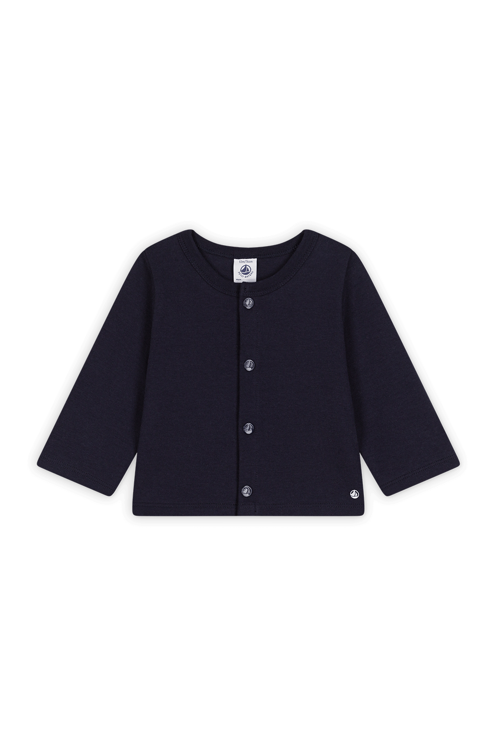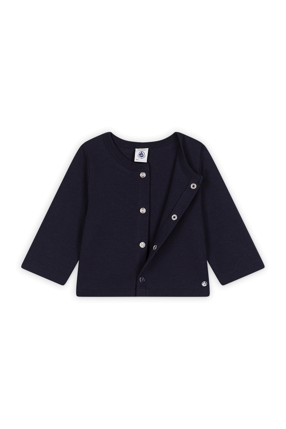 קרדיגן מבית Petit Bateau, עשוי כותנת ג'רזי מעט עבה, רכה ומפנקת בצבע כחול כהה ובסגירת כפתורי תיק תק - העליונית המושלמת לעונות המעבר.