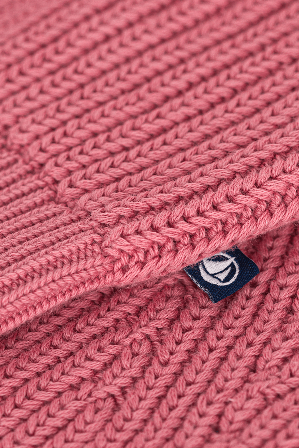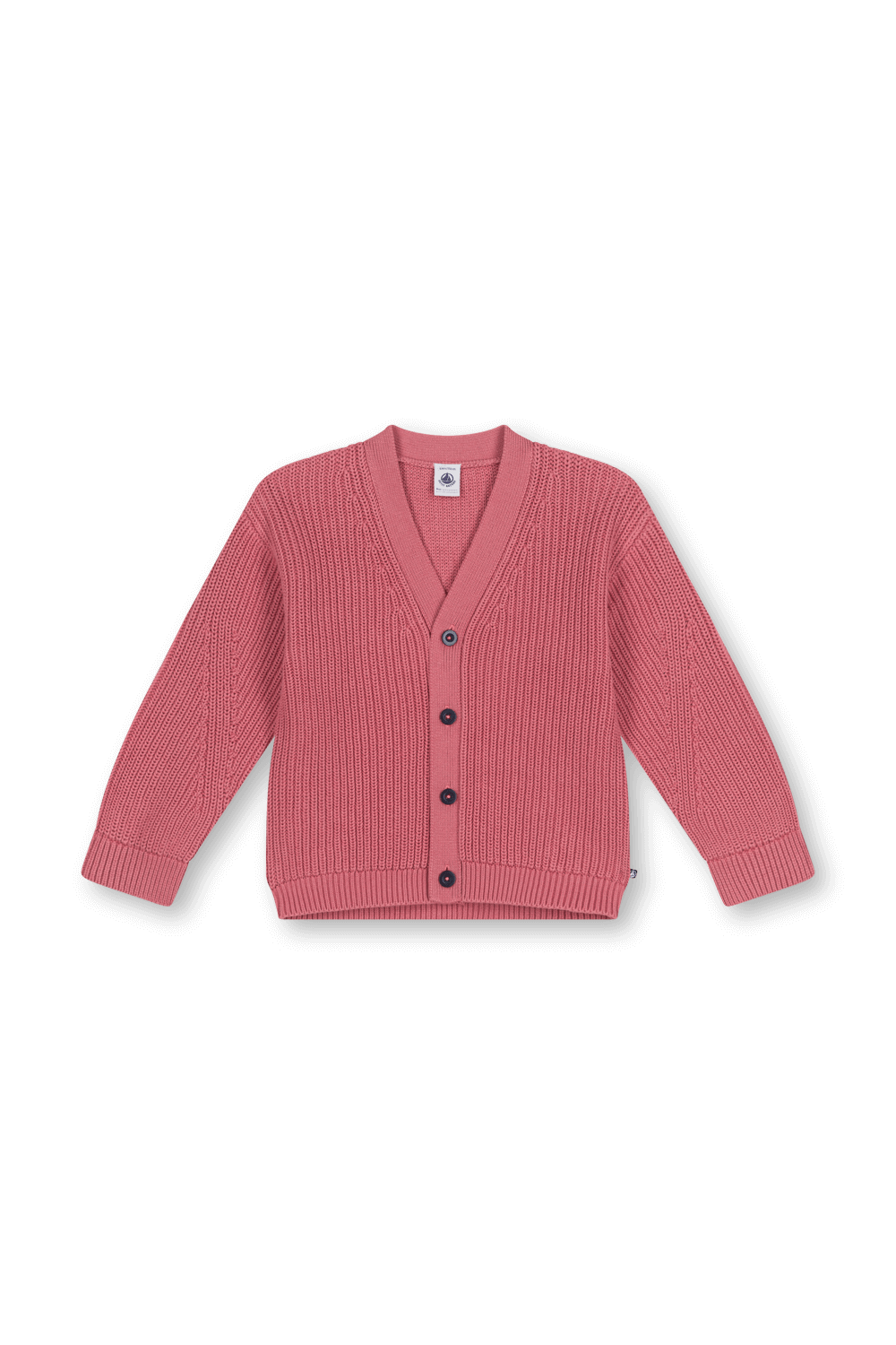 קרדיגן מבית המותג הצרפתי Petit Bateau, עשוי כותנה אורגנית במרקם סרוג ובצבע ורוד בשילוב ארבעה כפתורים לאורך החזית.