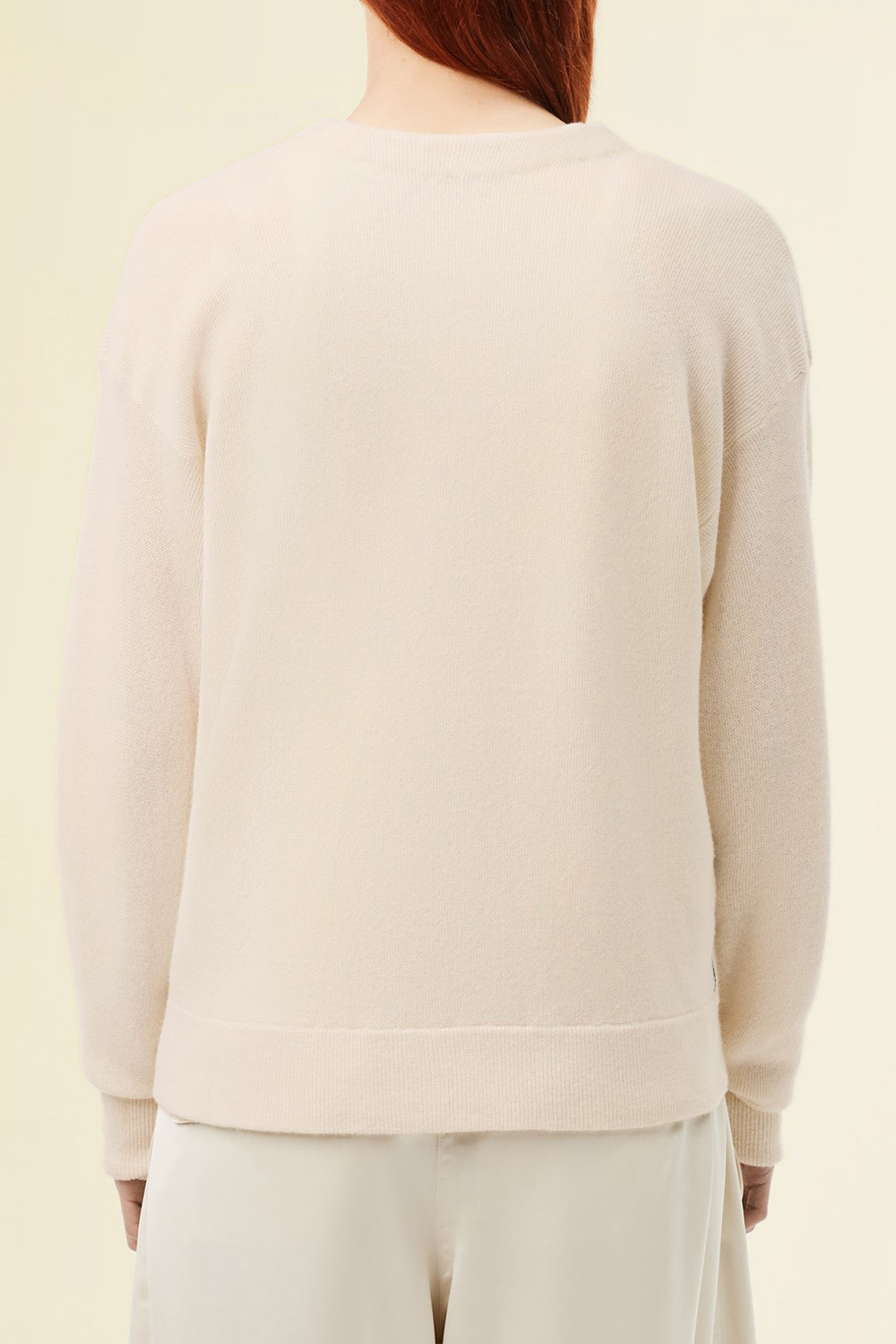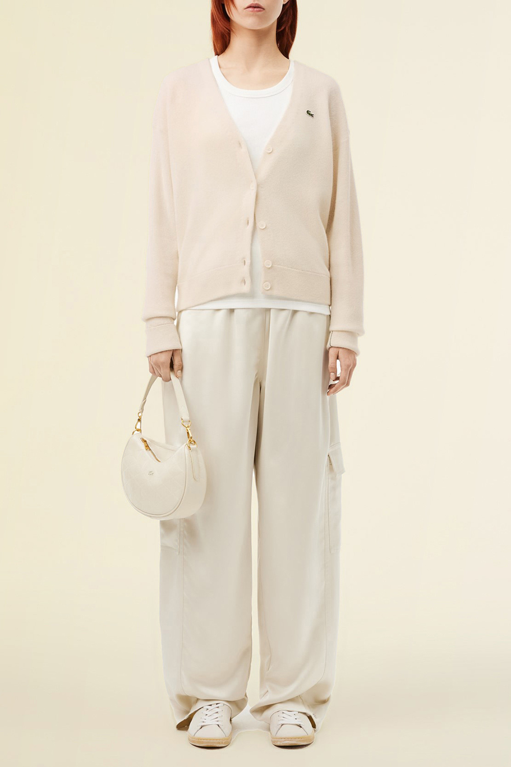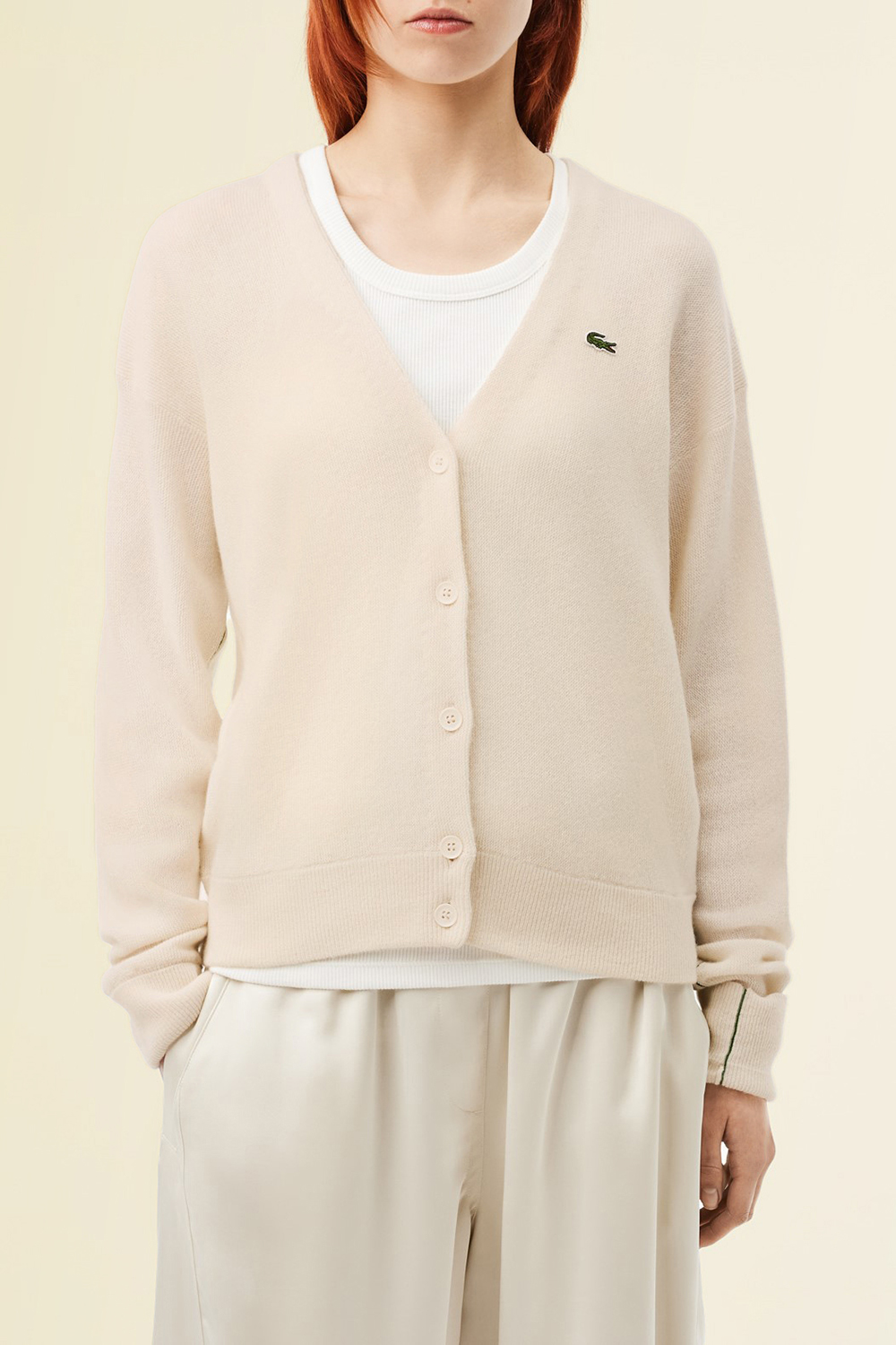קרדיגן מבית Lacoste, עשוי צמר בצבע אוף וייט בשילוב חמישה כפתורים לסגירה לאורך החזית עם פאץ' לוגו בצד החזה.