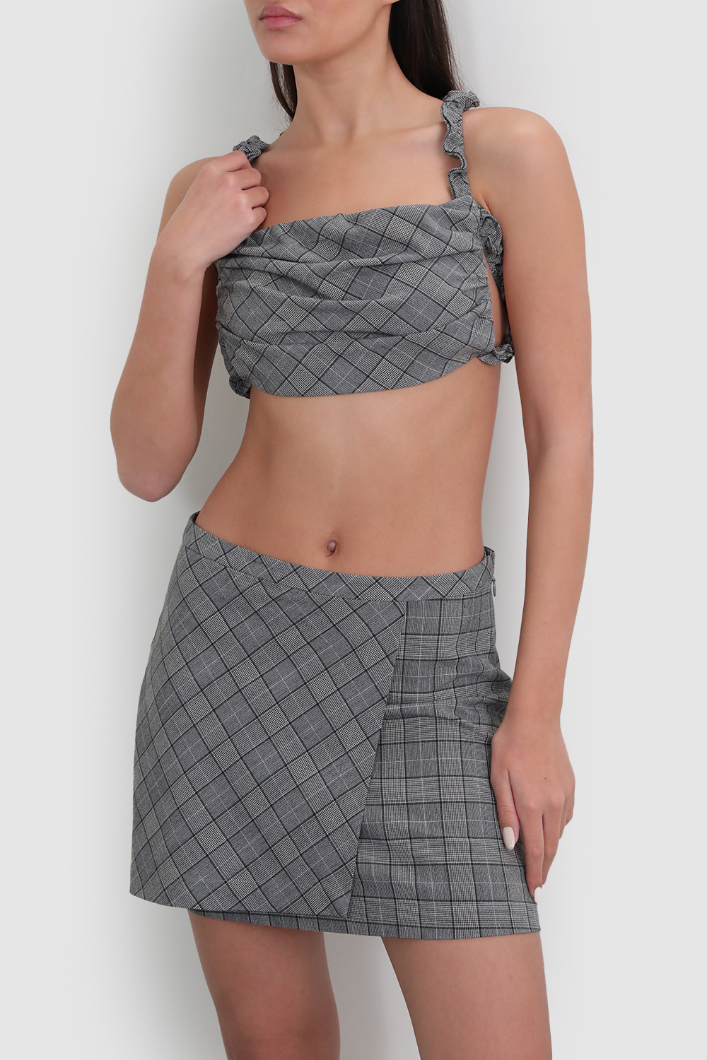 קרופ טופ מבית Ganni, עשוי תערובת פוליאסטר ממוחזר, ויסקוזה וצמר בצבע אפור ובהדפס משבצות. לטופ כתפיות איקס בגב בעיצוב מלמלה, כשניתן להשלים את הלוק בשילוב חצאית מיני תואמת.