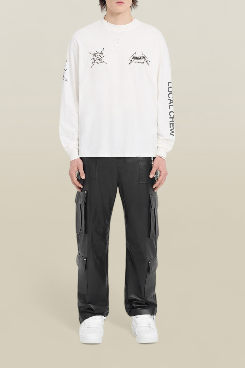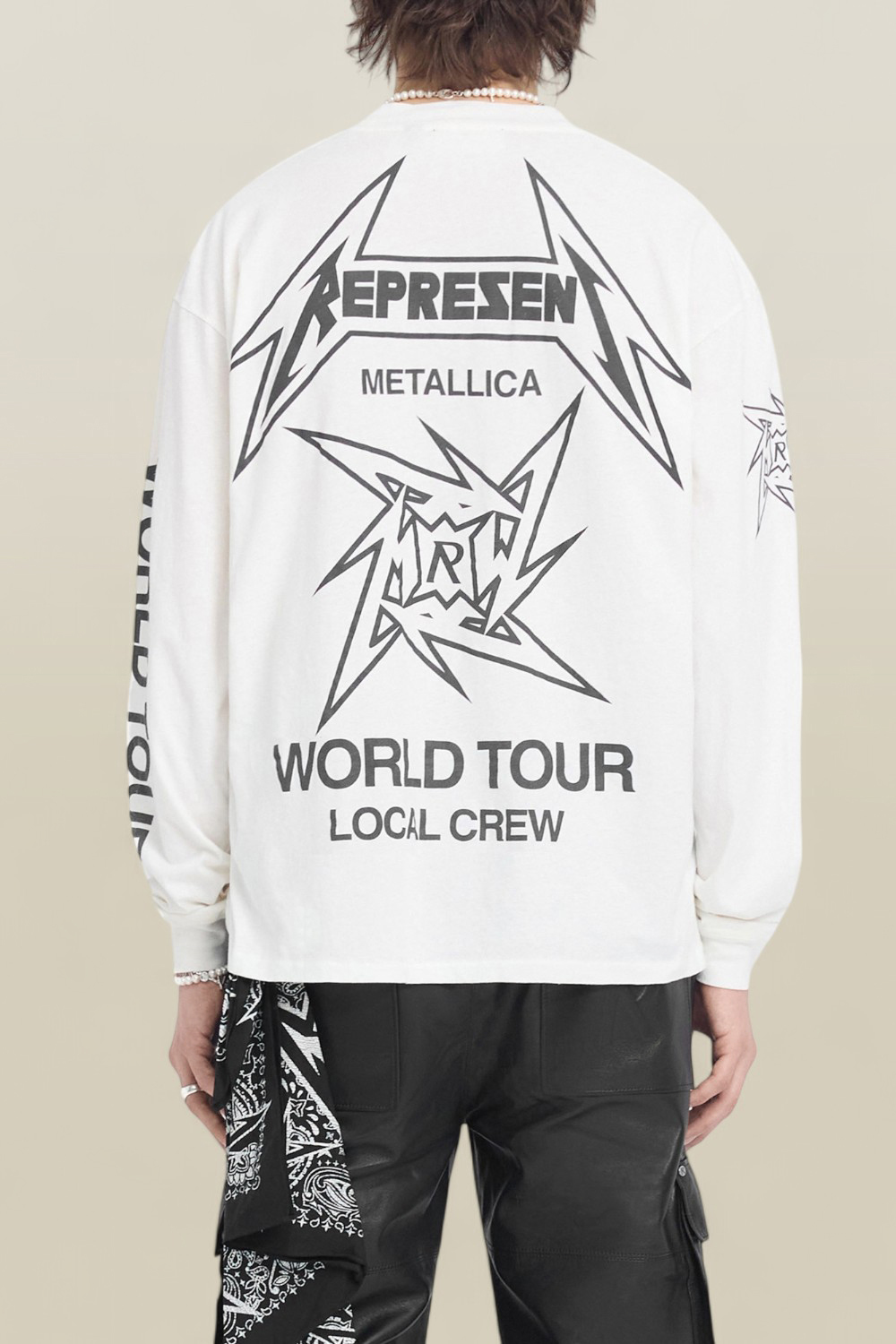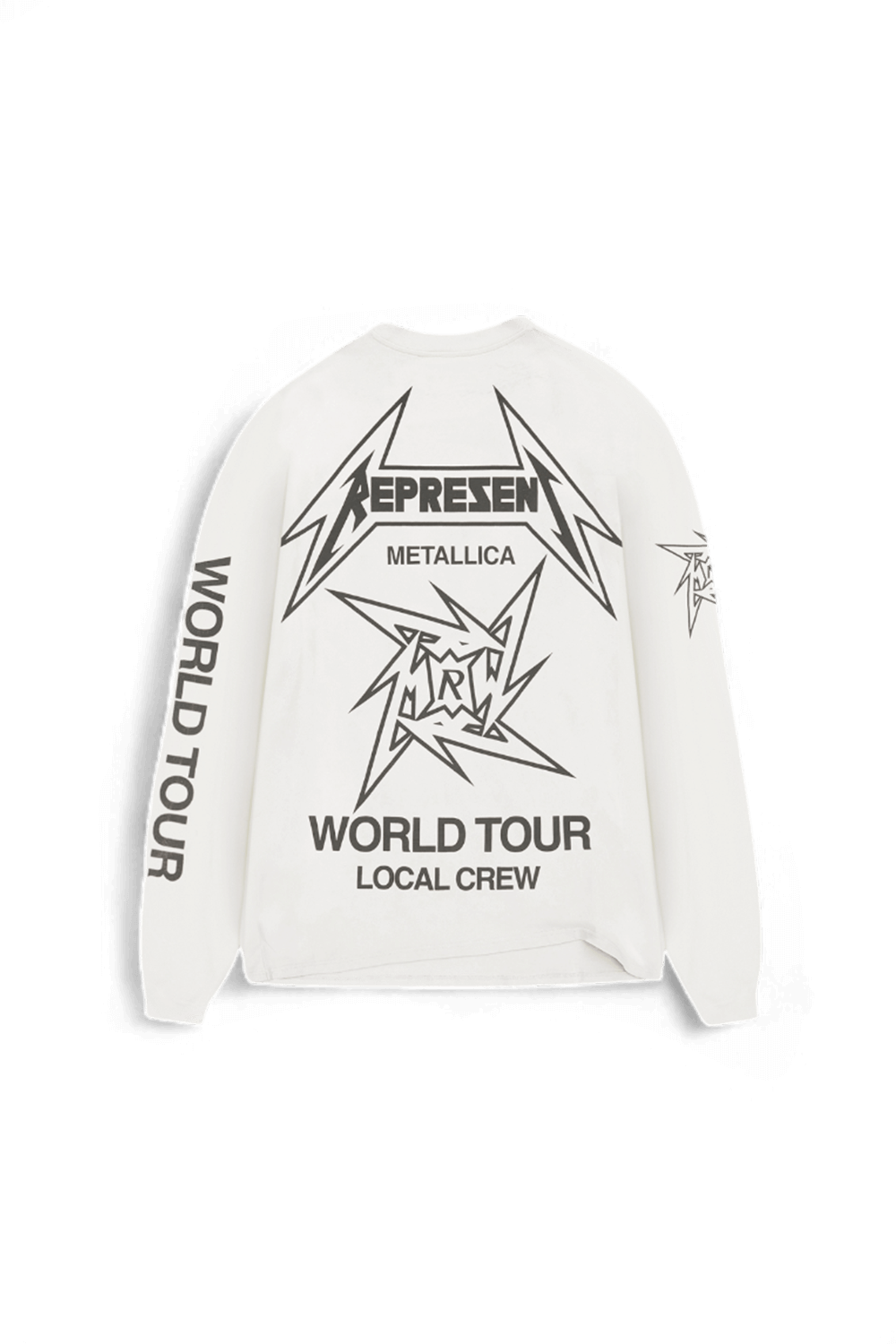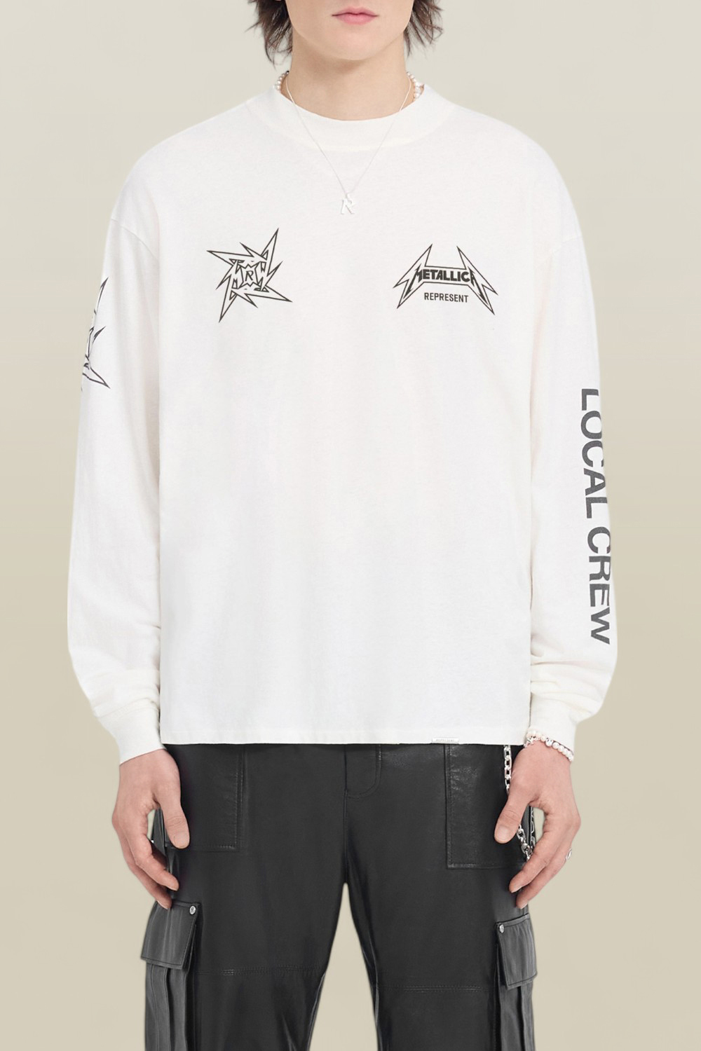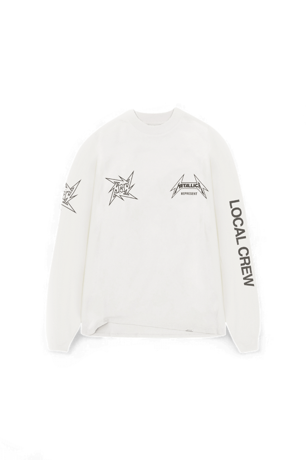 חולצת טי עם שרוולים ארוכים בגזרת אוברסייז מתוך קולקציית Represent X Metallica. היא עשויה כותנה אורגנית בצבע לבן, עם הדפס החוגג 40 שנה ללהקה.