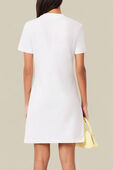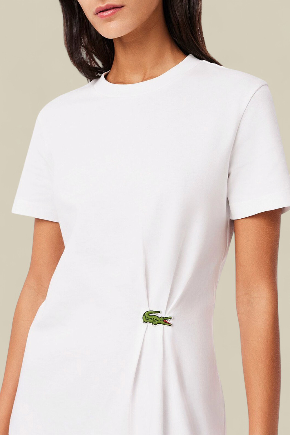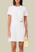 שמלת הטי הזו מבית Lacoste היא פרשנות אלגנטית לפריט בסיס נשי קלאסי. היא עשויה מג'רזי כותנה עבה ואיכותית בצבע לבן, עם אפקט נשפך מעודן המעוצב בקפידה – מוחזק במקומו על־ידי לוגו התנין הרקום באזור הירכיים.