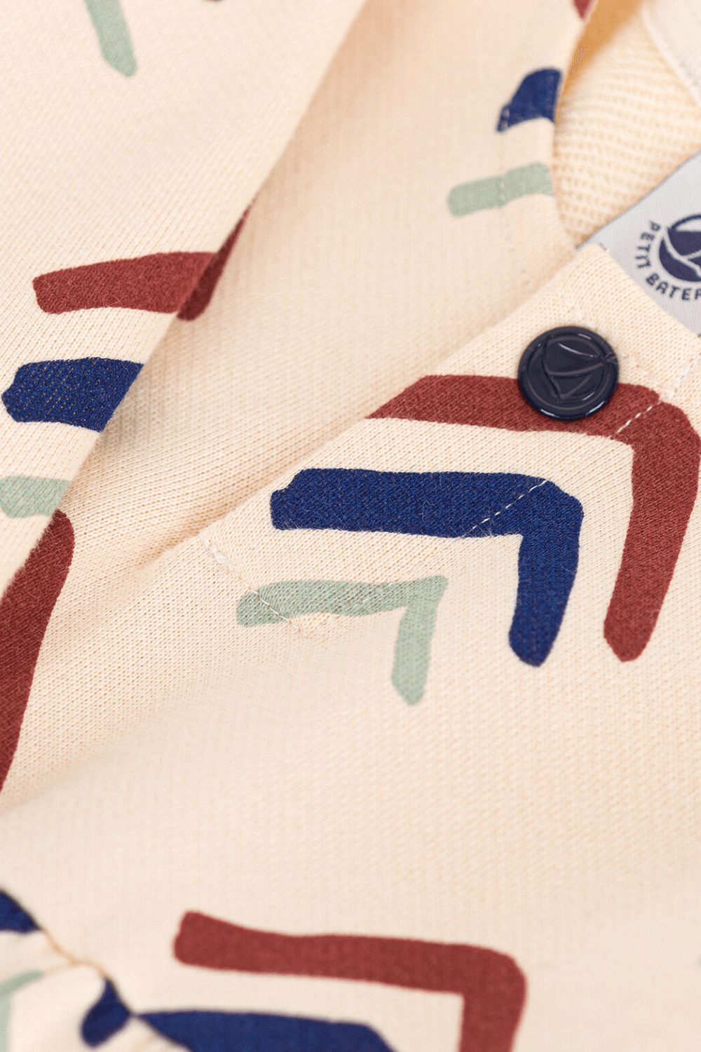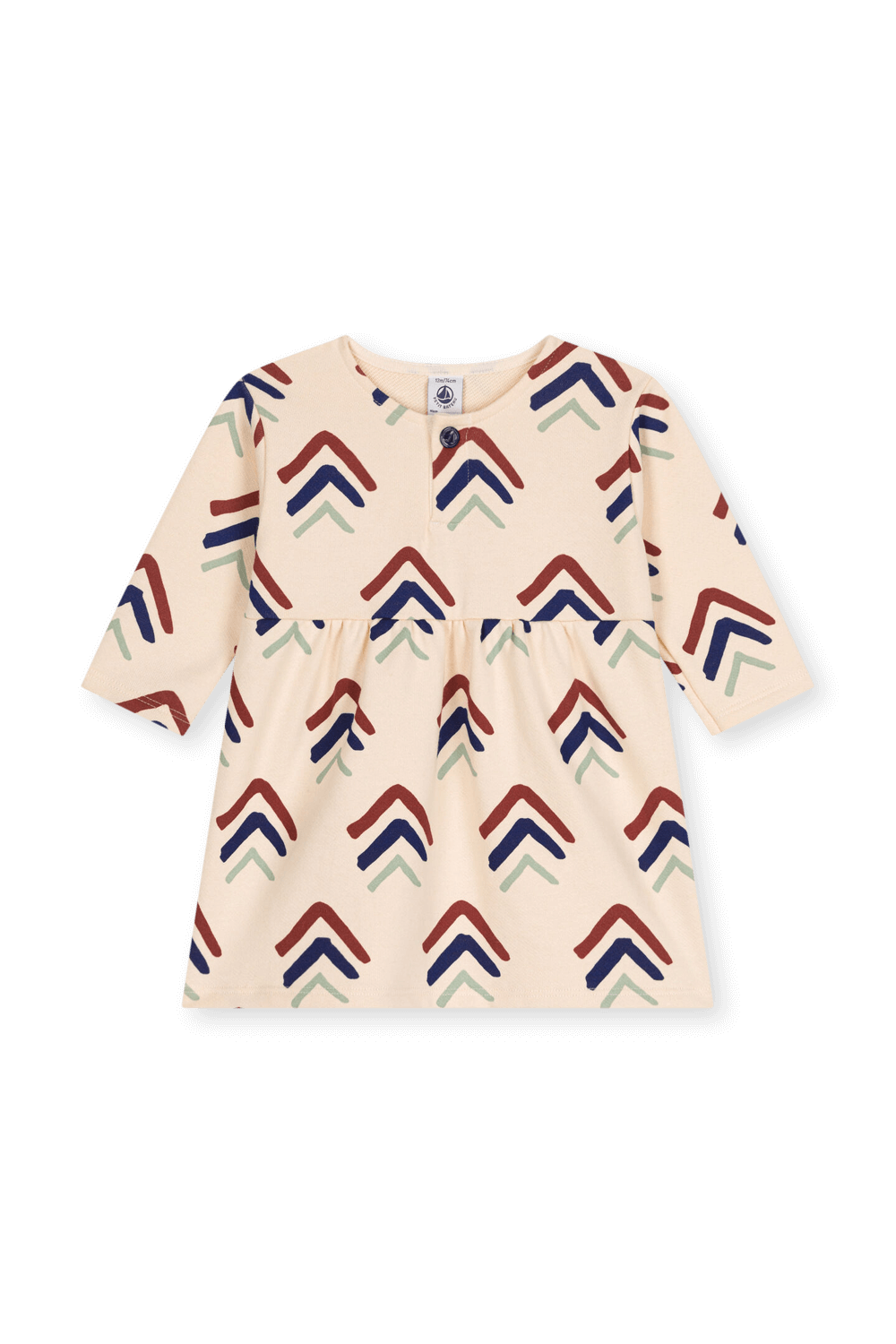 שמלה מבית Petit Bateau, עשויה כותנה אורגנית בצבע בז', עם הדפס חיצים מתוק בהשראת משחק חפש את המטמון. לשמלה כפתור קדמי להלבשה קלה ונוחה.