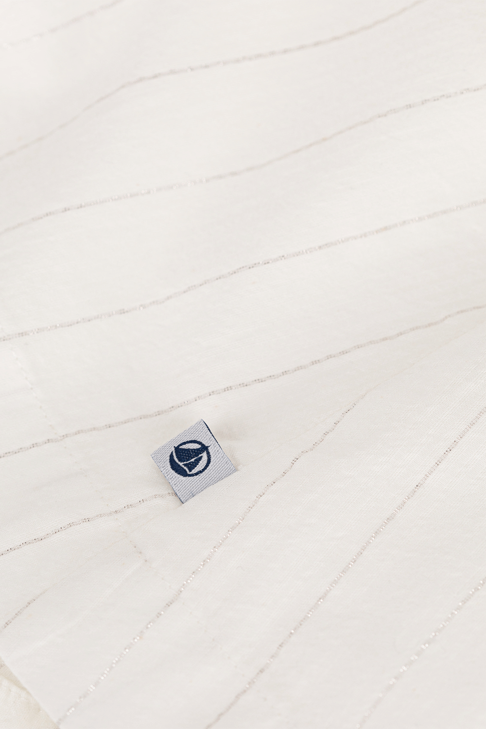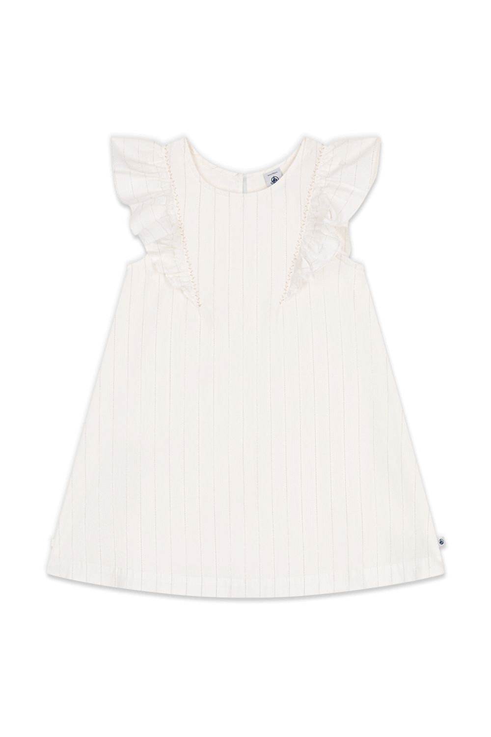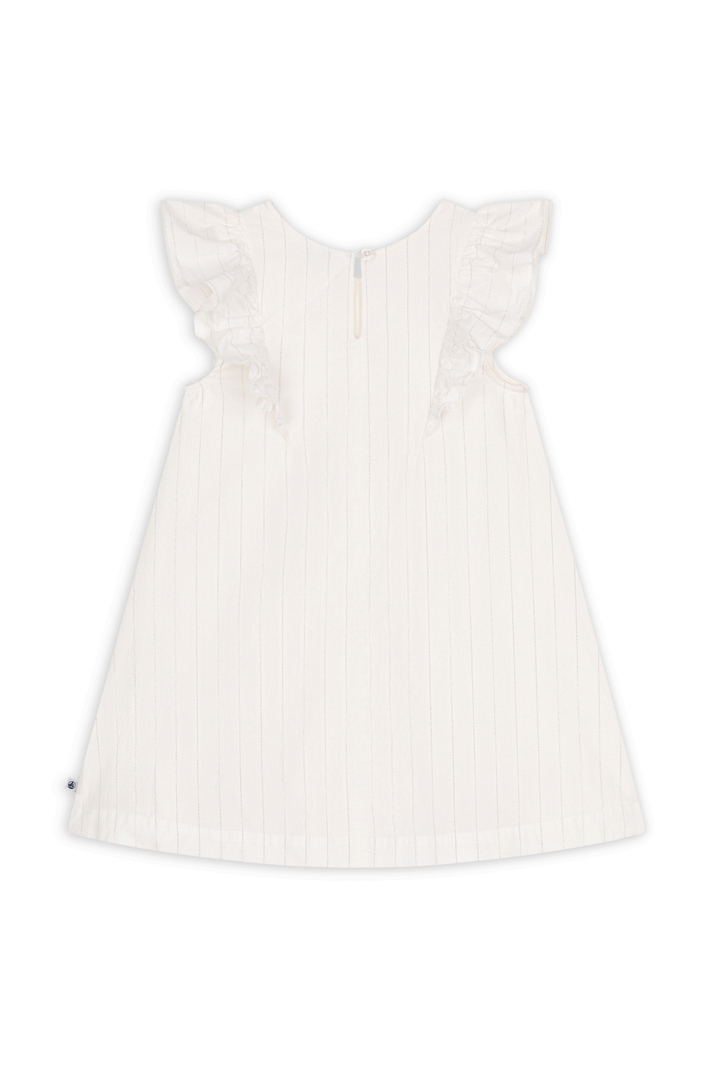 שמלה חגיגית מבית Petit Bateau, עשויה כותנה עם חוטים מטאליים יפים, עם בטנה ובעיצוב מלמלה בשרוולים. נסגרת מאחור בכפתור.