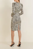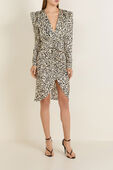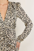 שמלת Amara מבית Ronny Kobo, עשויה תערובת משי בהדפס זברה עם מחשוף V ודוגמת כיווצים מלפנים. נסגרת מאחור ברוכסן נסתר.