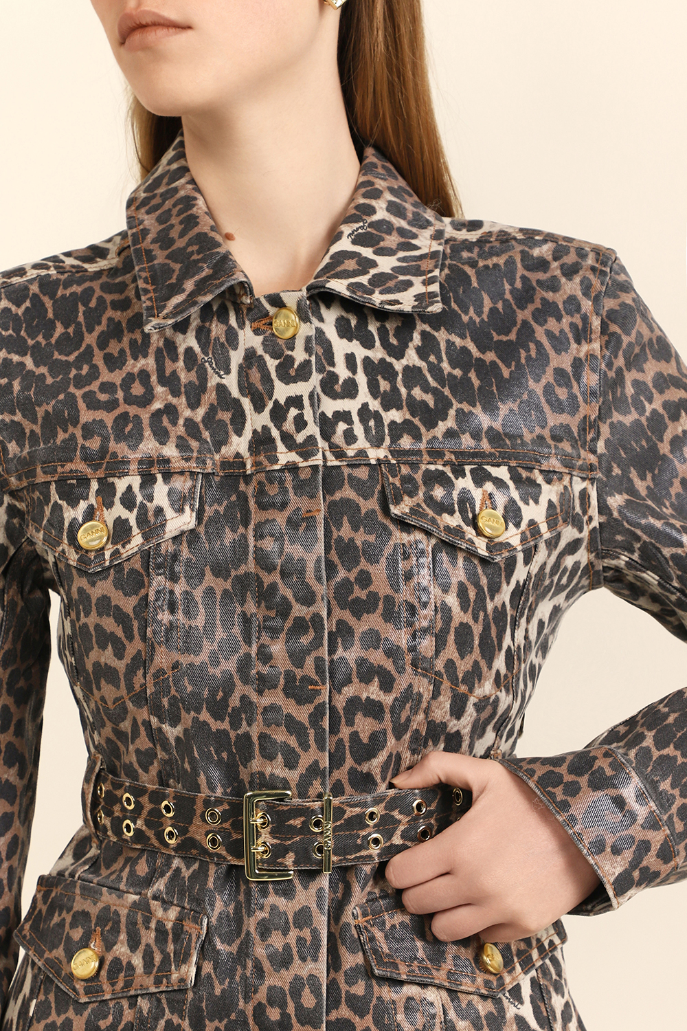 שמלת מיני מבית Ganni, עשויה כותנת דנים אורגנית בהדפס מנומר, בציפוי שעווה מפוליאסטר ממוחזר. השמלה מעוצבת בגזרת A ויש לה ארבעה כיסים קדמיים ובסגירת כפתורים זהובים מעוצבים.
