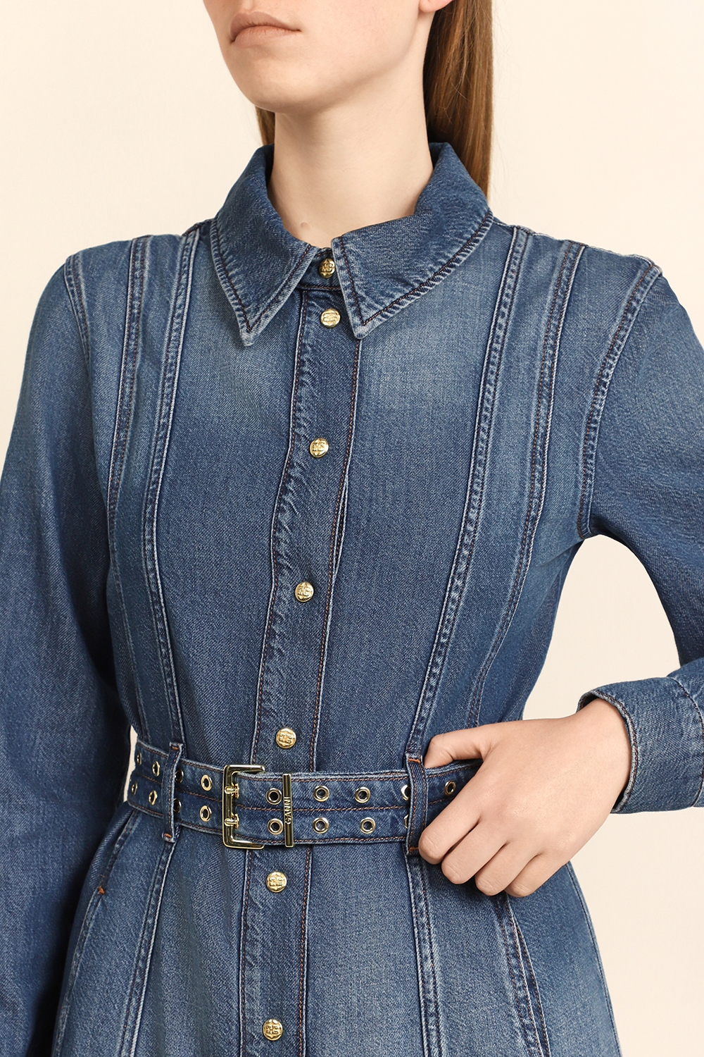 שמלת ג'ינס בגובה מקסי מבית Ganni, עשויה כותנת דנים רכה וממוחזרת בצבע כחול, בשילוב ליוסל טבעי מעץ האקליפטוס. לשמלה גזרה מעט צרה יותר במותניים, היא נסגרת בכפתורי תיק תק לכל אורכה ומגיעה עם חגורה תואמת.