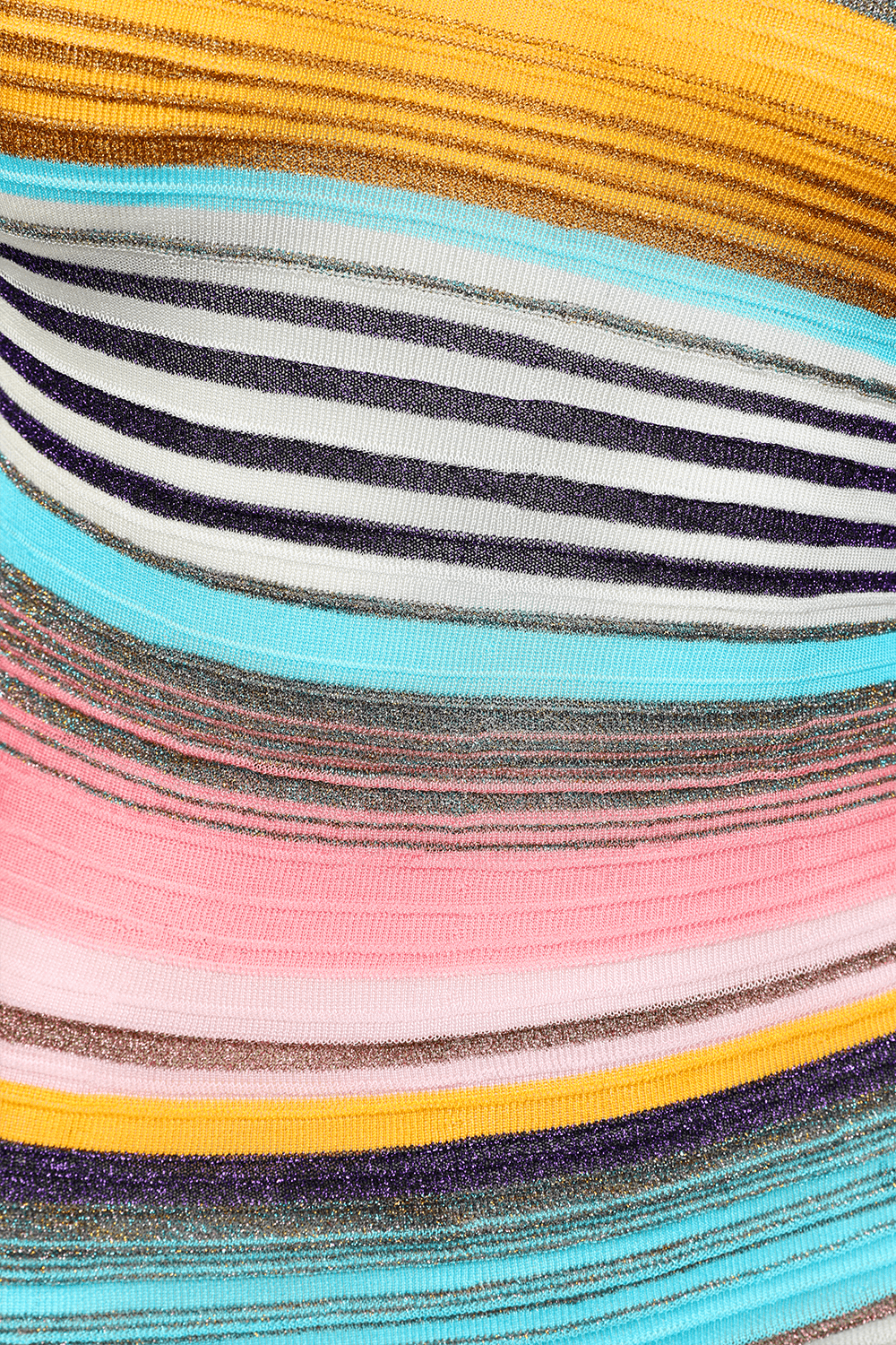 בית האופנה האיטלקי MISSONI נחשב לאחד המובילים בעולם בזכות שדרוג הסגנון הבוהמייני לרמה מדויקת ויוקרתית. זוהי שמלת חוף באורך מיני העשויה טקסטיל אוורירי וסמי שקוף עם סריגת פסים אלכסוניים בצבעוניות קיצית וססגונית. לפריט גזרה א-סיטרית בעלת שרוול אחד אשר מעניקה לו אקסטרה סטייל מודרני וייחודי.