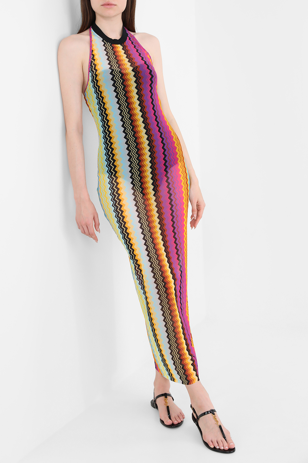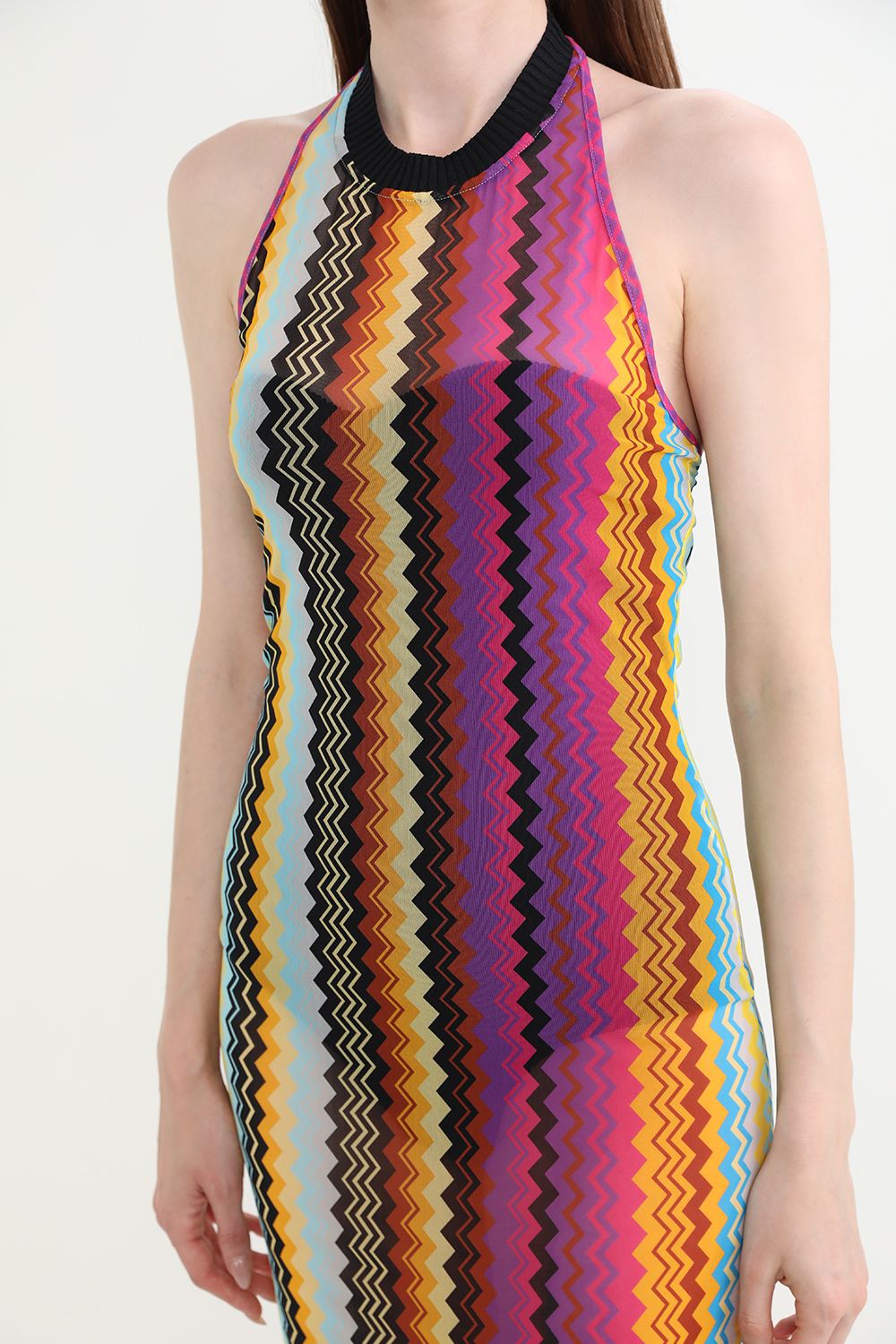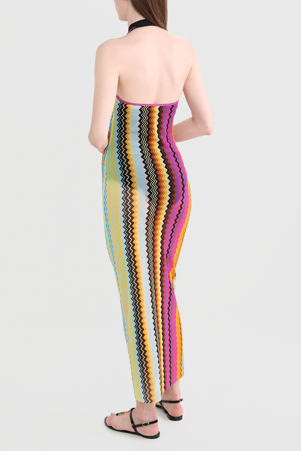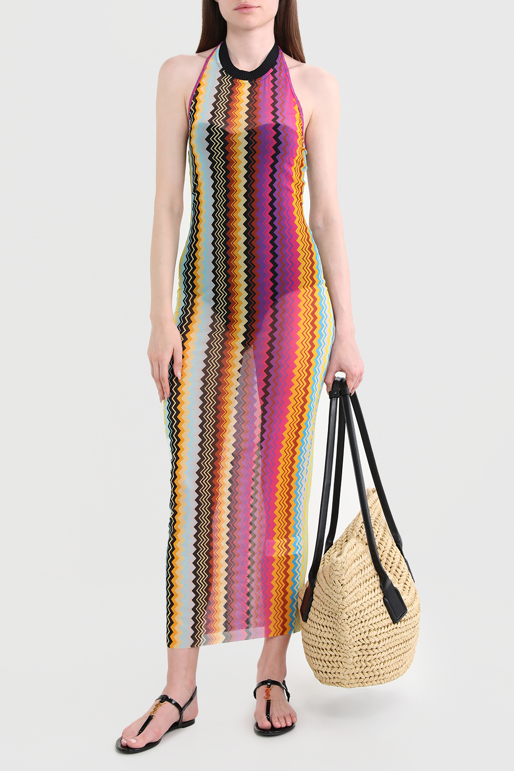 שמלת חוף מבית Bottega Veneta. השמלה עשויה מפוליאסטר סטרצ'י צבעוני ומעט שקוף. ניתן ללבוש את השמלה כשמלת חוף מעל לבגד ים וגם כשמלה קייצית בשילוב סנדלים.