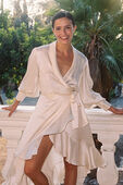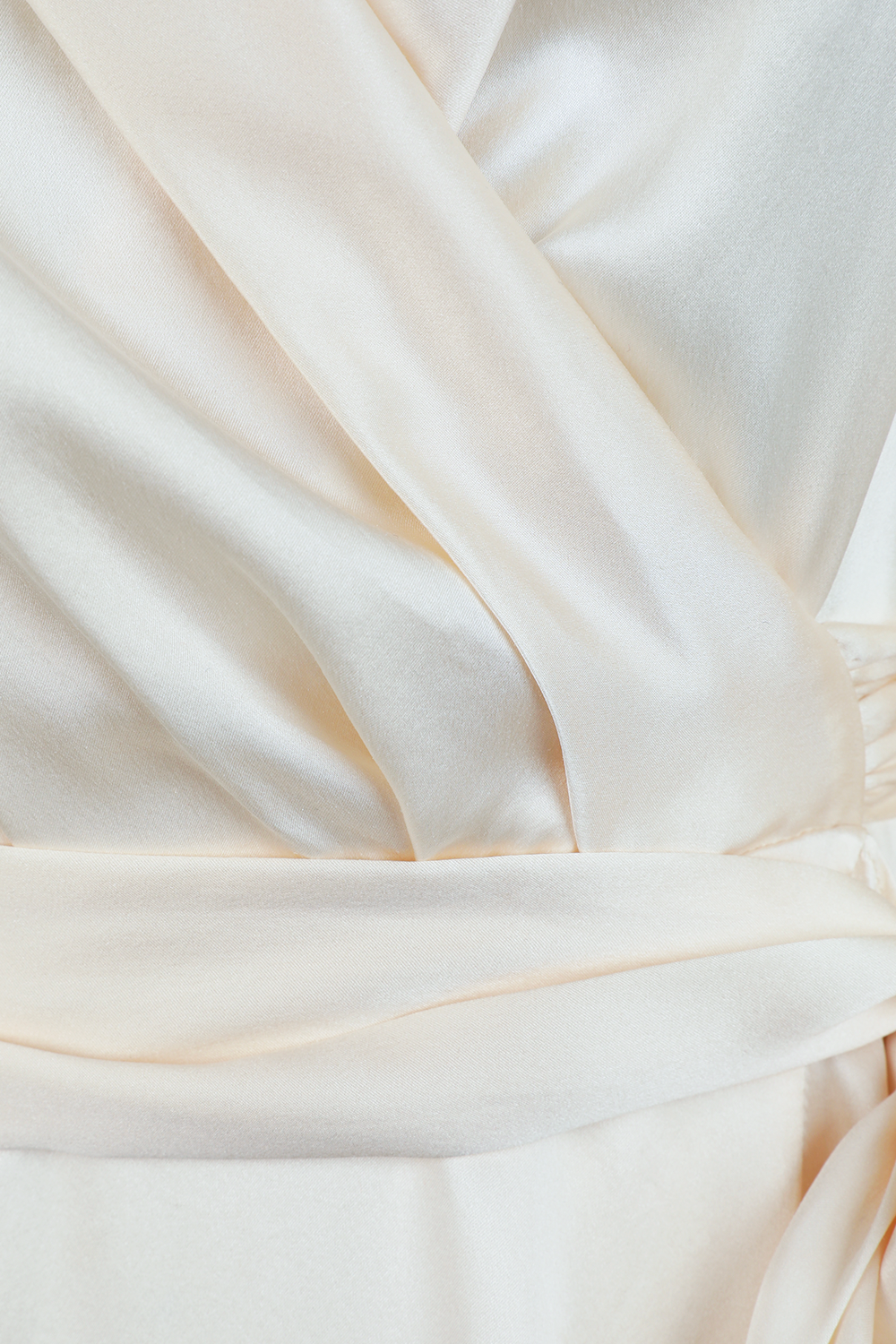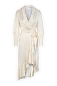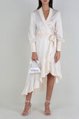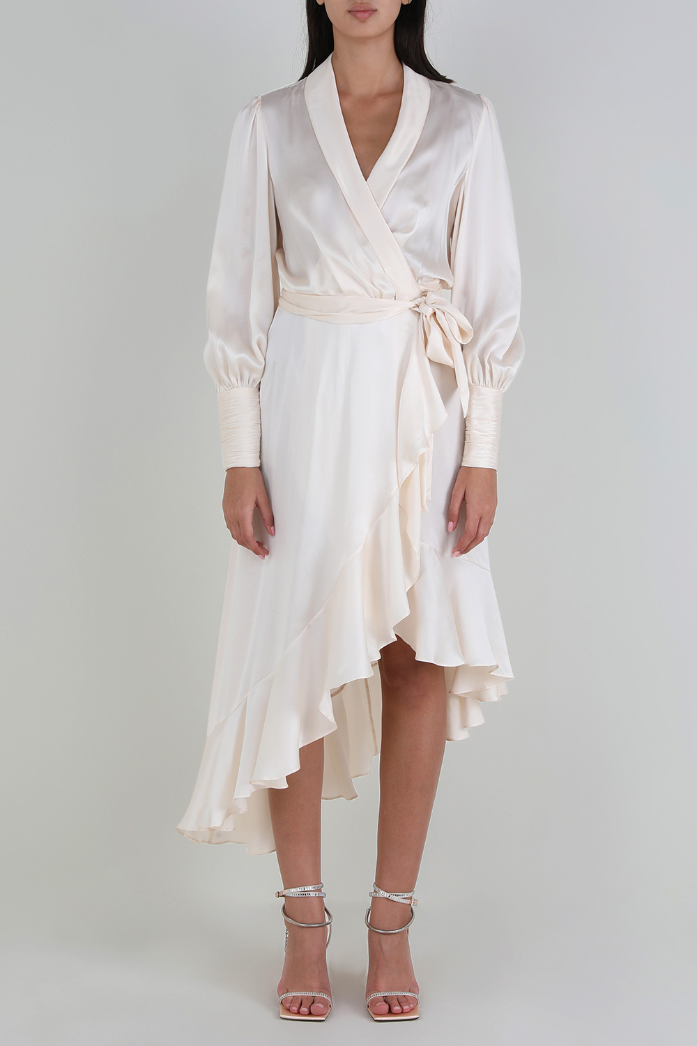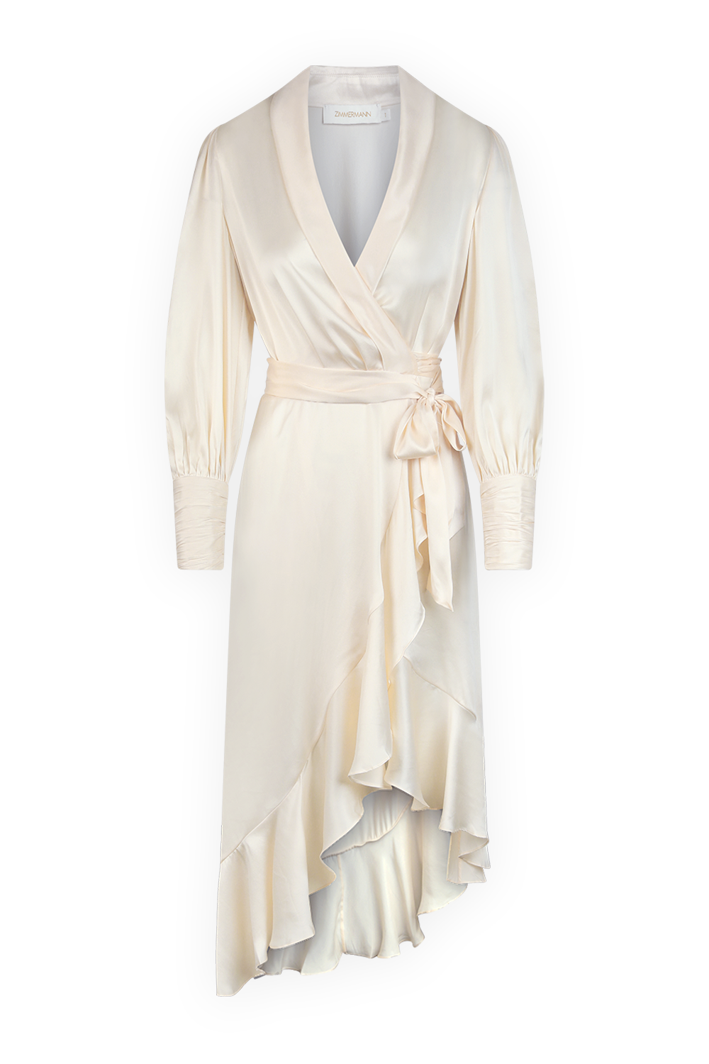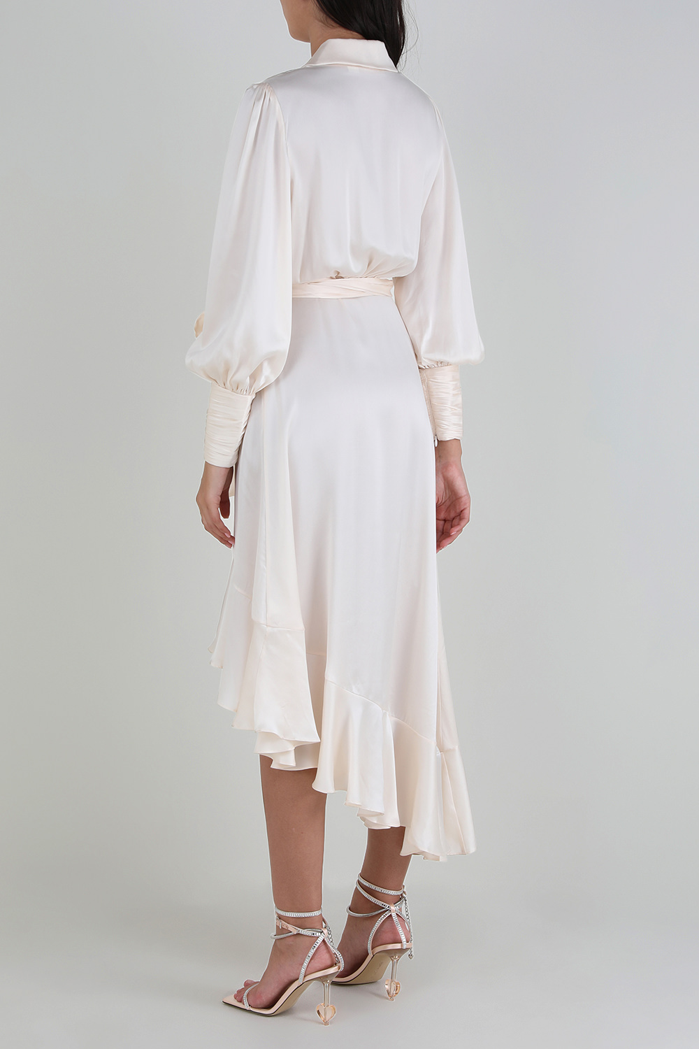 שמלת מידי בעיצוב בית האופנה האוסטרלי הרותח Zimmerman העשויה בד משי משובח בגוון שמנת ובגימור מבריק. לפריט גזרת מעטפת רומנטית עם חגורה נקשרת ושרוולים ארוכים ומעט תפוחים לסילואט נשי ועתיר סטייל.