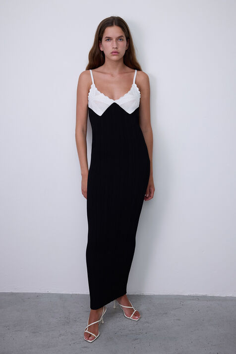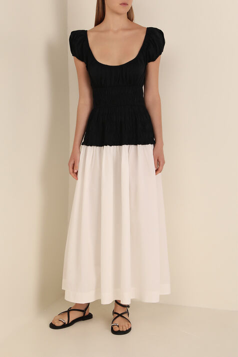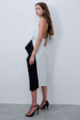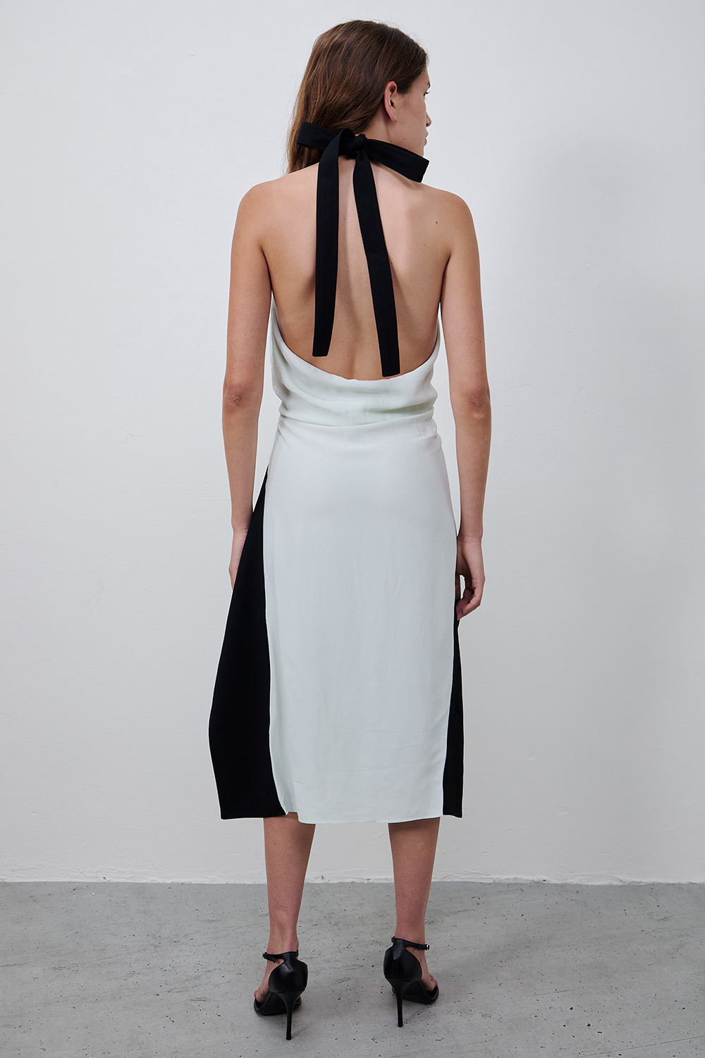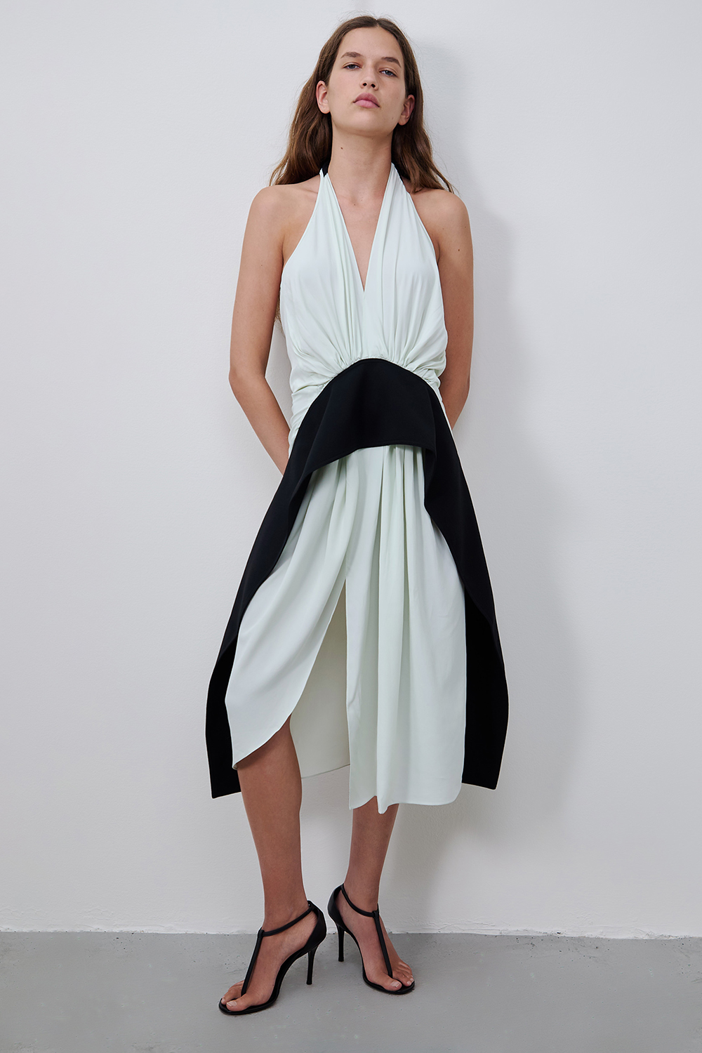 שמלת Piera מבית 16Arlingto, היישר ממסלול התצוגה לאביב-קיץ 2025. היא עשויה ויסקוזה בצבע ירוק בהיר עם פאנל רחב בצבע שחור הממוקם בצדדים, ובטנה נעימה. העיצוב בגזרה משוחררת כולל מחשוף V עמוק הנקשר בסרט הולטר שחור מסביב לצוואר, גומי פנימי במותניים ושסע קטן מלפנים.