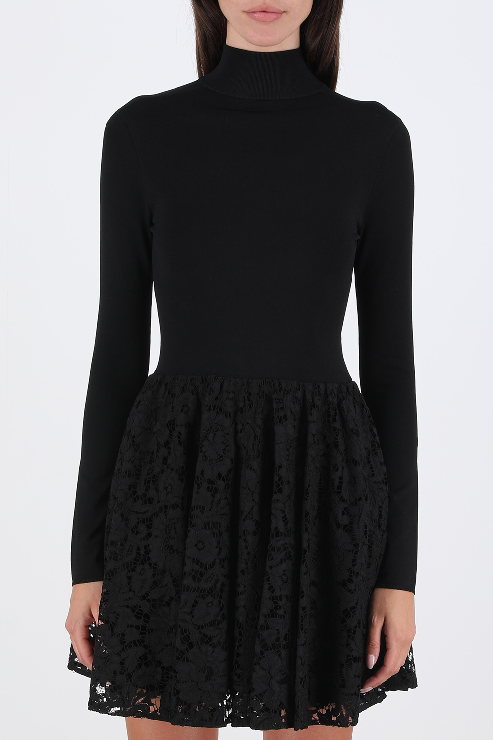 שמלה מיני שחורה וחושנית מבית אופנת העל האיטלקי ולנטינו. השמלה תפורה מתערובת ויסקוזה איכותית המעוצבת במראה של חולצה ארוכה וצמודה עם צווארון גבוה בשילוב חצאית מיני עם עיטורי תחרה במראה אטום לכדי צללית אולטרה מחמיאה הנאספת במותן לצד אמרת תחרה שקופה ובחיתוך א-סימטרי. לשמלה סגירת רוכסן קדמית החותמת את עיצובה האלגנטי - מדובר בפריט לוהט ומסובב ראשים שישיג לך מקסימום שיק ממש ברגע.