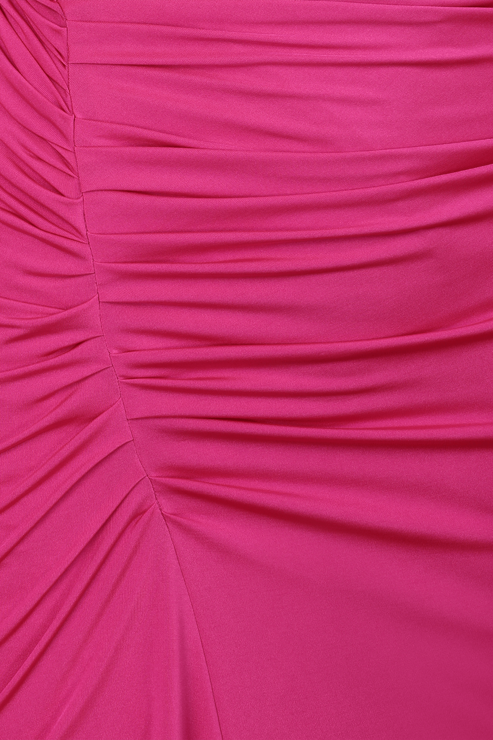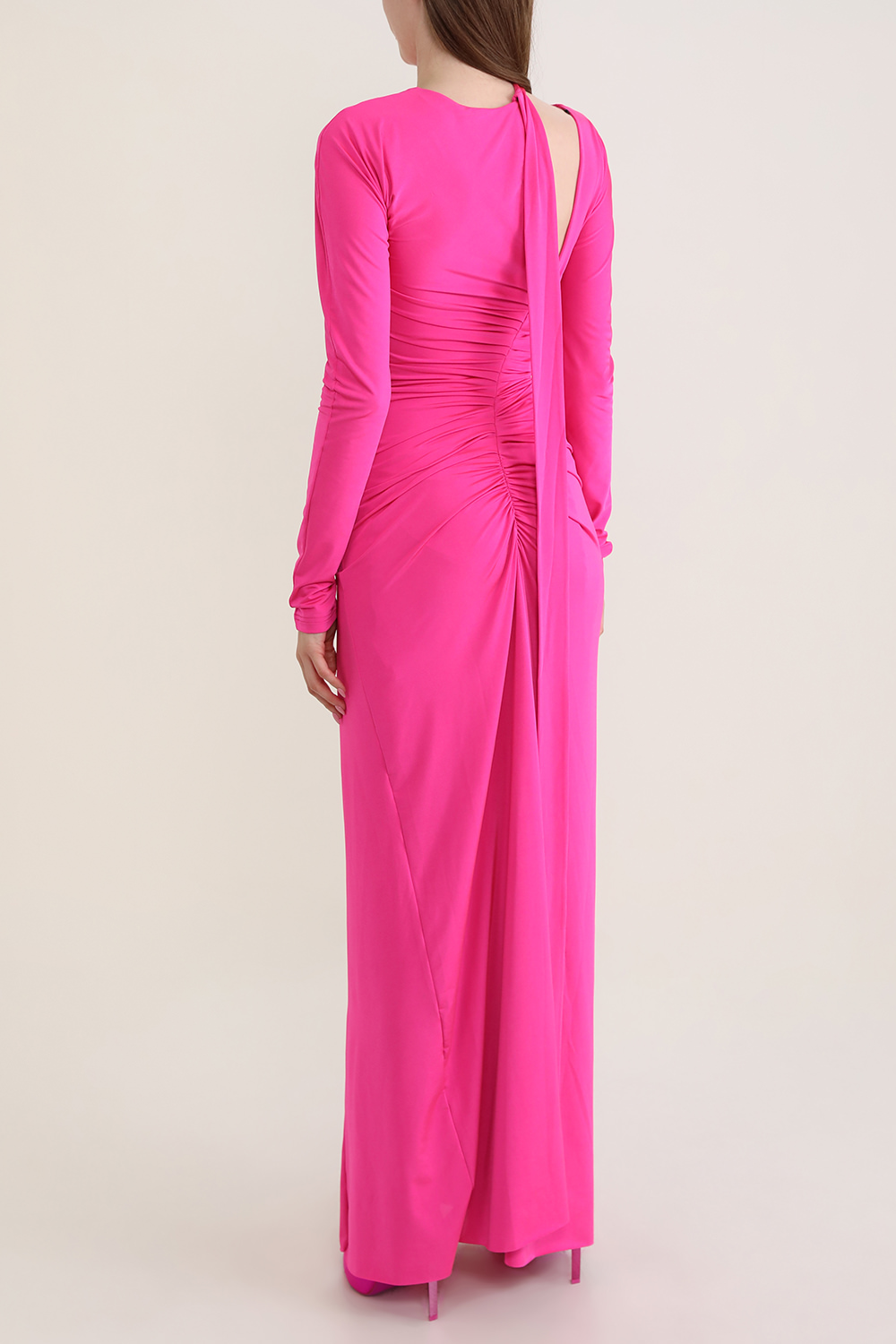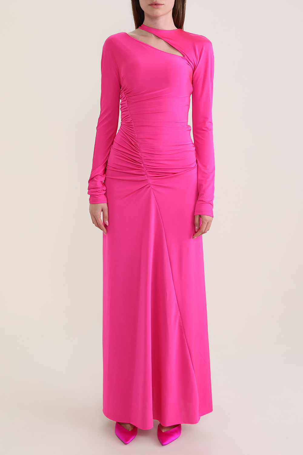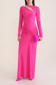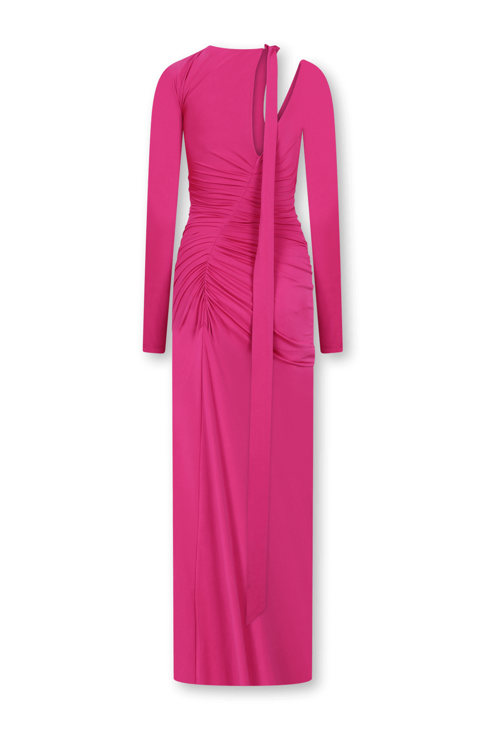"שמלת מקסי מבית האופנה Victoria Beckham, העשויה מבד ג`רזי איכותי בגוון ורוד פוקסיה עם כיווצים בולטים באזור המותניים לכדי גזרת סלים מחמיאה עם שרוולים ארוכים ומחשוף א-סימטרי באזור החזה."