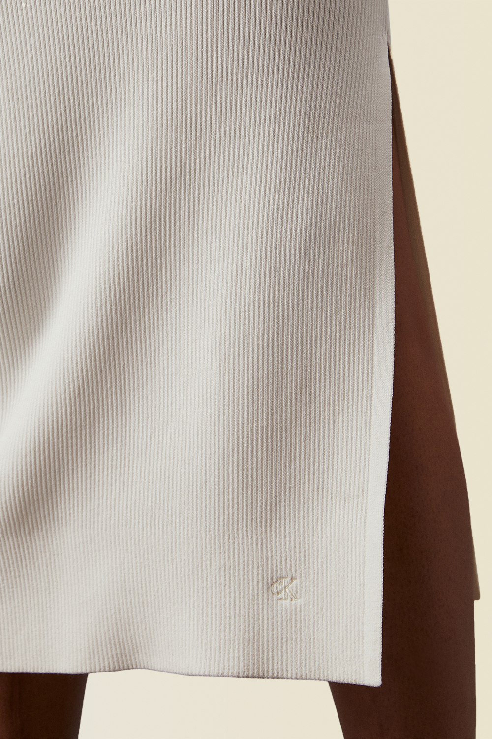 שמלת סריג מבית Calvin Klein עשויה בד ויסקוזה סטרצ'י, צמוד ומחטב בצבע שנהב, בתוספת שסע קטן.