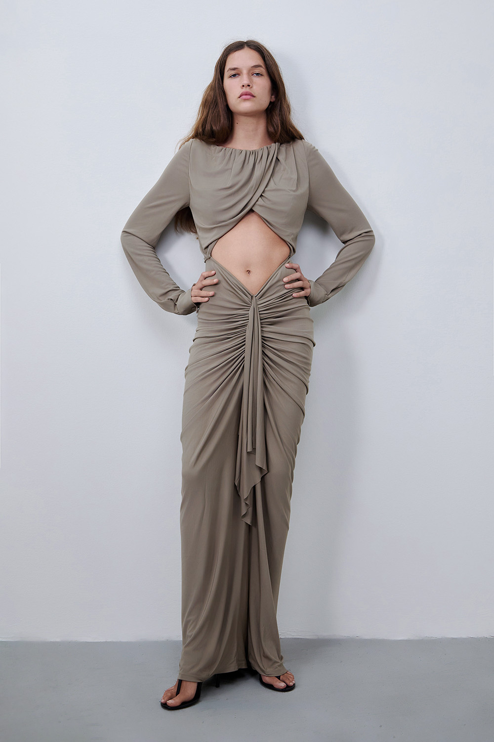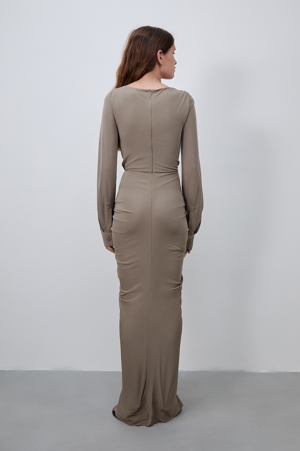 שמלת Bateau Drape Disconnect בעיצוב מרשים ויוצא דופן מבית Christopher Esber, עשויה ויסקוזה בצבע חאקי. לשמלה מראה מתוחכם ומעניין, אך בעיצוב גאוני, קל ונוח ללבישה - ללא קשירות, עם רוכסן נסתר בגב וחיתוך קאט אאוט מלפנים.