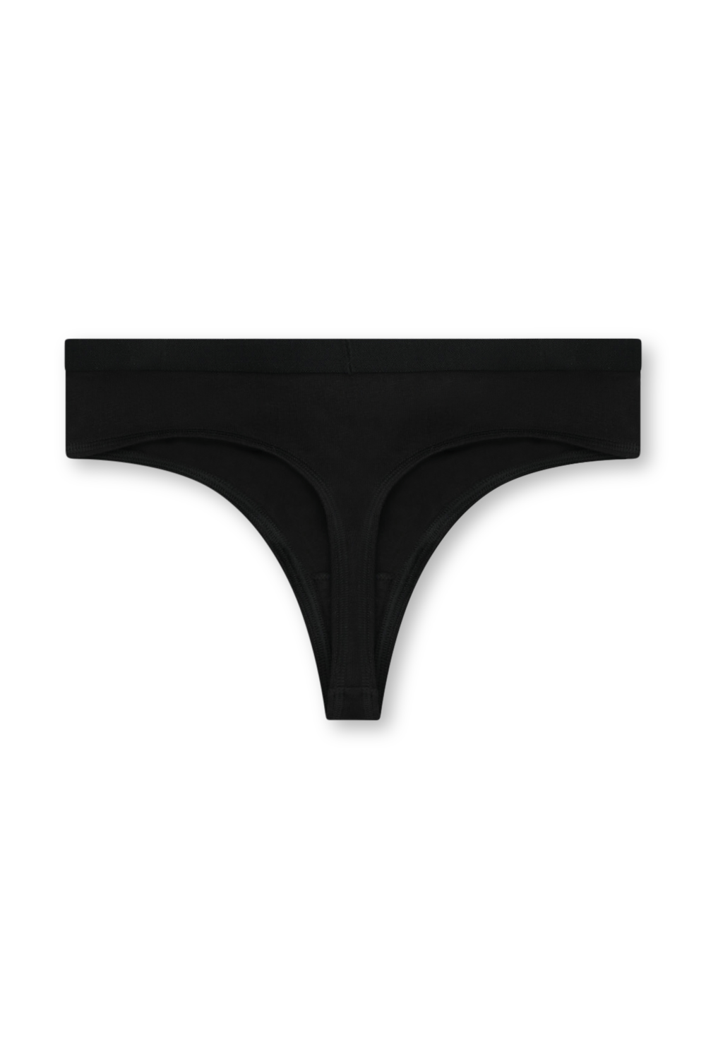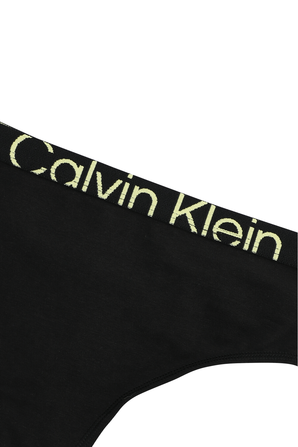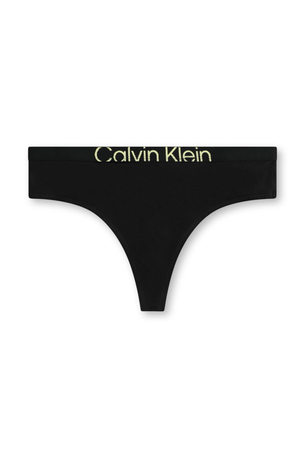 תחתוני חוטיני מבית Calvin Klein, עשויים כותנה ואלסטן בצבע שחור עם לוגו המותג בחזית.