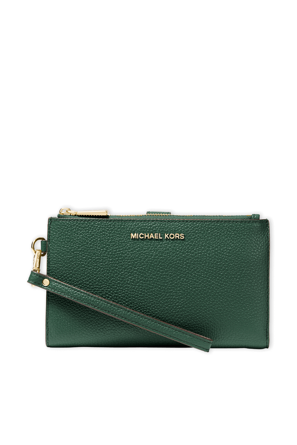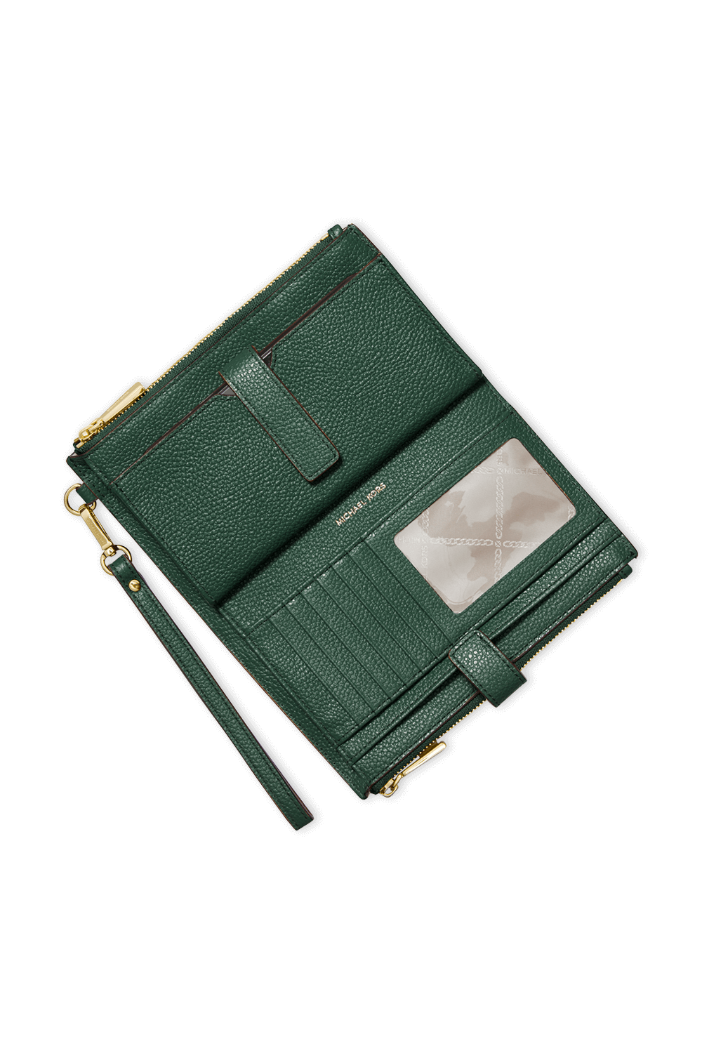 תיק ארנק מבית מייקל קורס האמריקאי. זהו דגם העשוי עור משובח בגוון ירוק. לפריט שלל חריצים למטבעות וכרטיסים והוא בעל צללית מלבנית עם סגירה מתקפלת. שם המותג החתום בגוון זהוב על החזית משלים את עיצובו העל זמני והשיקי של אקססורי זה.