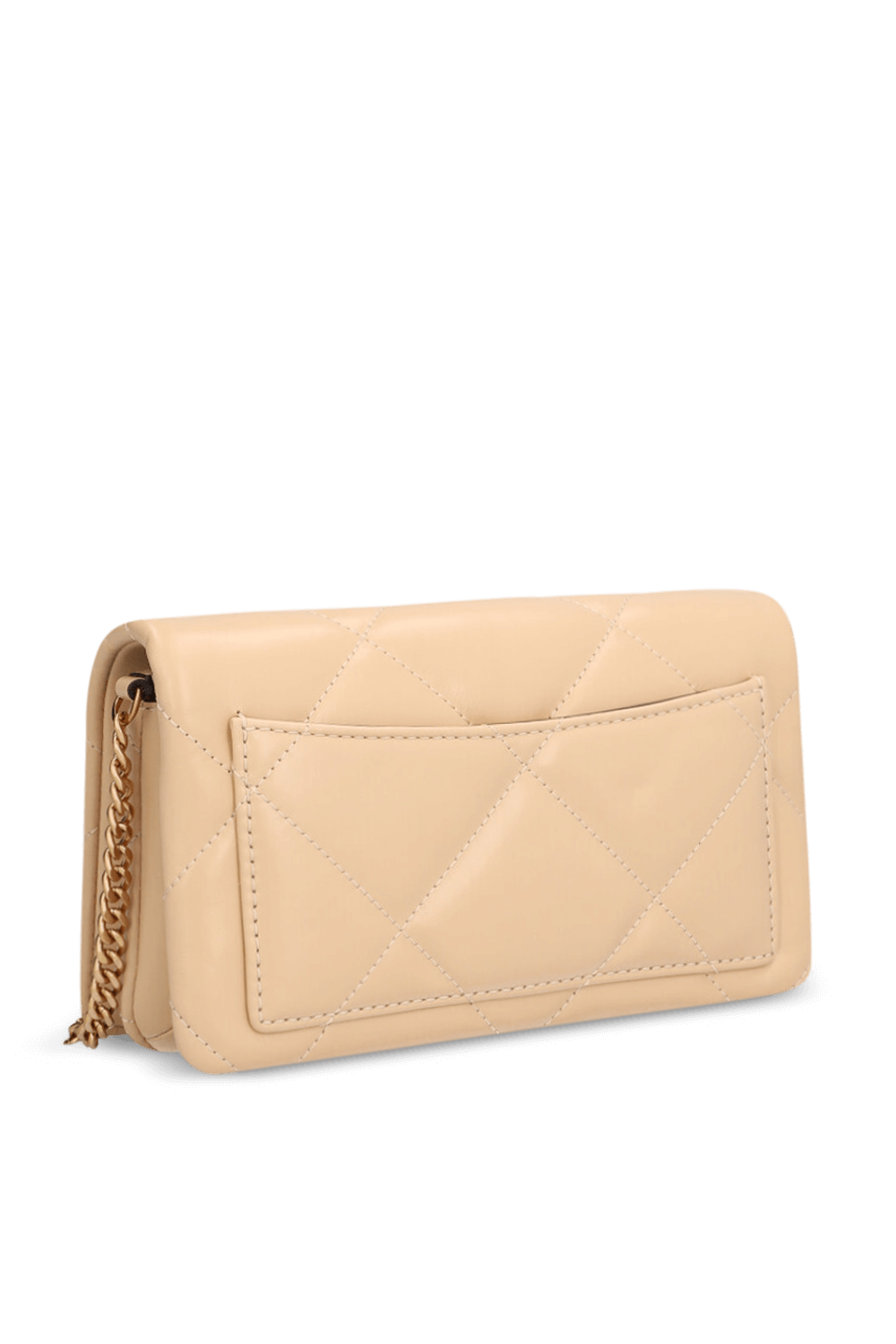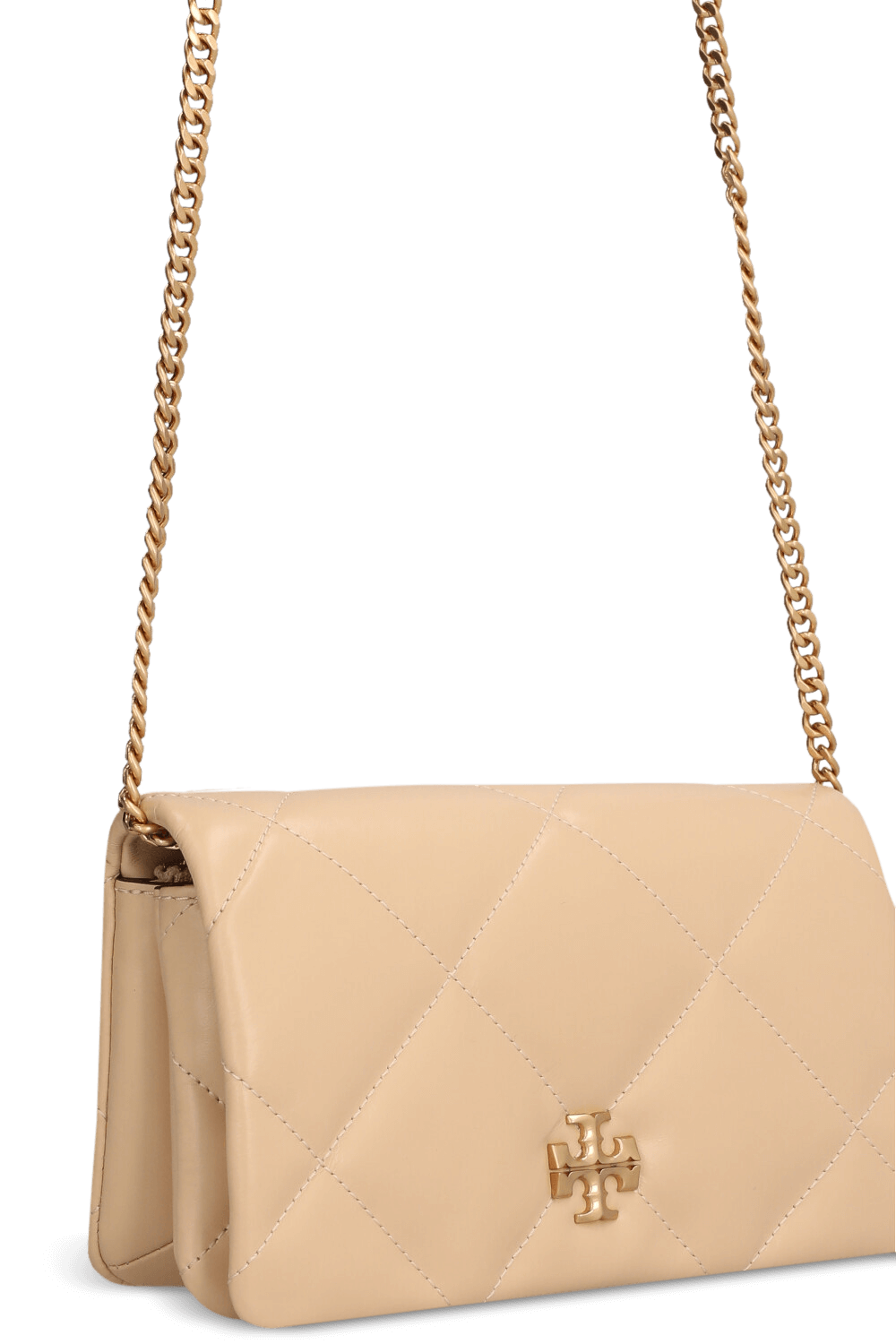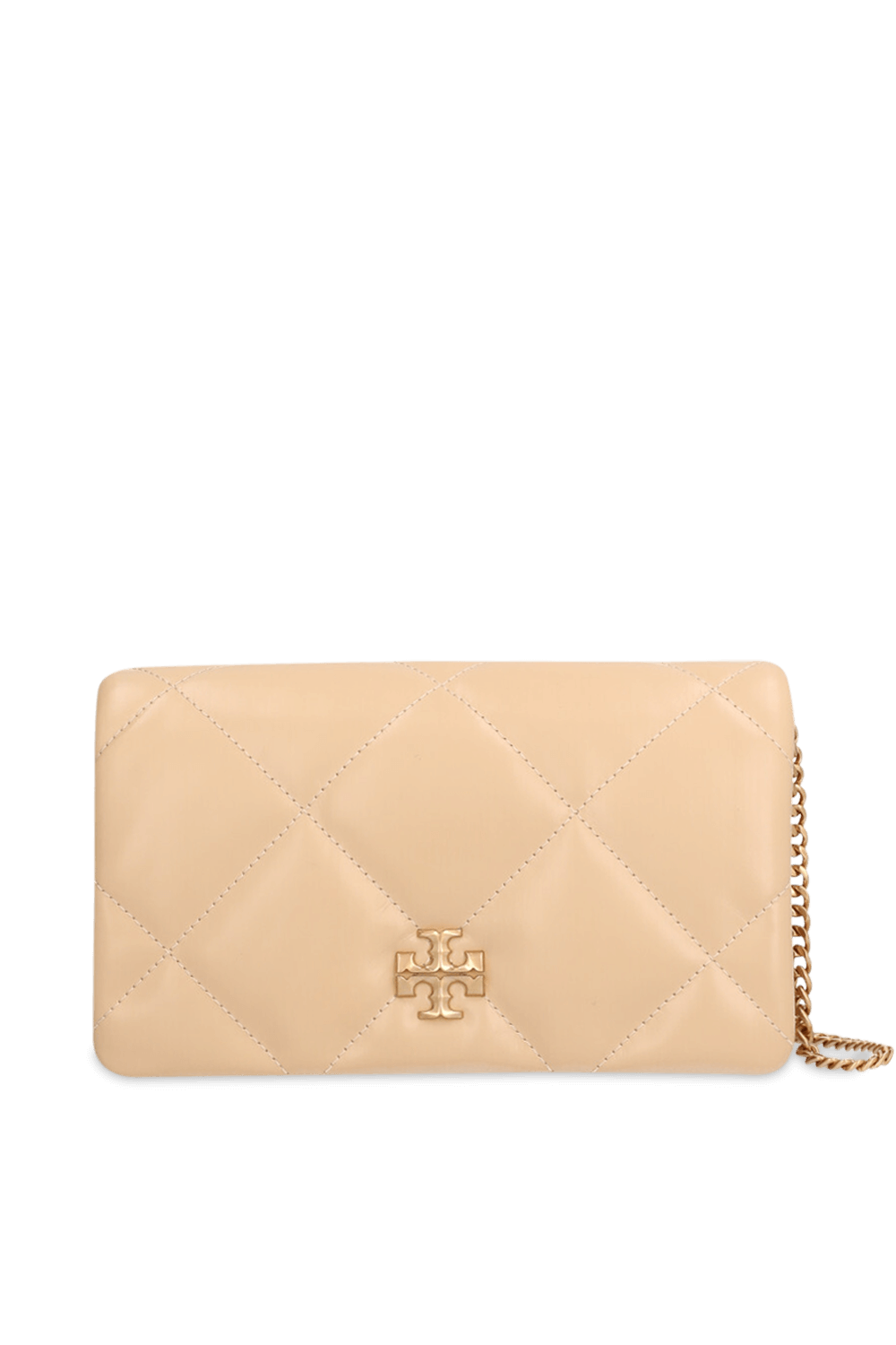 תיק ארנק Kira Diamond מבית Tory Burch, עשוי עור בצבע ניוד ובטכניקת קווילט יהלומים. יש לו תא מרכזי המחולק לשניים באמצעות תא הנסגר ברוכסן, שני חריצים לכרטיסים, וכיס חיצוני פתוח לשליפה מהירה של הטלפון. מגיע עם שרשרת נשיאה זהובה הניתנת להסרה, כך שאפשר לשאת אותו כקלאץ'. נסגר במגנט.