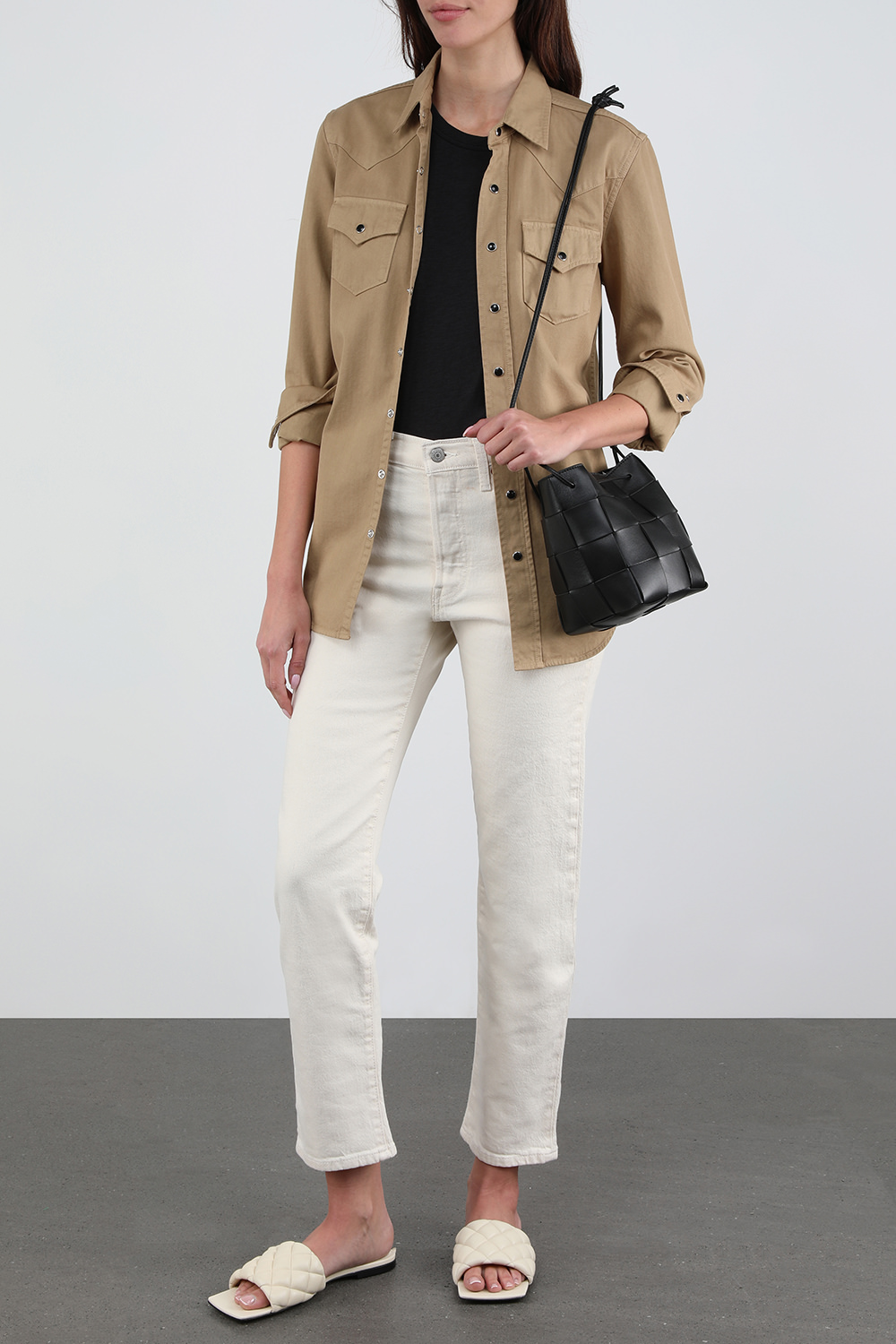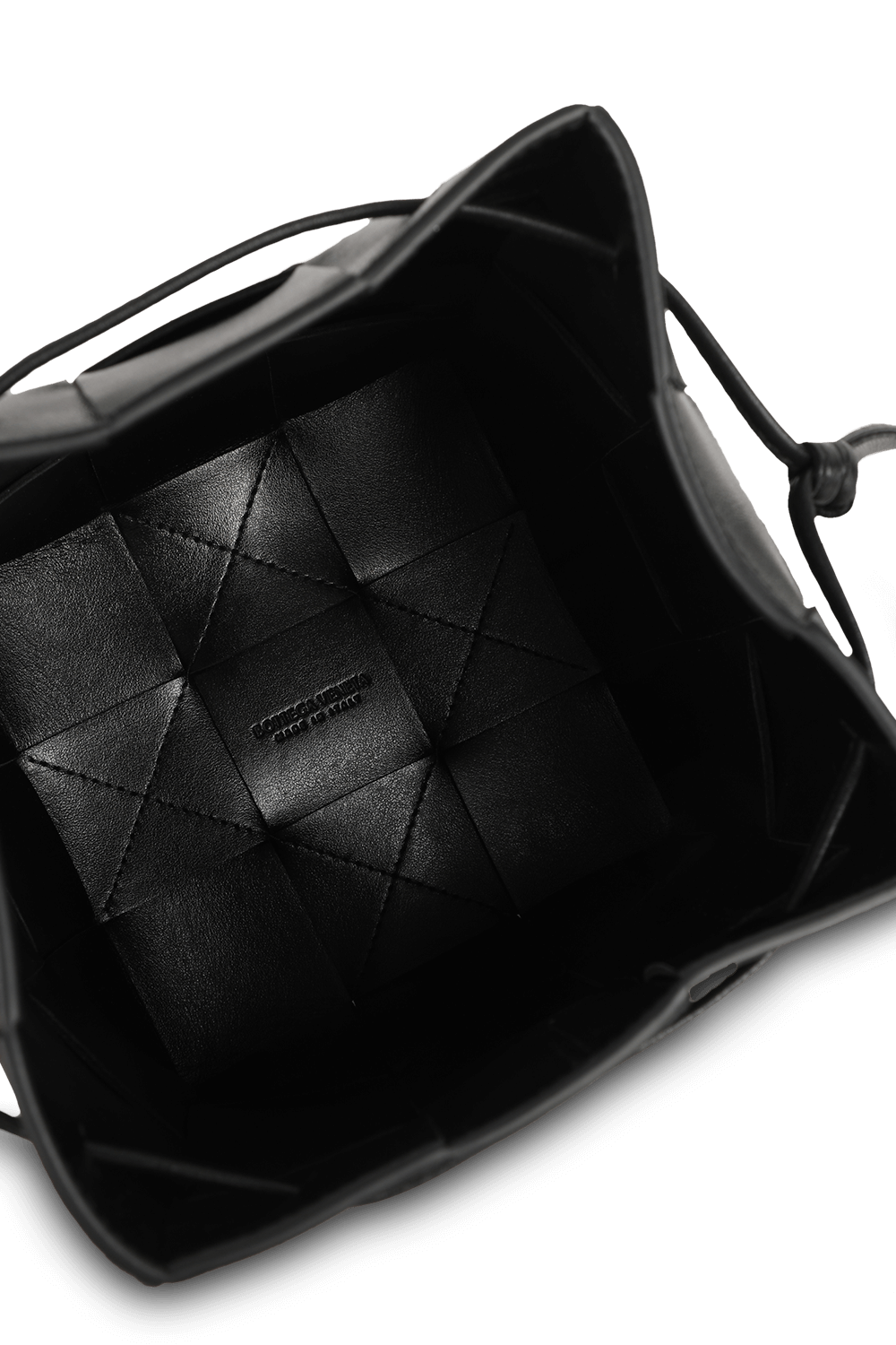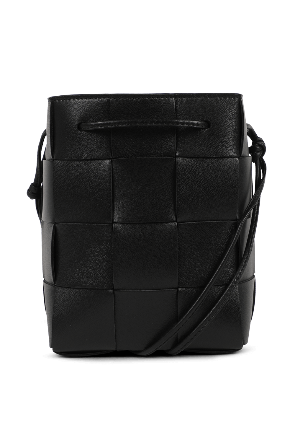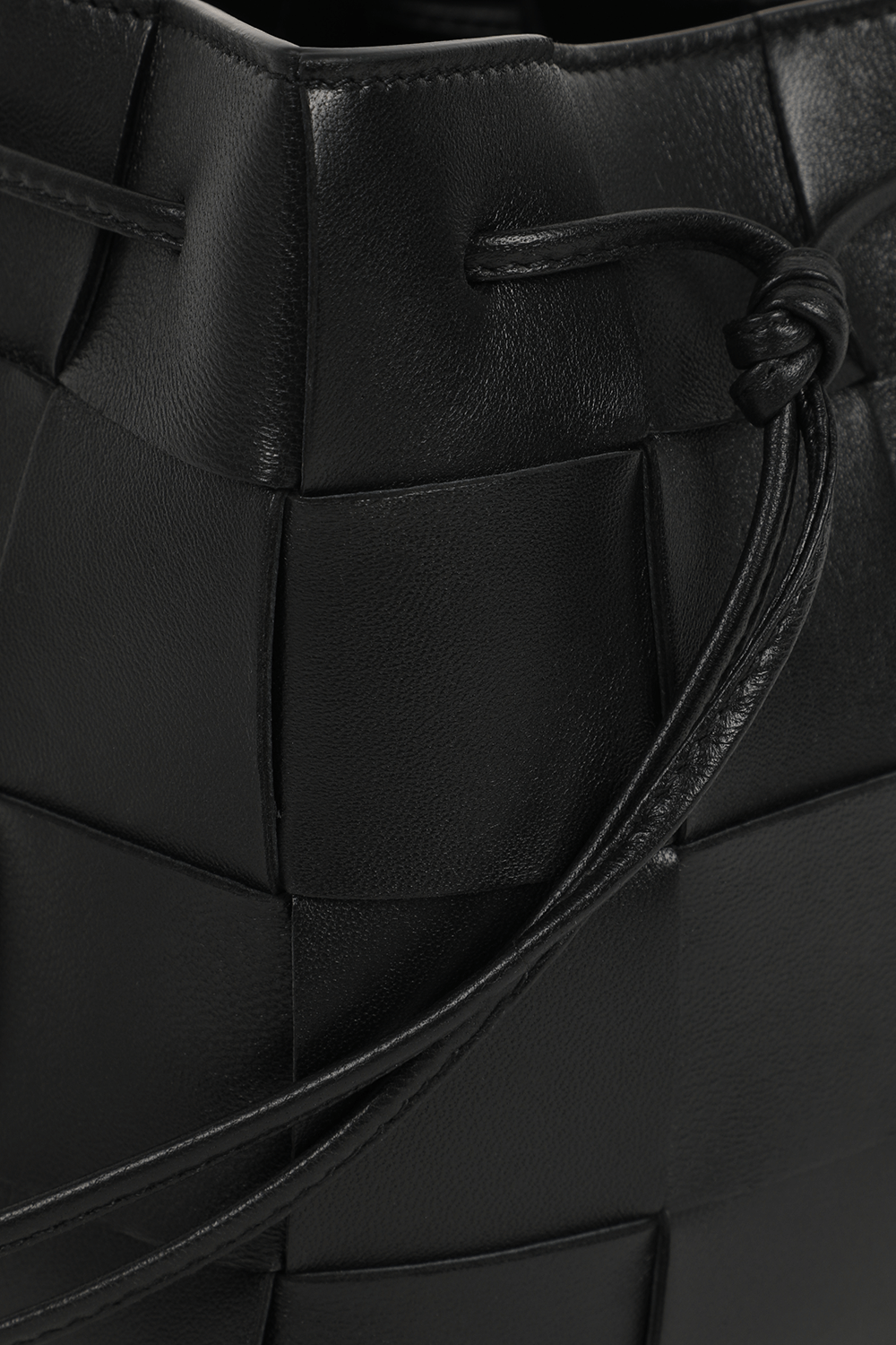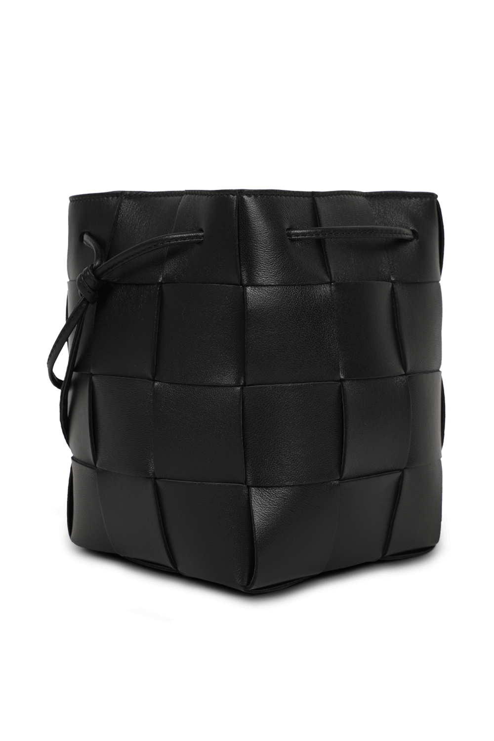 תיק באקט Cassette בגודל סמול מבית Bottega Veneta, תוצרת איטליה. הוא עשוי עור בצבע שחור, בדוגמת שתי וערב האייקונית של המותג ויש לו תא אחסון מרכזי בסגירת שרוך עור.