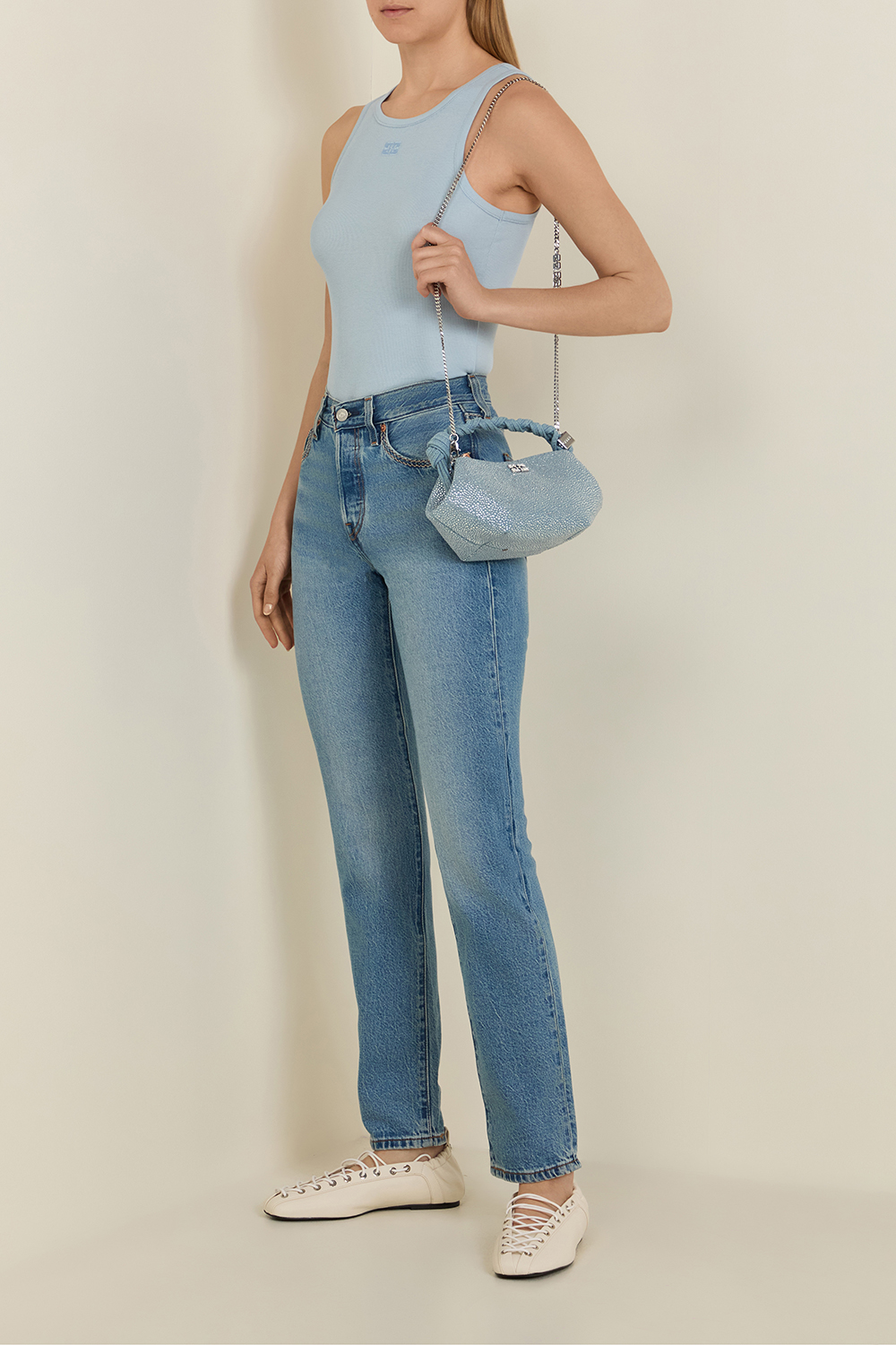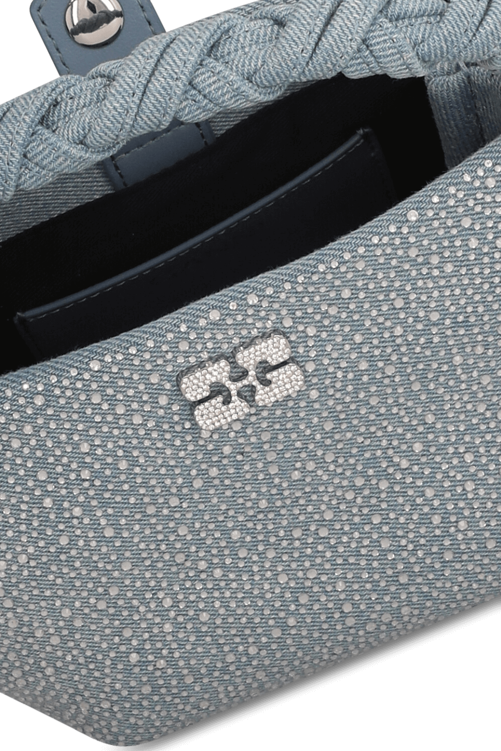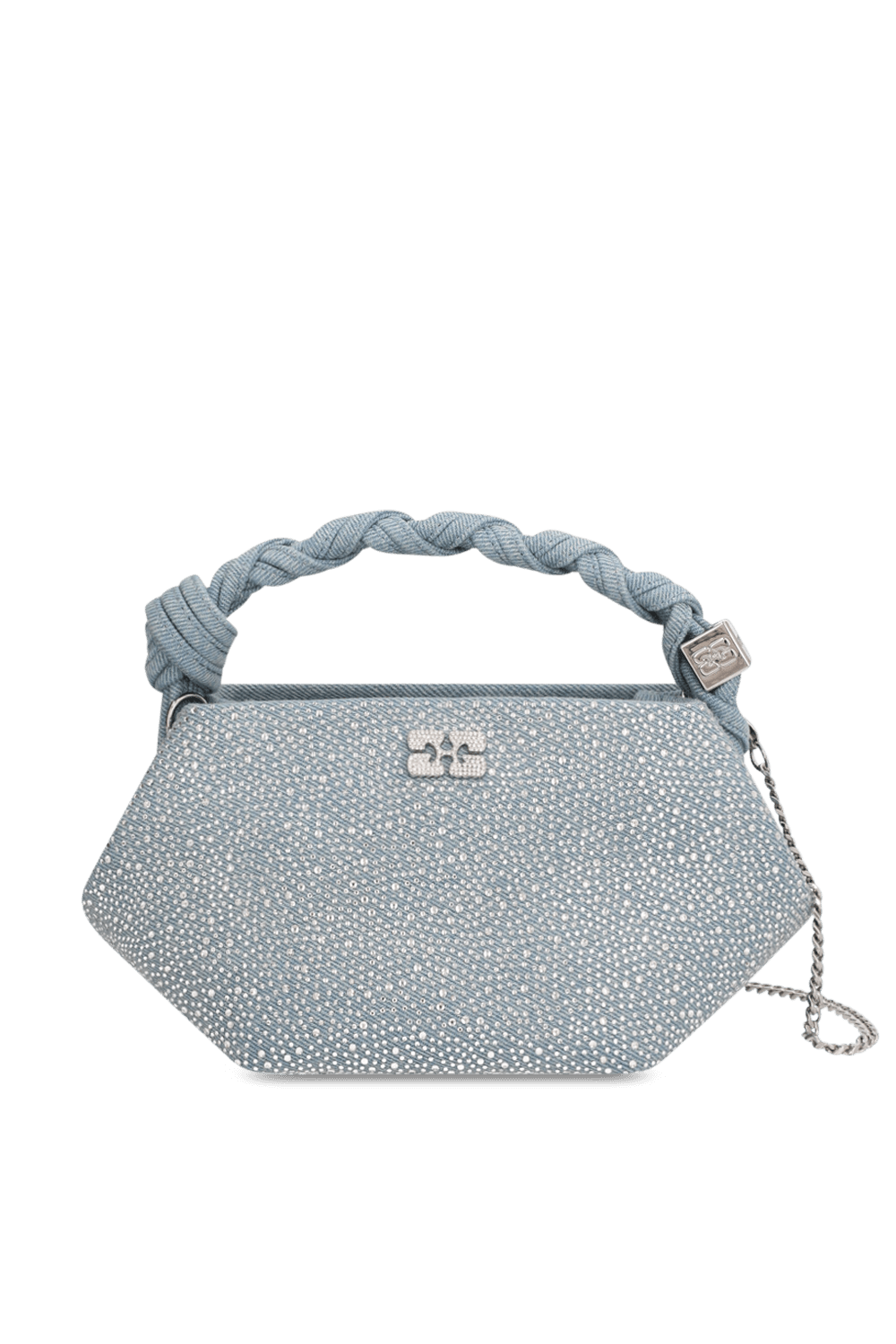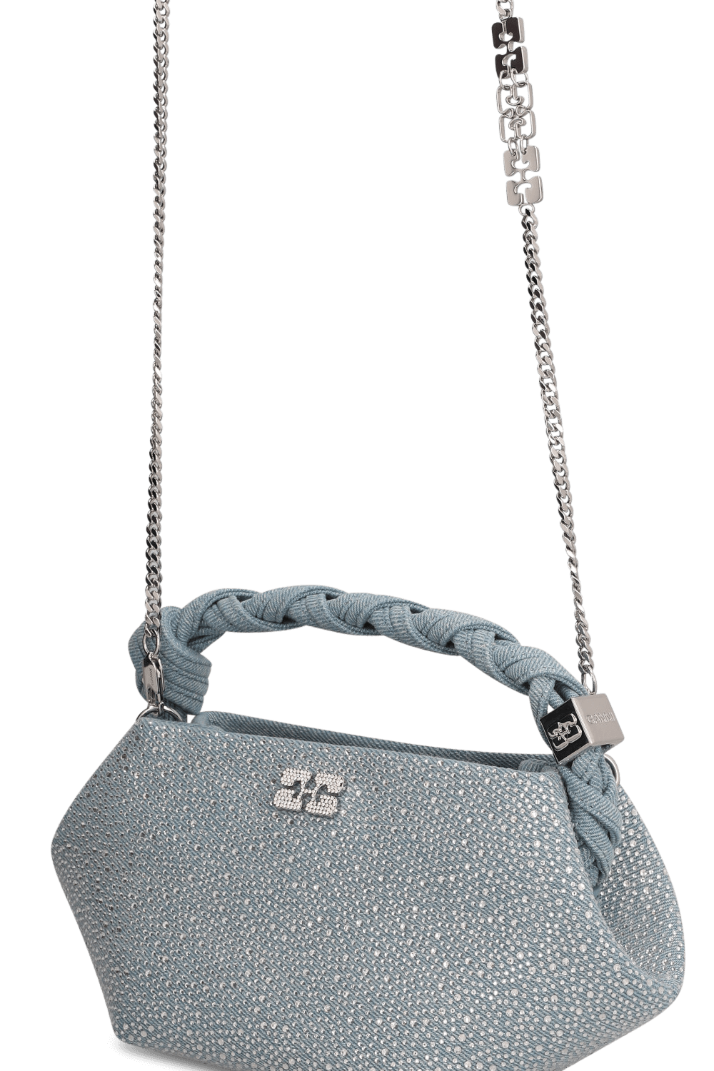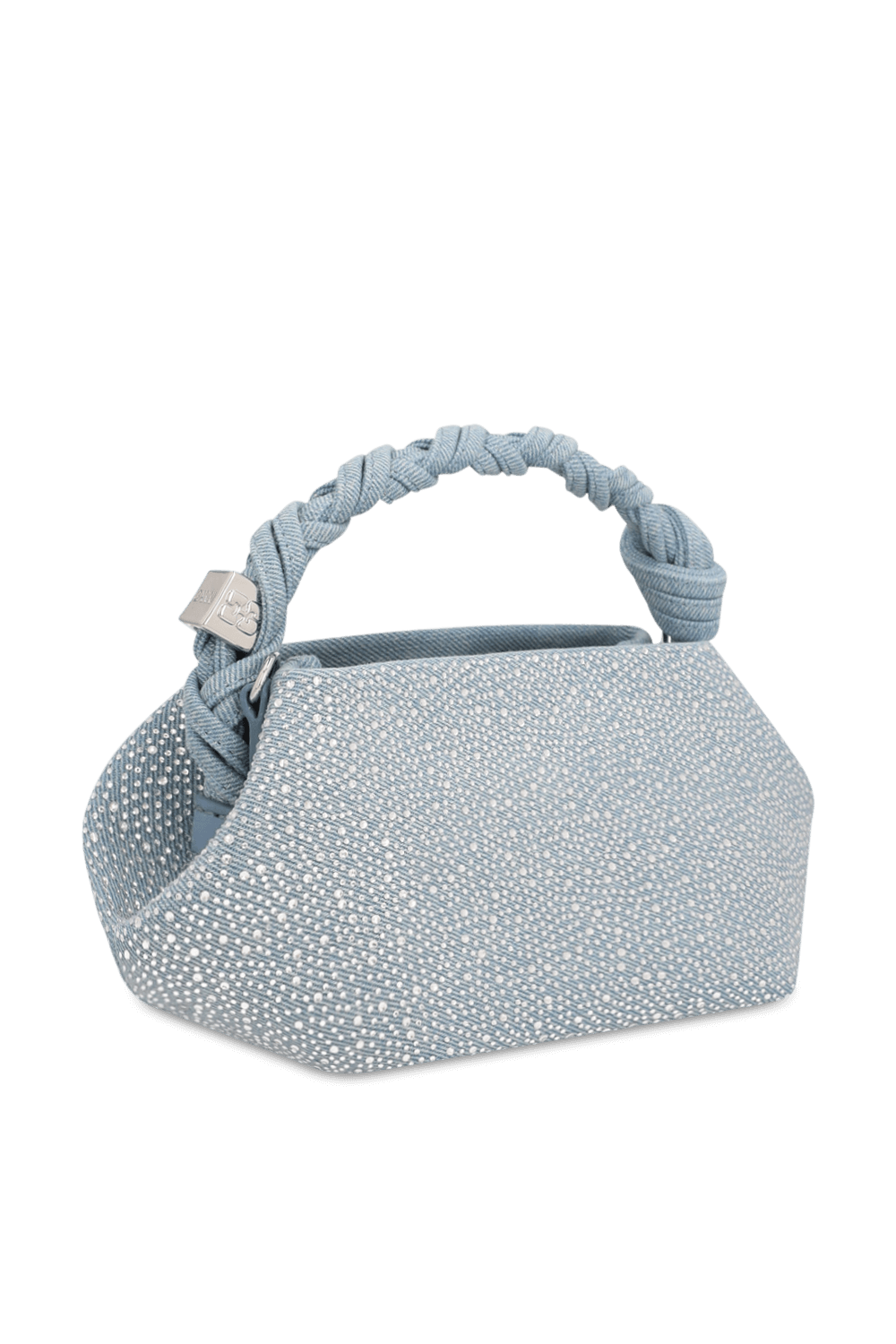 תיק דגם Bou ג'ינס בגודל מיני מבית Ganni. הוא עשוי כותנת דנים ממחוזרת בצבע כחול בהיר, בשיבוץ אבנים בבד ובלוגו. יש לו ידית נשיאה מג'ינס קלוע המשלבת לוגו מטאלי מרובע. לתיק ביטנת בד שחורה והוא כולל שני תאים עם כיס פנימי בסגירת כפתור מגנטי ורצועת קרוס מתכווננת וניתנת להסרה.