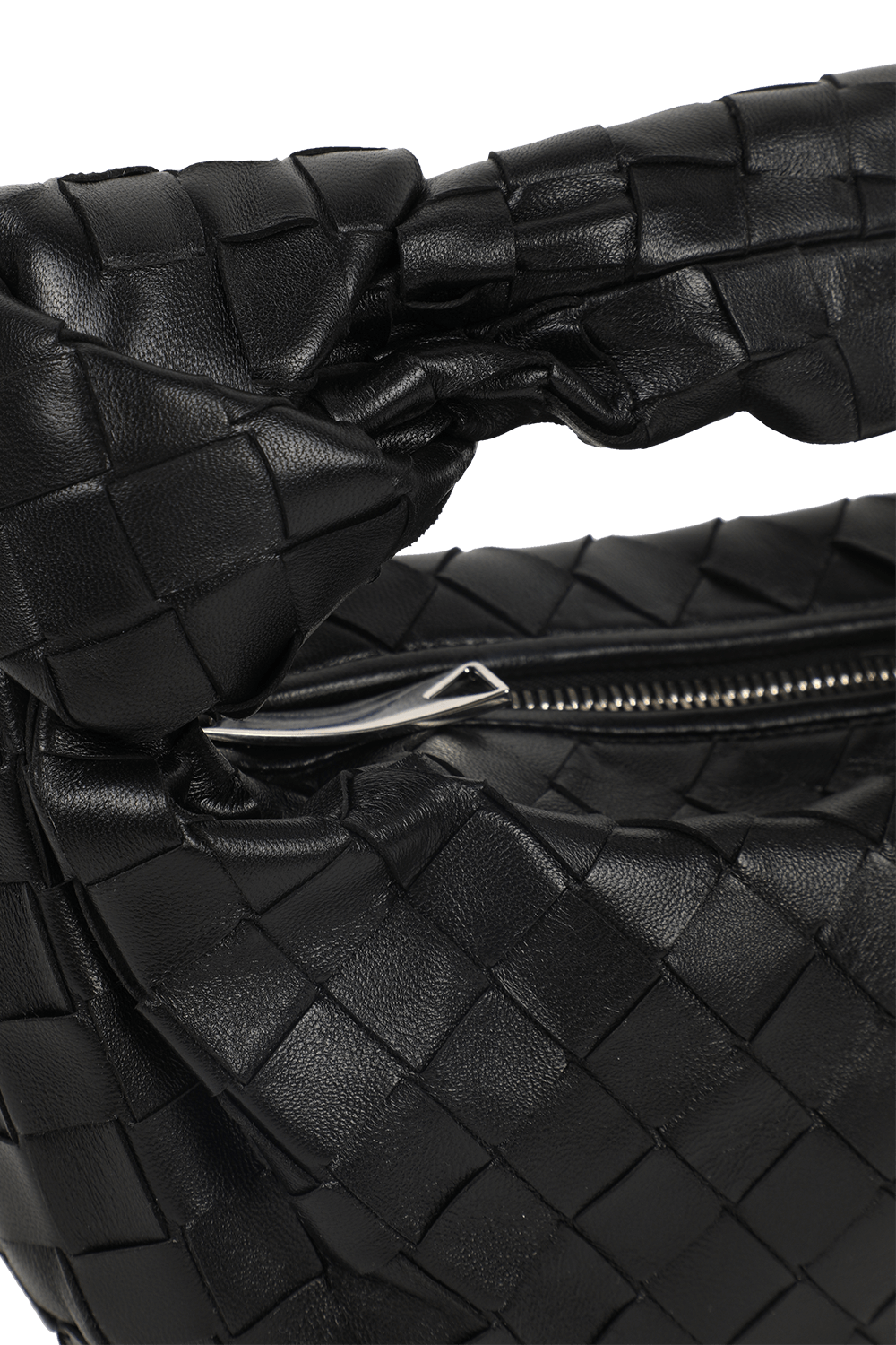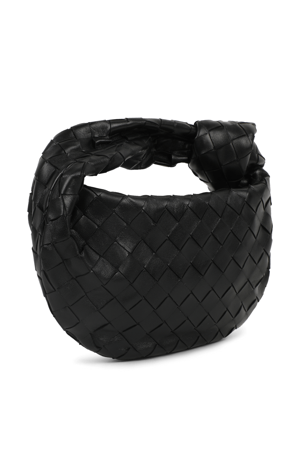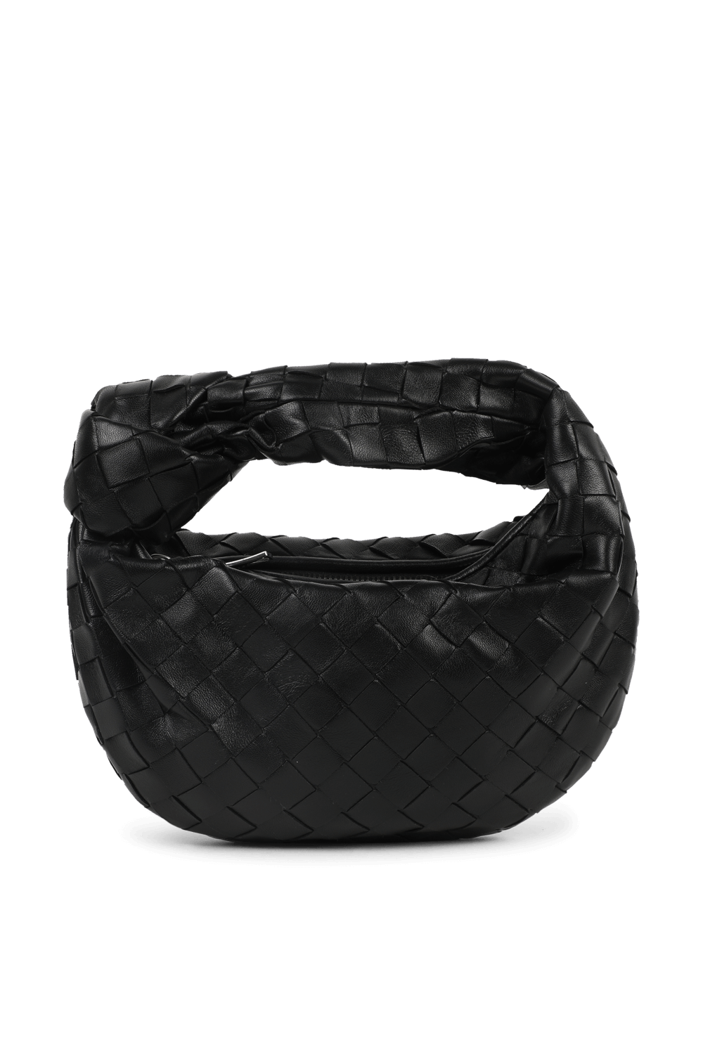 תיק נשיאה בגוון שחור מבית האופנה היוקרתי והמדובר Bottega Veneta. זהו דגם בגודל מיני העשוי מ-100% עור משובח ורך במיוחד בטקסטורת שתי וערב לכדי צללית חצי מעוגלת עם ידית נשיאה המאובזרת בשני קשרים- המשמשים דיטיילז בסגנון מתוחכם ומינימליסטי. לתיק תא מרכזי עם מרווח ראוי שיכיל בקלות את כל חפצייך החיוניים והוא נרכס ברוכסן מטאלי.