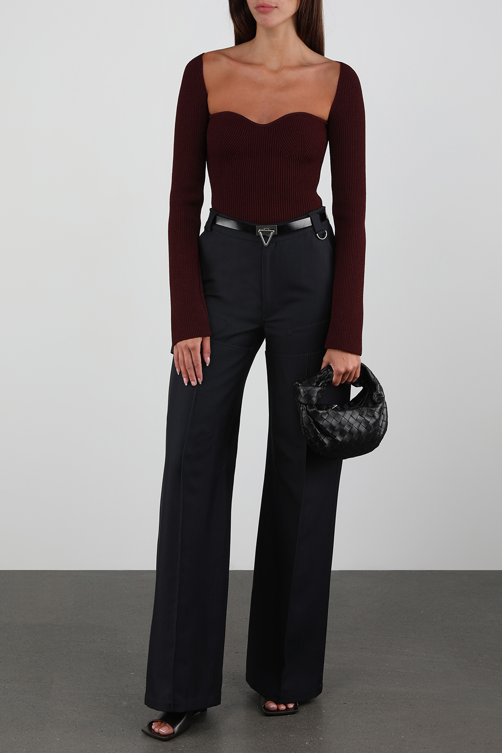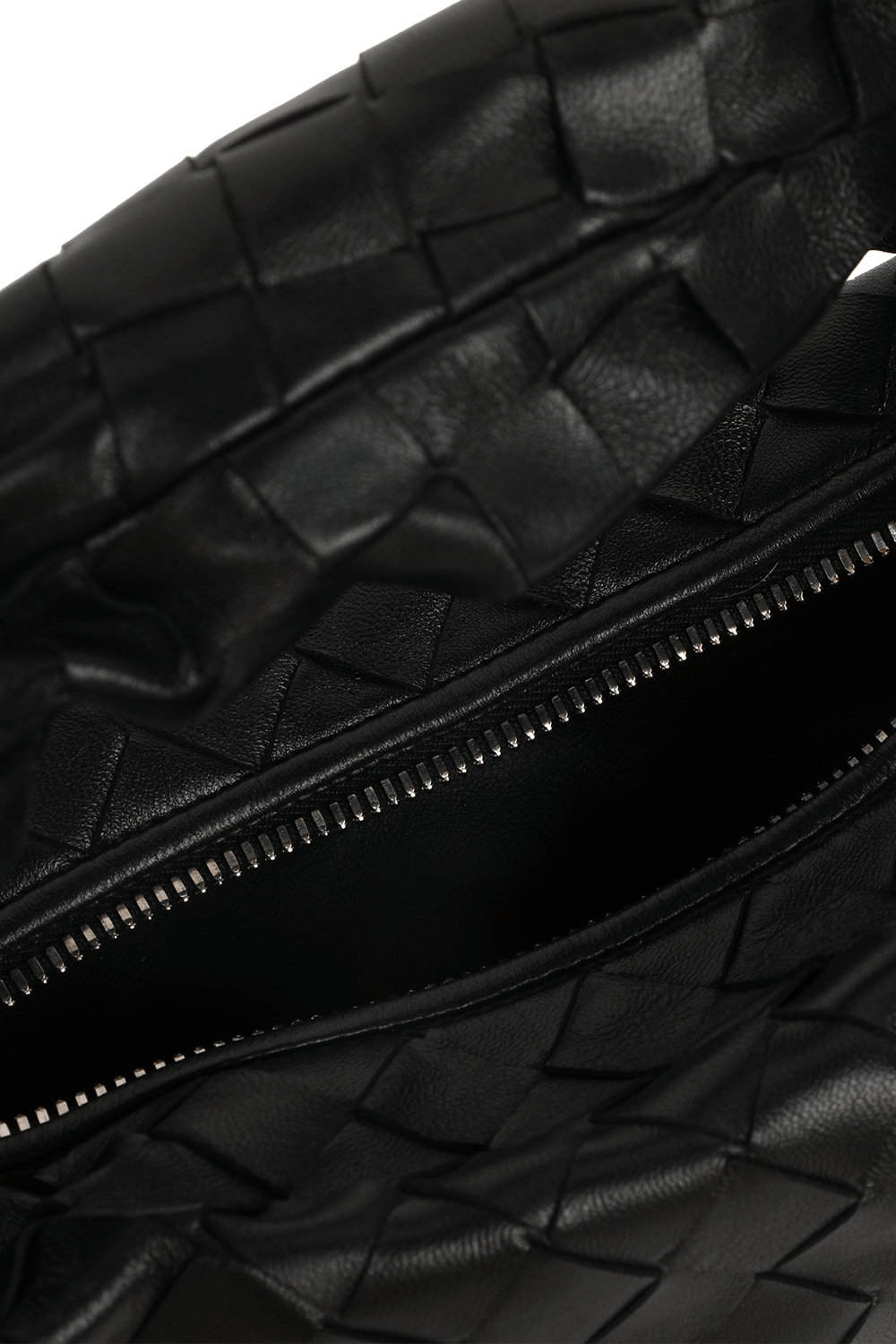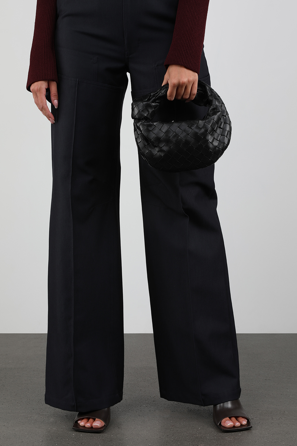 תיק נשיאה בגוון שחור מבית האופנה היוקרתי והמדובר Bottega Veneta. זהו דגם בגודל מיני העשוי מ-100% עור משובח ורך במיוחד בטקסטורת שתי וערב לכדי צללית חצי מעוגלת עם ידית נשיאה המאובזרת בשני קשרים- המשמשים דיטיילז בסגנון מתוחכם ומינימליסטי. לתיק תא מרכזי עם מרווח ראוי שיכיל בקלות את כל חפצייך החיוניים והוא נרכס ברוכסן מטאלי.