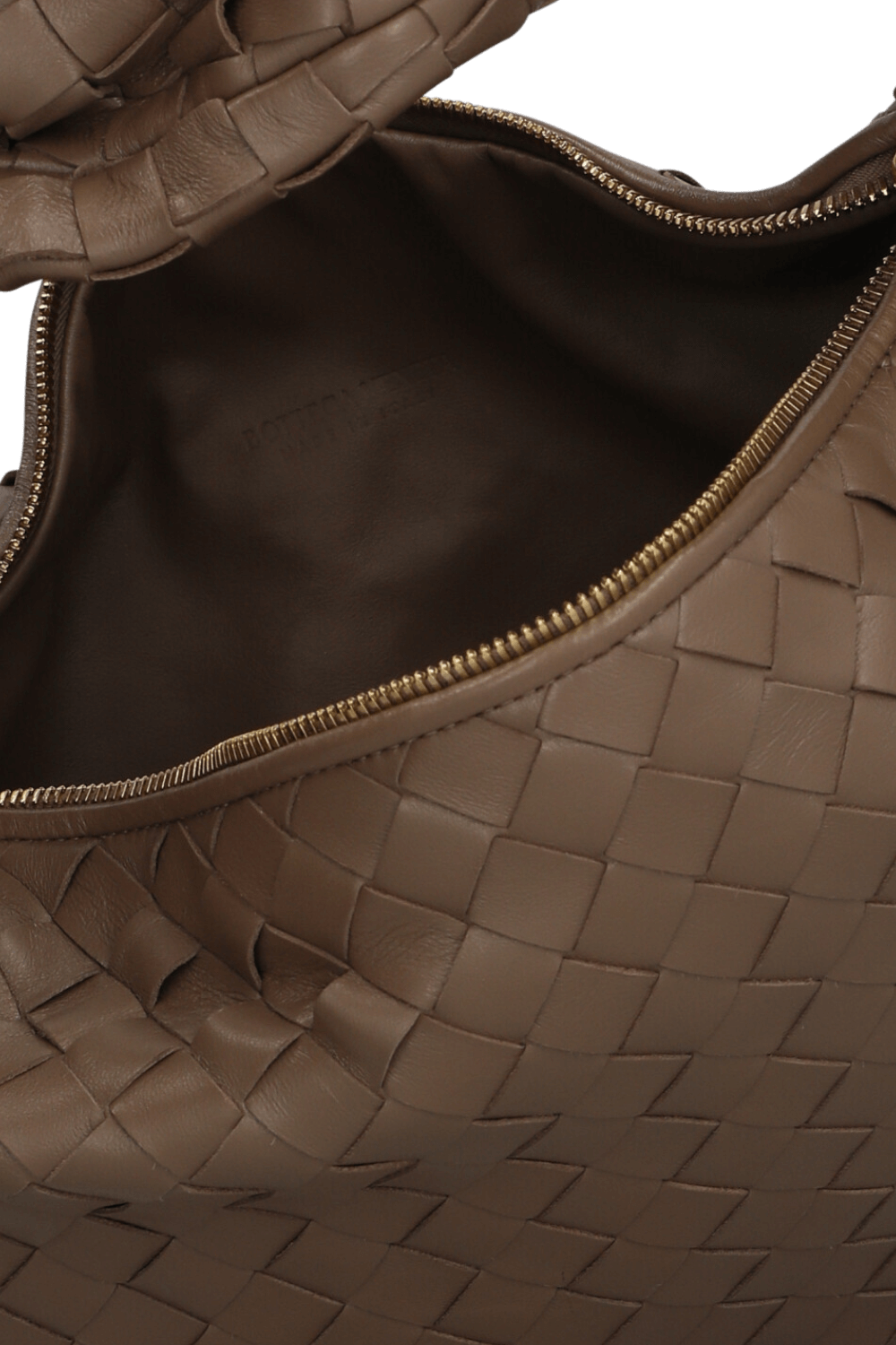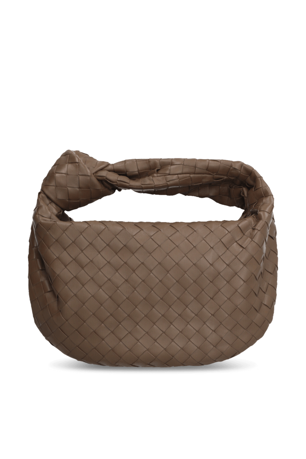 תיק Judie האייקוני בגודל סמול מבית המותג היוקרתי Bottega Veneta. הוא עשוי עור בטקסטורת שתי וערב, עם אלמנט קשירה בידית הנשיאה המוכרת של המותג בסגנון מתוחכם ומינימליסטי. התיק בצבע חום-מוקה ולו תא מרכזי מרווח הנסגר ברוכסן, עם ביטנת עור חלקה וכיס פנימי בסגירת רוכסן גם כן.