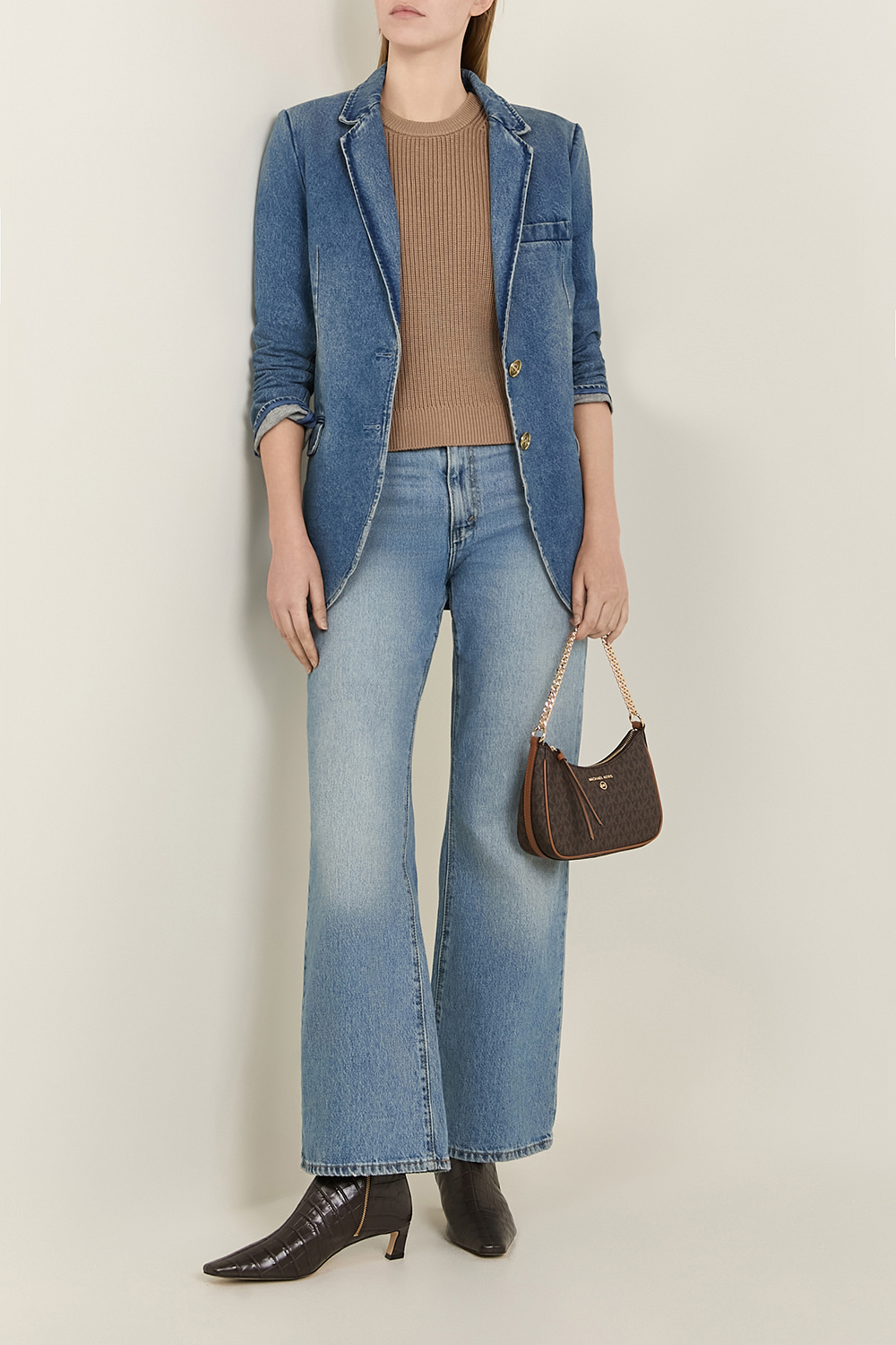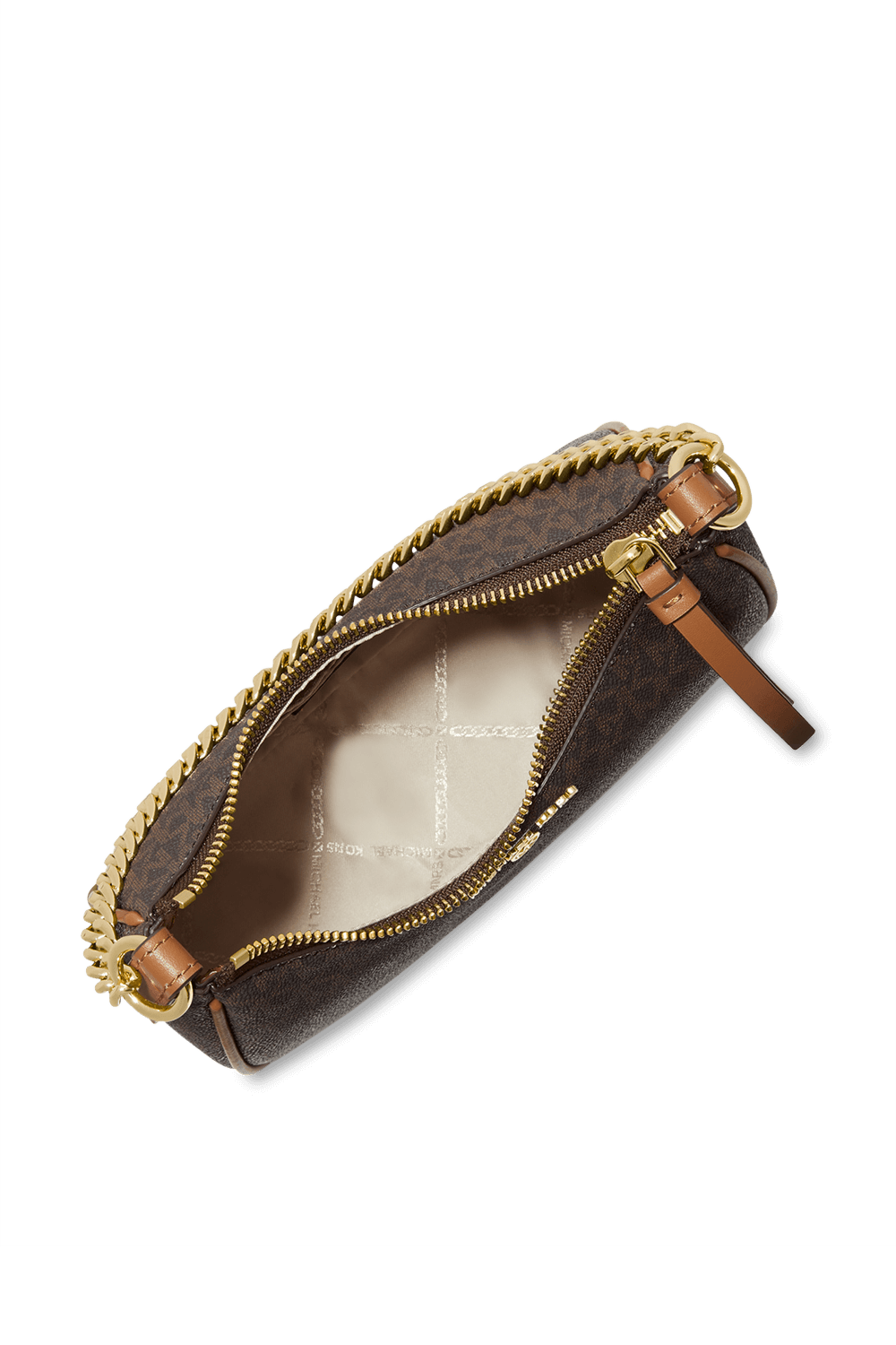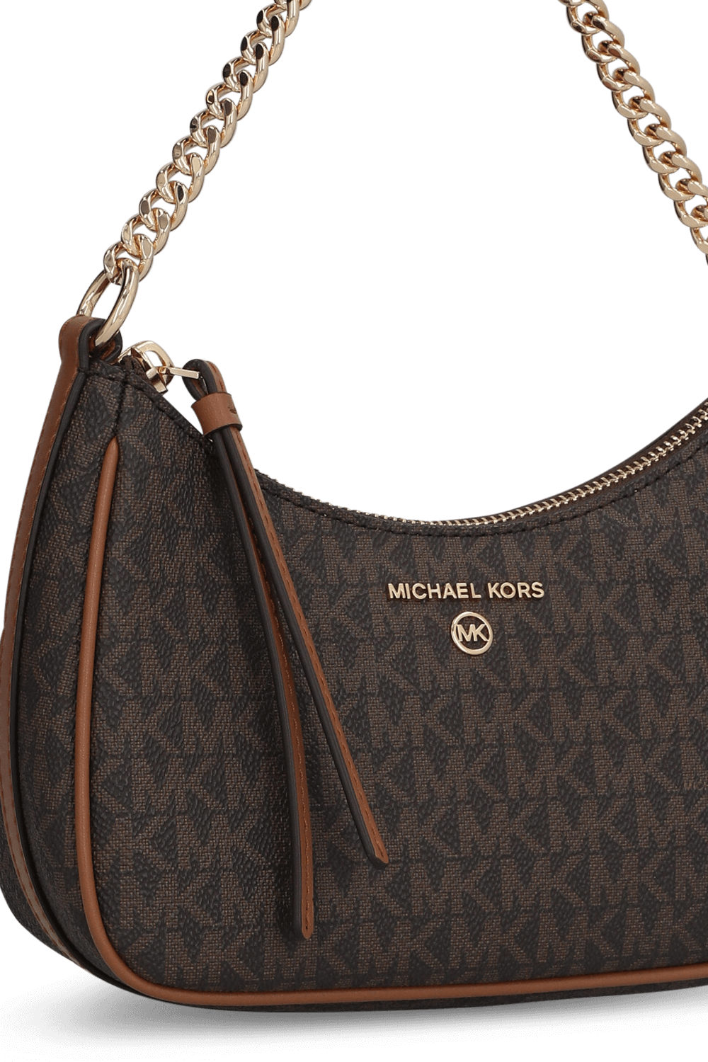 תיק ג'ט סט בגודל סמול מבית Michael Kors, עשוי קנבס בצבע חום ובדוגמת מונוגרמת MK האהובה, עם גימורים מעור. לתיק ביטנת סאטן ושלושה חריצים לכרטיסים, יש לו שרשרת נשיאה זהובה והוא נסגר ברוכסן.