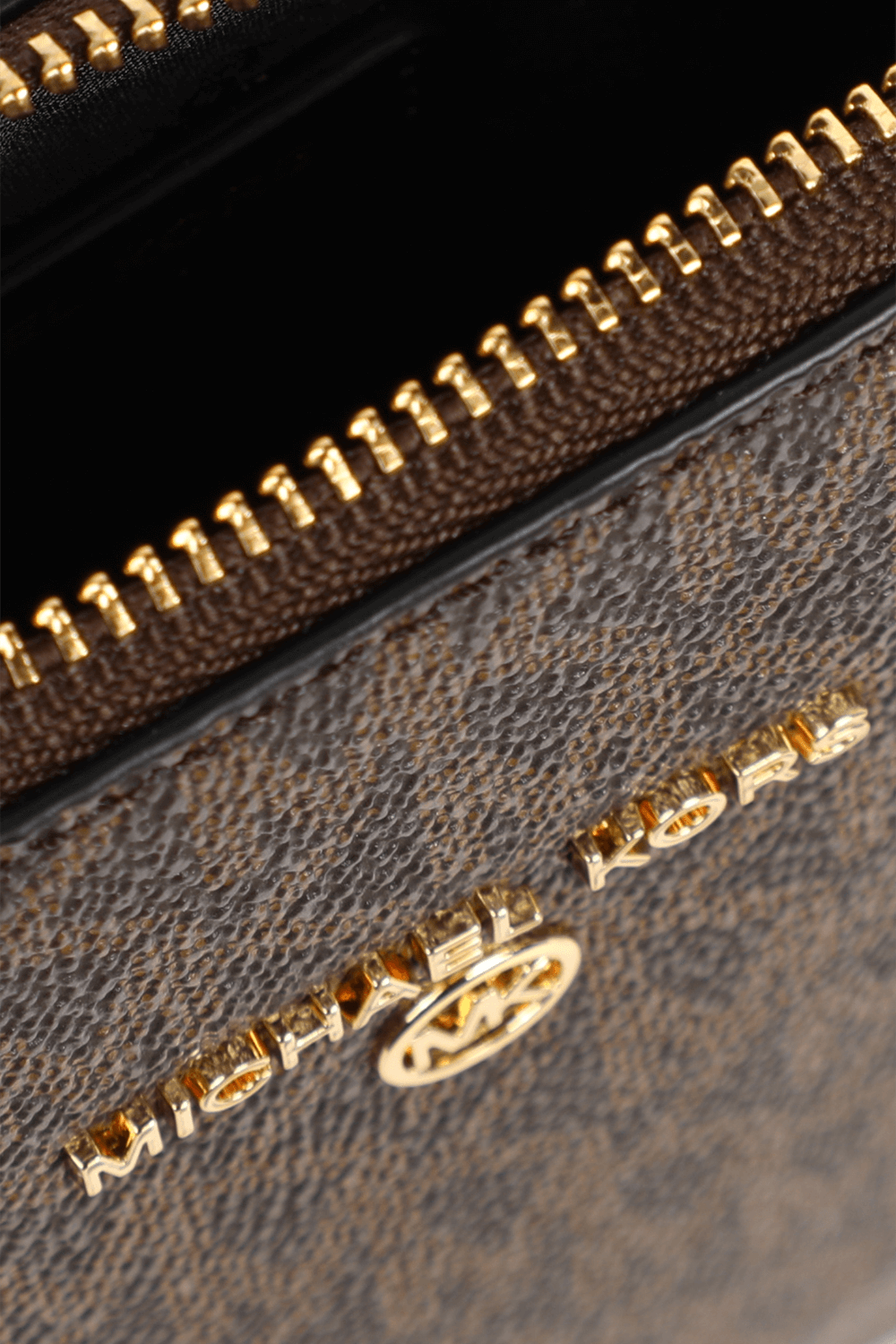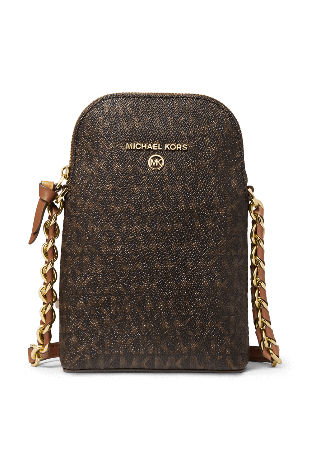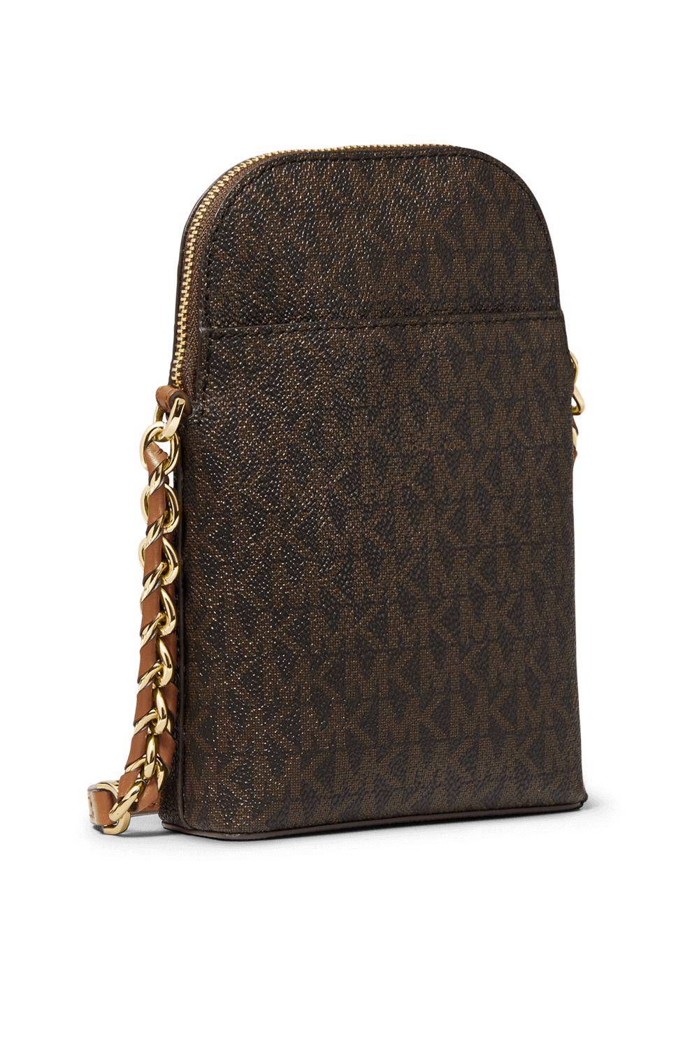 תיק קרוסבודי מדגם Jet Set מבית Michael Kors, עשוי תערובת PVC, כותנת קנבס ופוליאסטר בצבע חום ובהדפס מונוגרמה. לתיק תא אחסון מרכזי וכיס חיצוני בשילוב רצועת נשיאה עשויה שרשראות מטאליות זהובות.\n