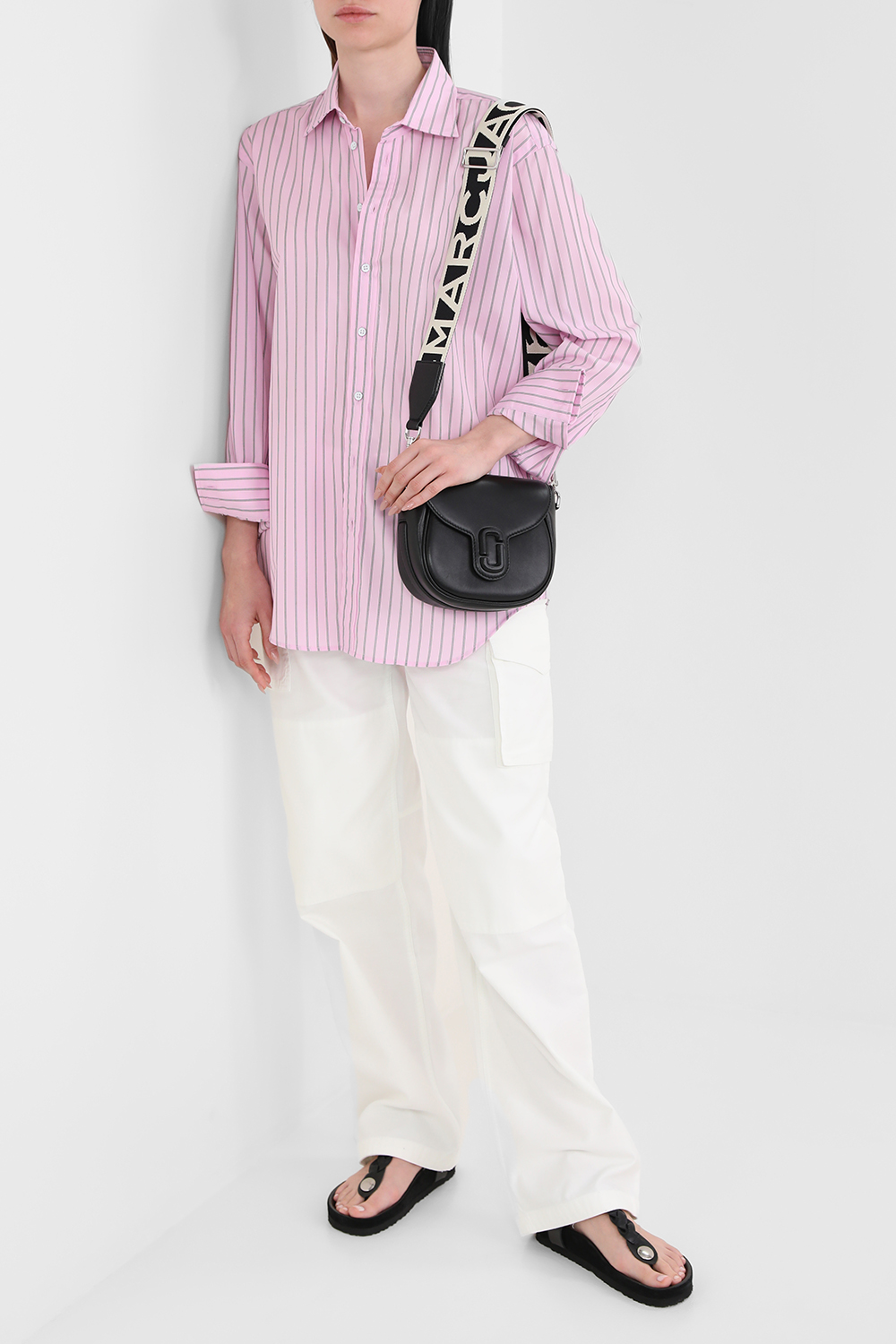 "תיק צד מדגם J בגודל סמול מבית האופנה המוביל Marc Jacobs. דגם העשוי מ- 100% עור בצבע שחור בצורה מתקפלת עם תא מרווח וכיס, לצד רצועת קרוס ארוכה וממותגת."