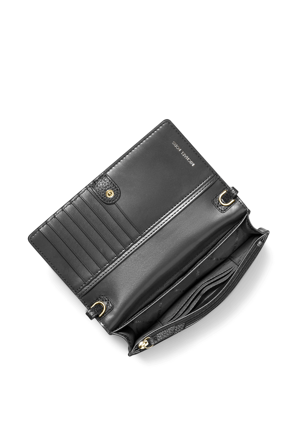 תיק ארנק מדגם Jet Set בגודל סמול מבית Michael Kors, עשוי עור מגורען בצבע שחור. לתיק תא אחסון של ארנק עם חלוקה לשמונה חריצים ייעודים לכרטיסי אשראי בשילוב תא למטבעות.