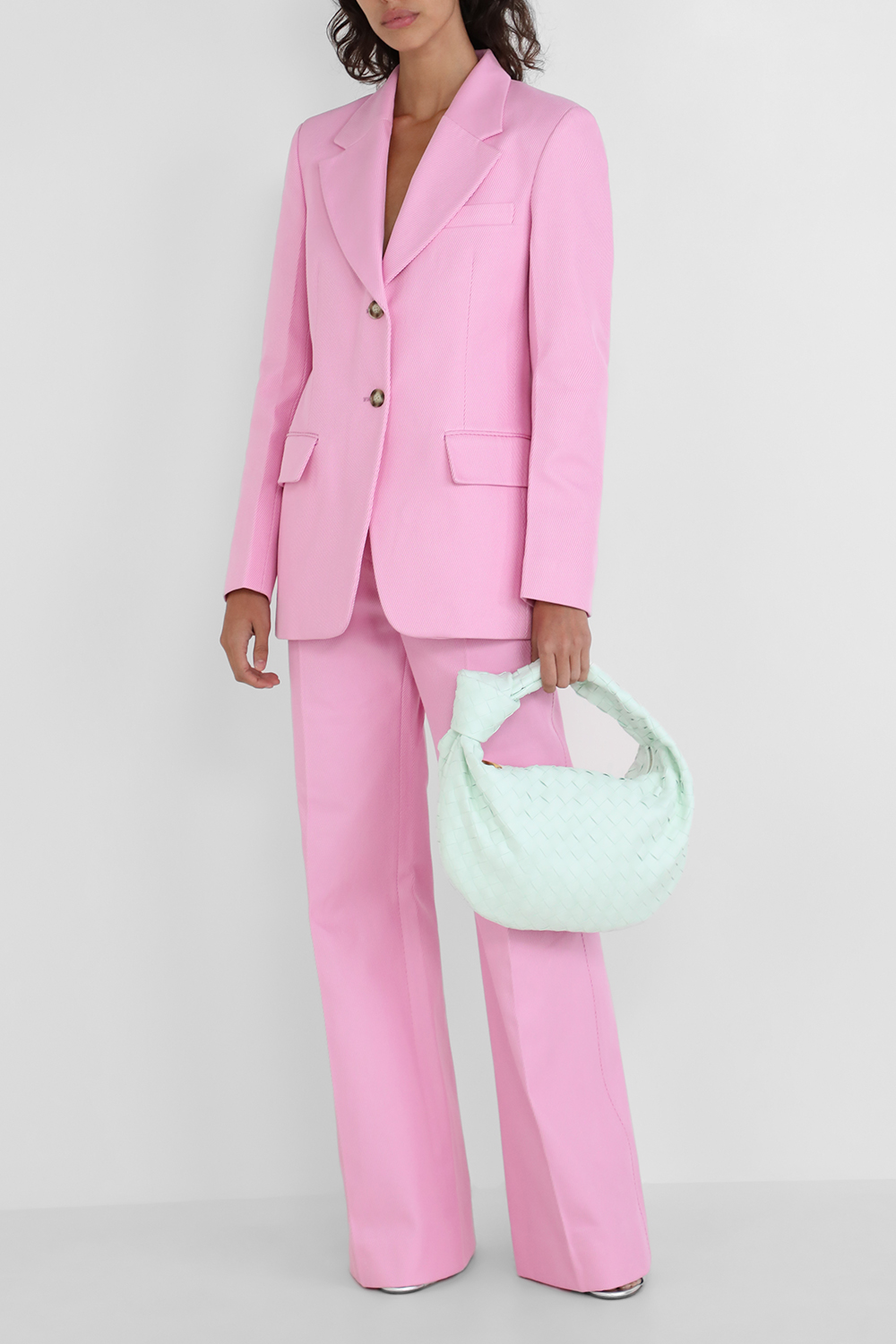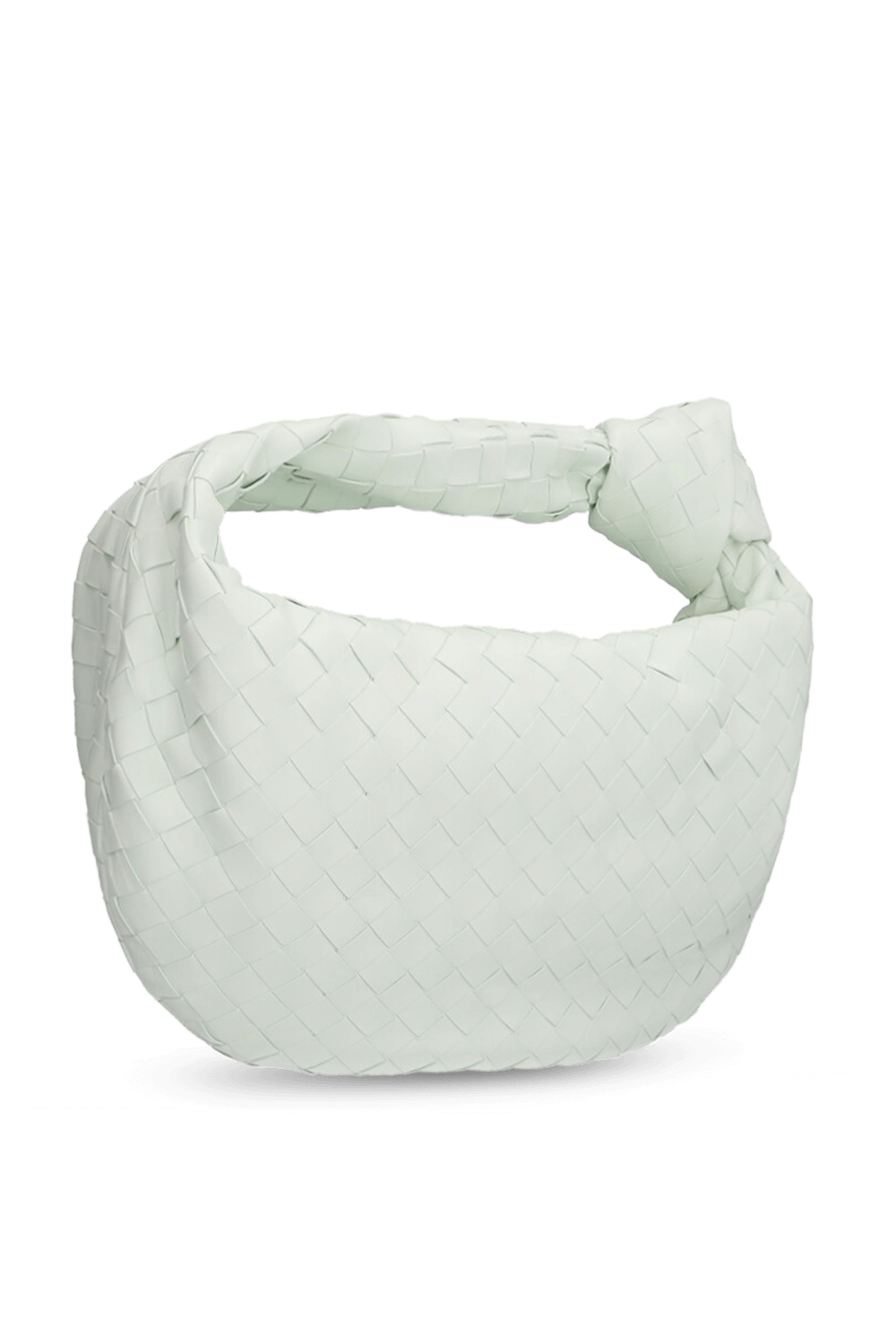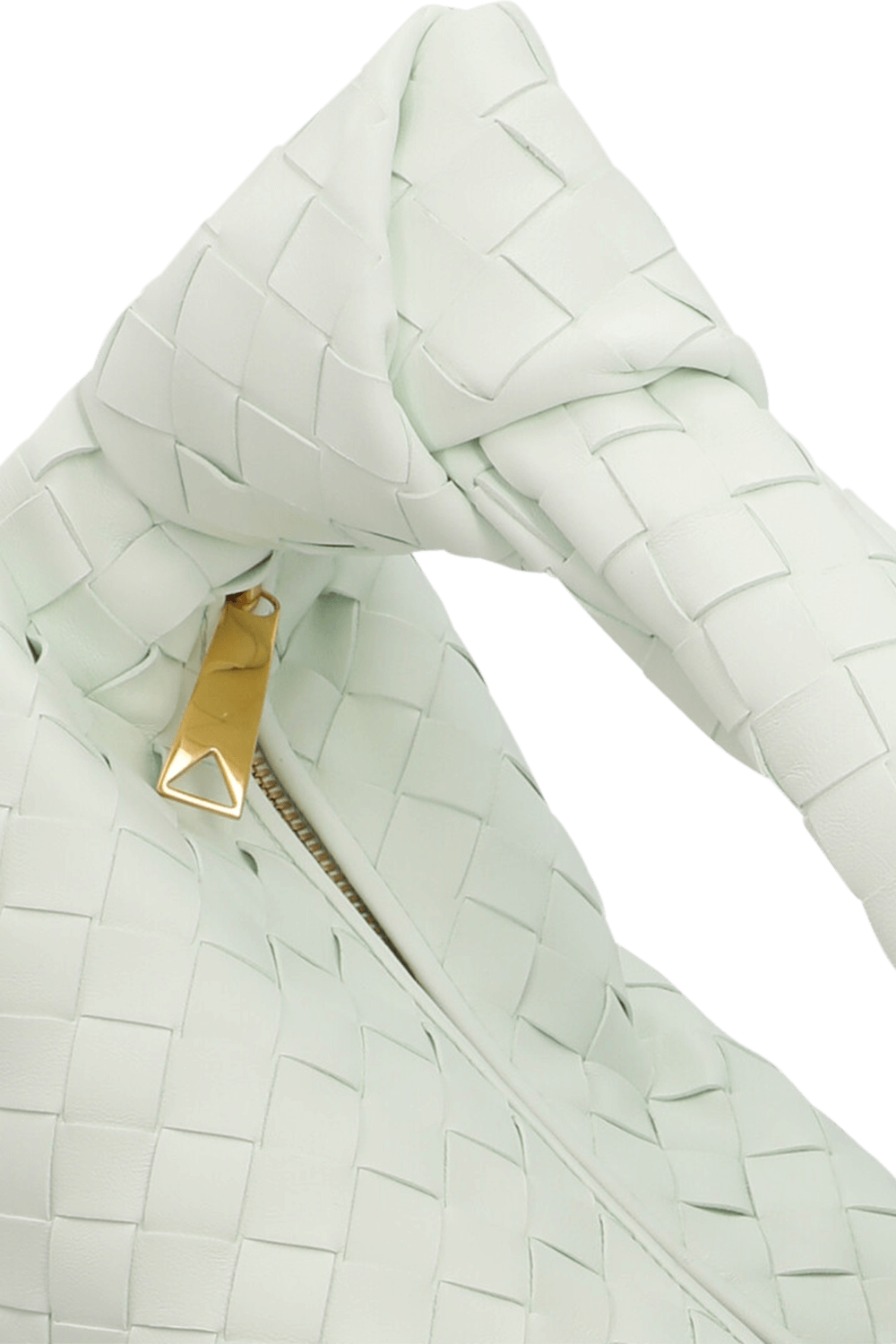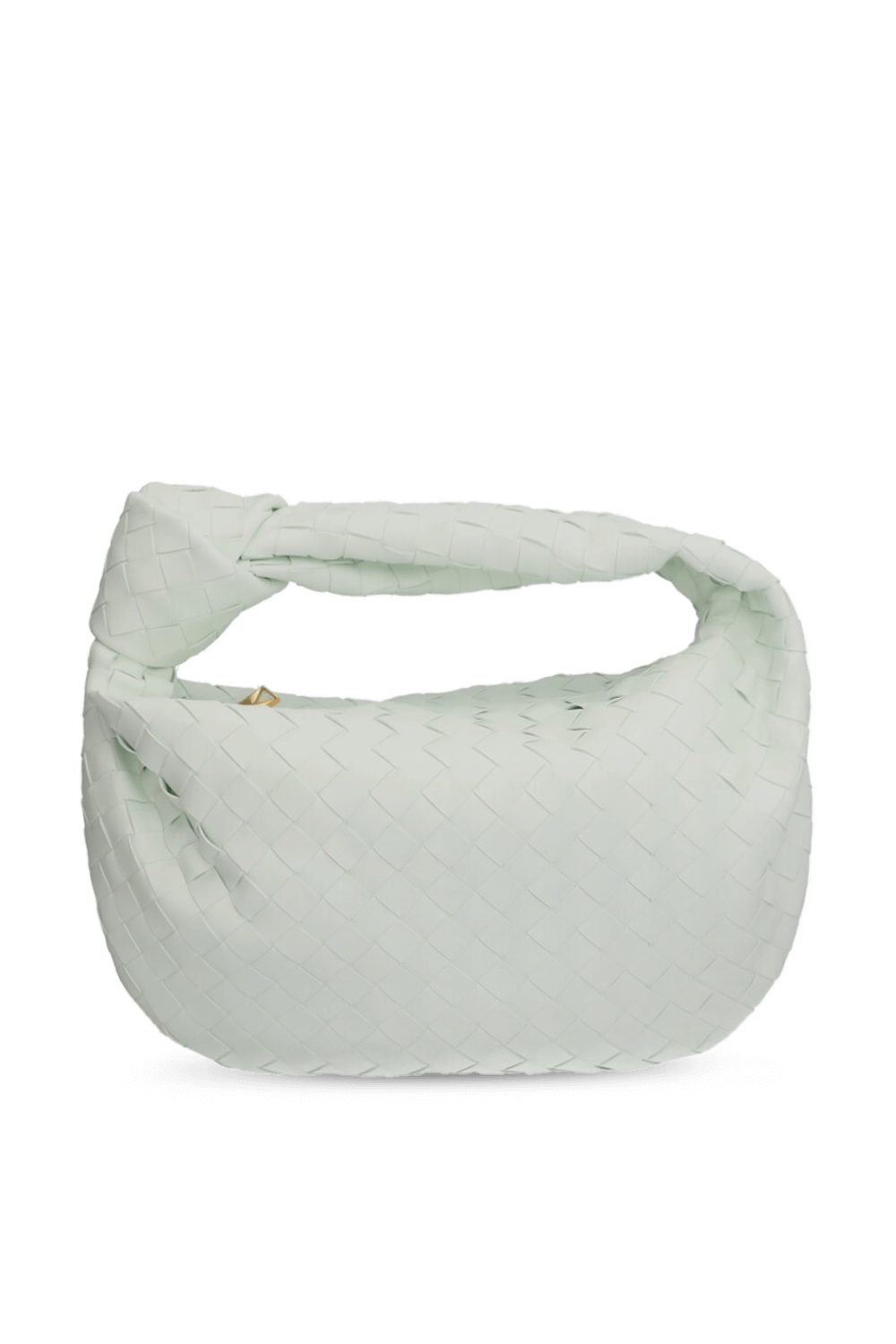 תיק נשיאה בגודל מיני בצבע ירוק מנטה מבית האופנה היוקרתי והמדובר Bottega Veneta. זהו דגם העשוי מ-100% עור משובח ורך במיוחד בטקסטורת שתי וערב לכדי צללית חצי מעוגלת עם ידית נשיאה קשורה. לתיק תא מרכזי עם מרווח ראוי שיכיל בקלות את כל חפצייך החיוניים והוא נרכס ברוכסן מטאלי.