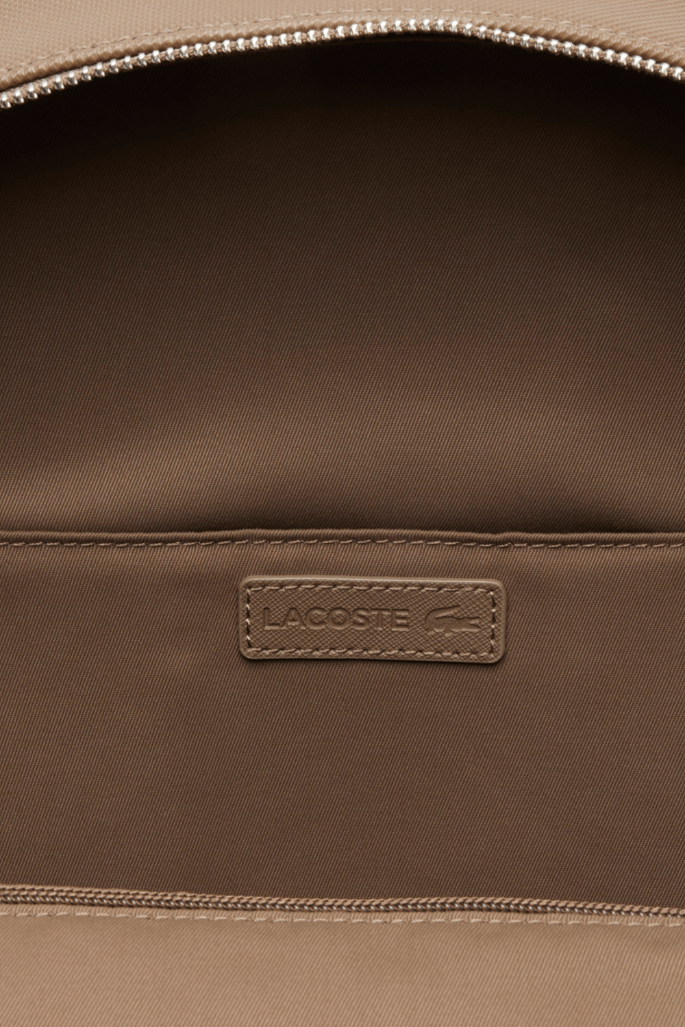 תיק גב מבית Lacoste, עשוי קנבס בצבע חום במראה פיקה. תאו המרכזי כולל תא מרופד יעודי ללפטופ 13 אינץ', שני כיסים פנימיים ותא פנימי עם רוכסן. יש לו תא חיצוני בסגירת רוכסן וכיס חיצוני נוסף בסגירת תיק תק. גב התיק עשוי בד רשת מרופד, נוח ואוורירי והוא נסגר ברוכסן.