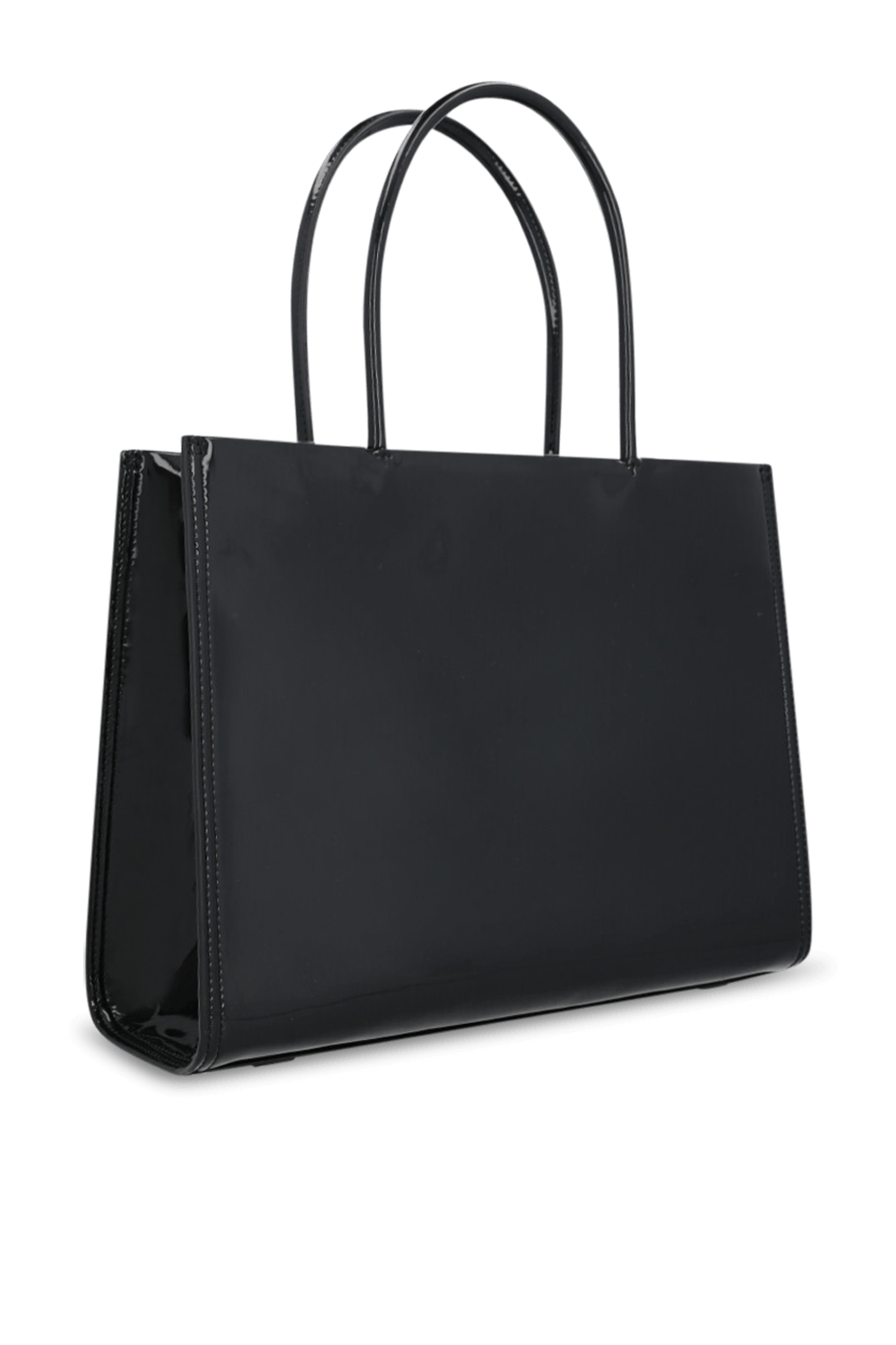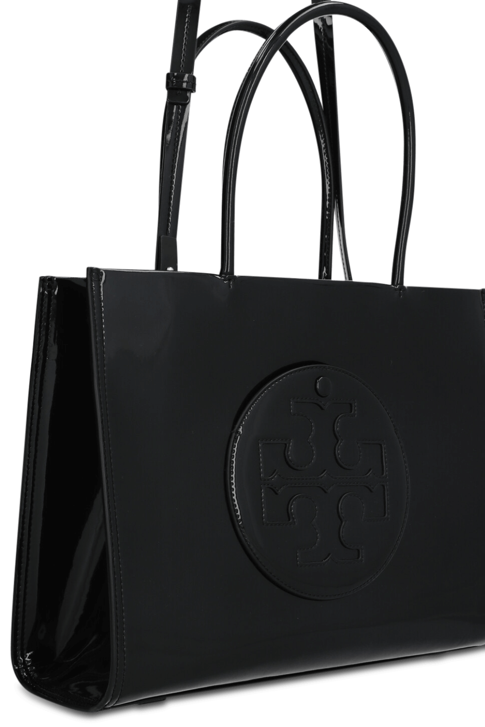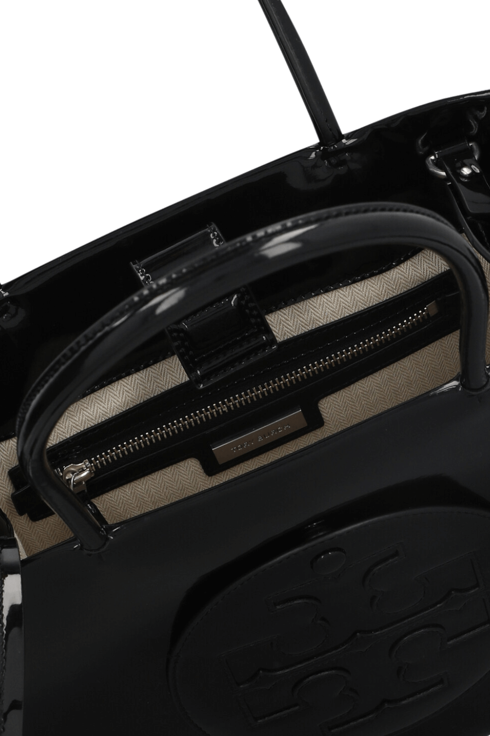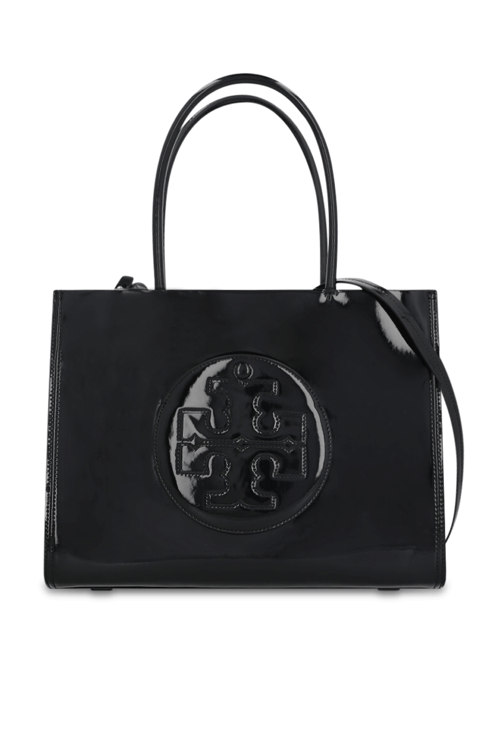 תיק Ella Tote בגודל סמול מבית Tory Burch, עשוי עור לכה טבעוני בצבע שחור עם הטבעת לוגו המותג במרכז. לתיק תא מרכזי ובו שני כיסים - אחד מהם בסגירת רוכסן. הוא נסגר במגנט ויש לו שתי ידיות אחיזה ורצועת נשיאה הניתנת להסרה.