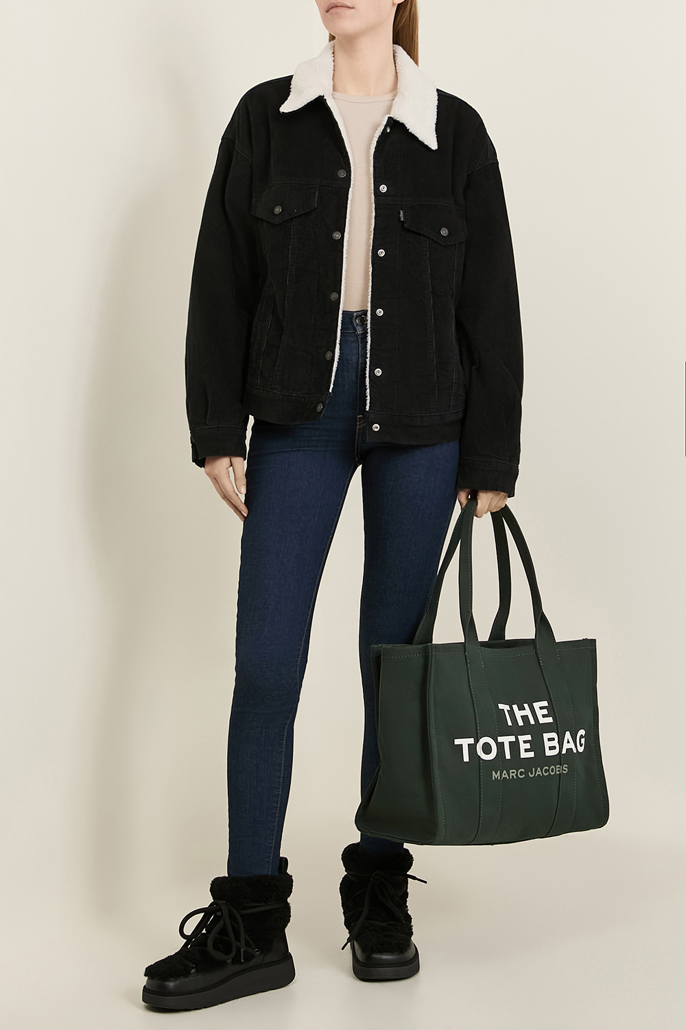 תיק נשיאה Tote בגודל לארג' מבית Marc Jacobs, עשוי כותנת קנבס בצבע ירוק כהה בשילוב תא מרכזי ובו שלושה כיסים פנימיים, אחד מהם בסגירת רוכסן, ושתי ידיות נשיאה. זהו תיק גדול שיתאים ליומיום, לחופשת סופ''ש מפנקת, לחוף הים או שפת הבריכה.