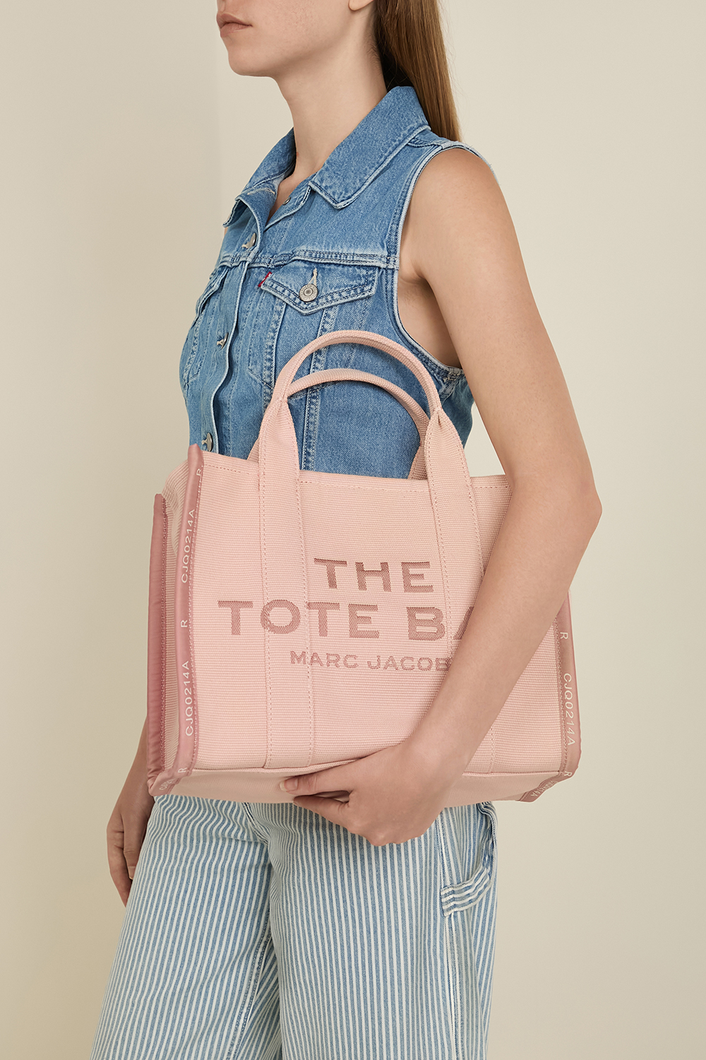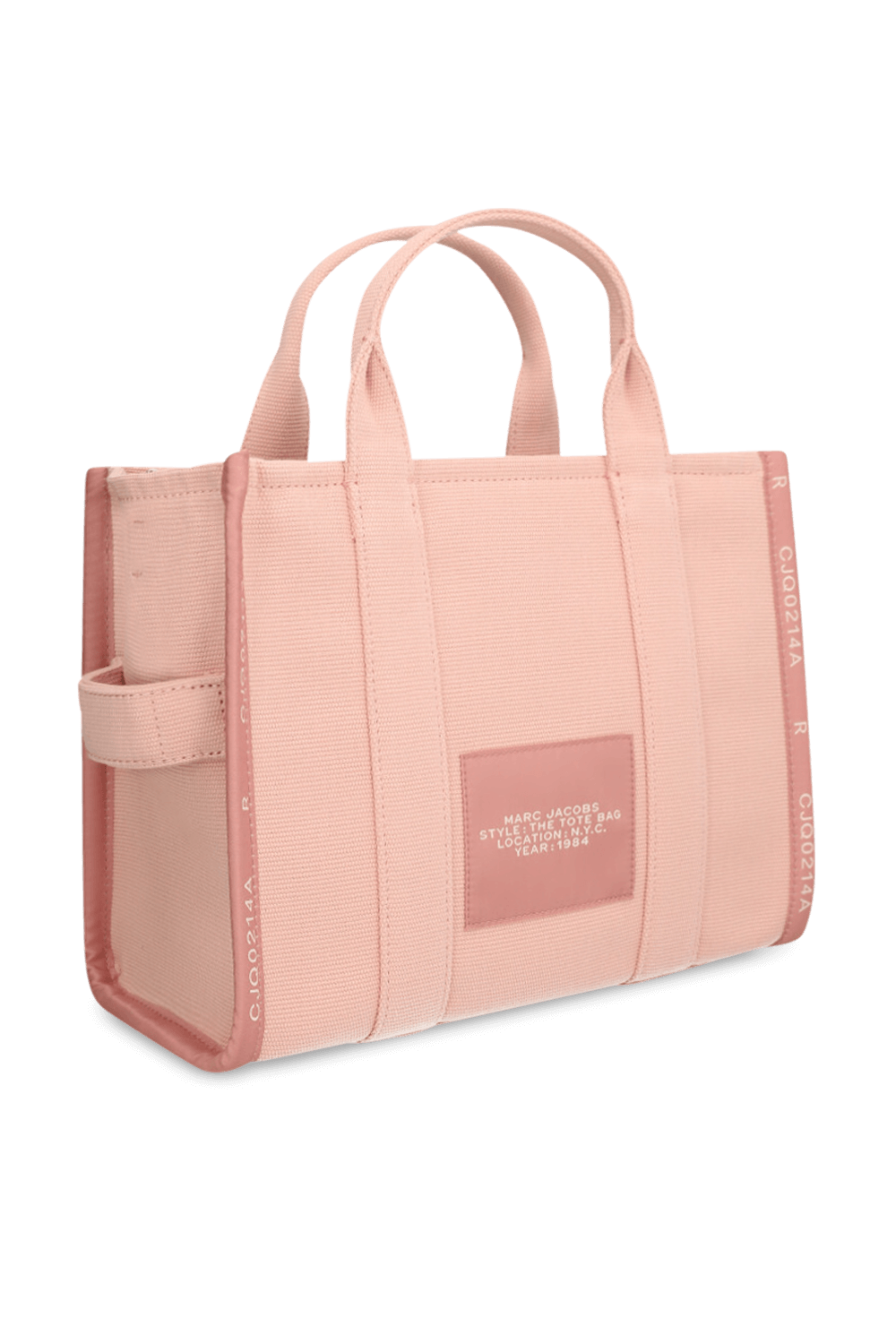 תיק Tote בגודל מדיום מבית Marc Jacobs, עשוי כותנה בצבע ורוד. לתיק תא מרכזי ובו שלושה כיסים פנימיים, אחד מהם בסגירת רוכסן. יש לו שתי ידיות נשיאה ורצועת קרוסבודי מתכווננת הניתנת להסרה. נסגר ברוכסן.