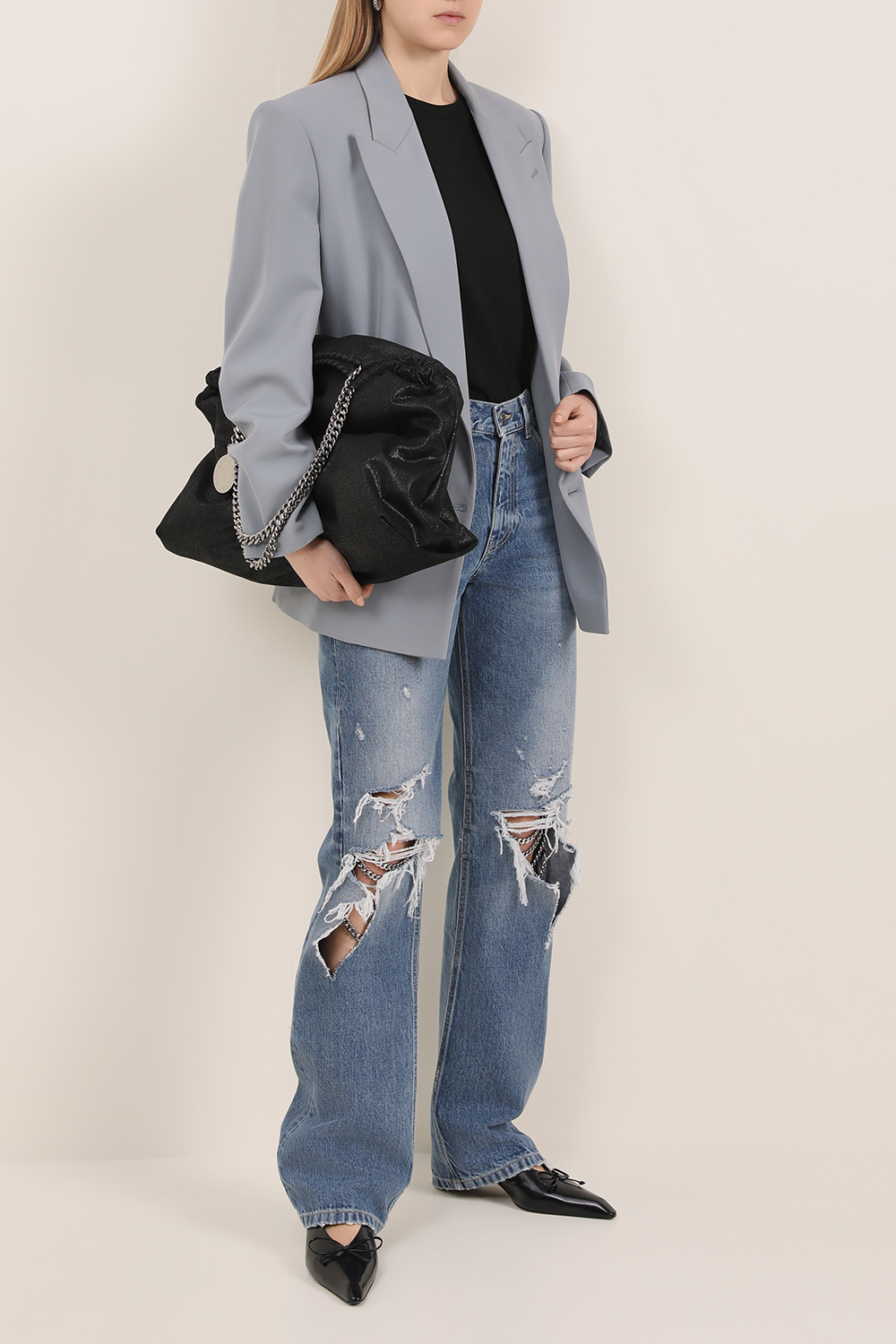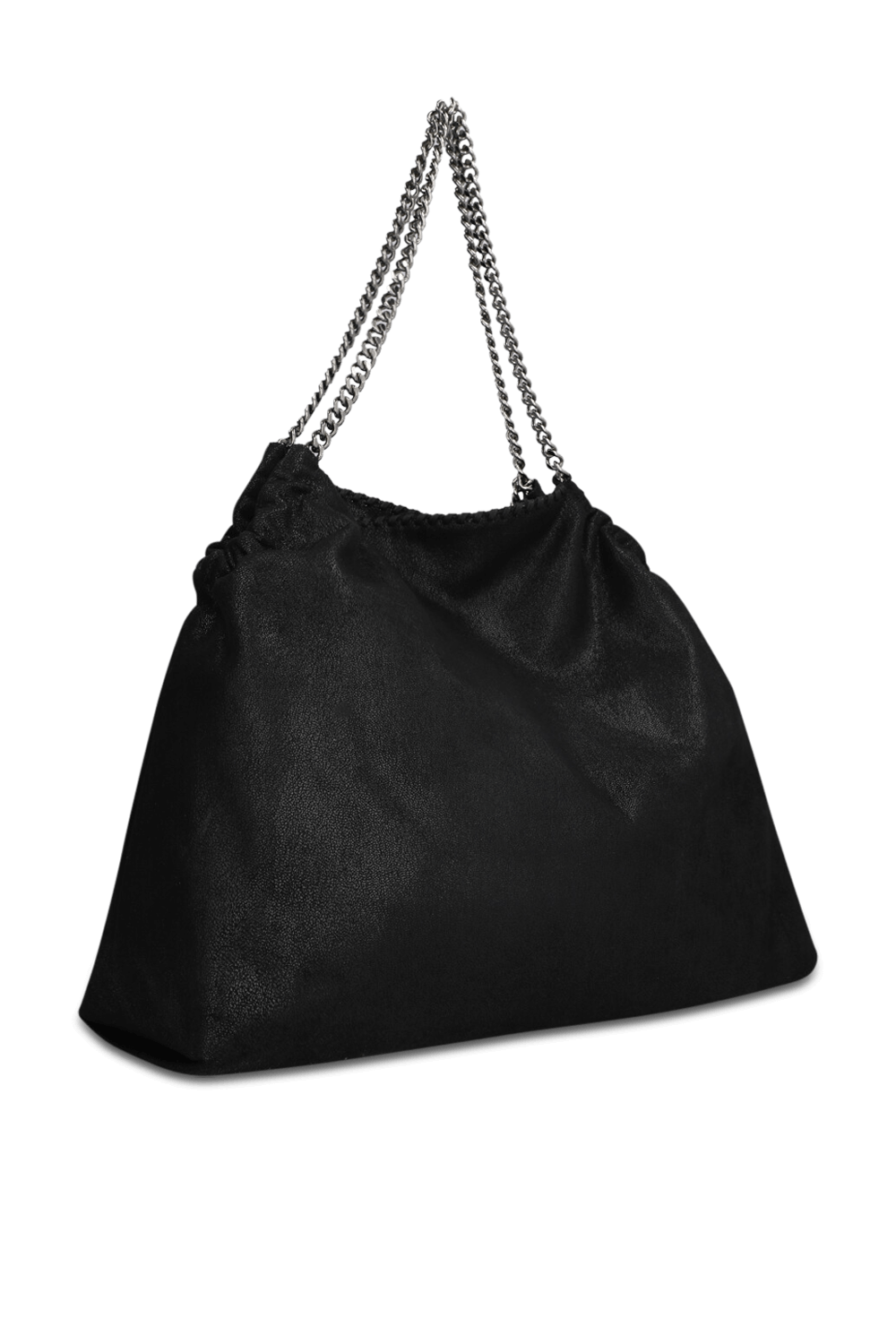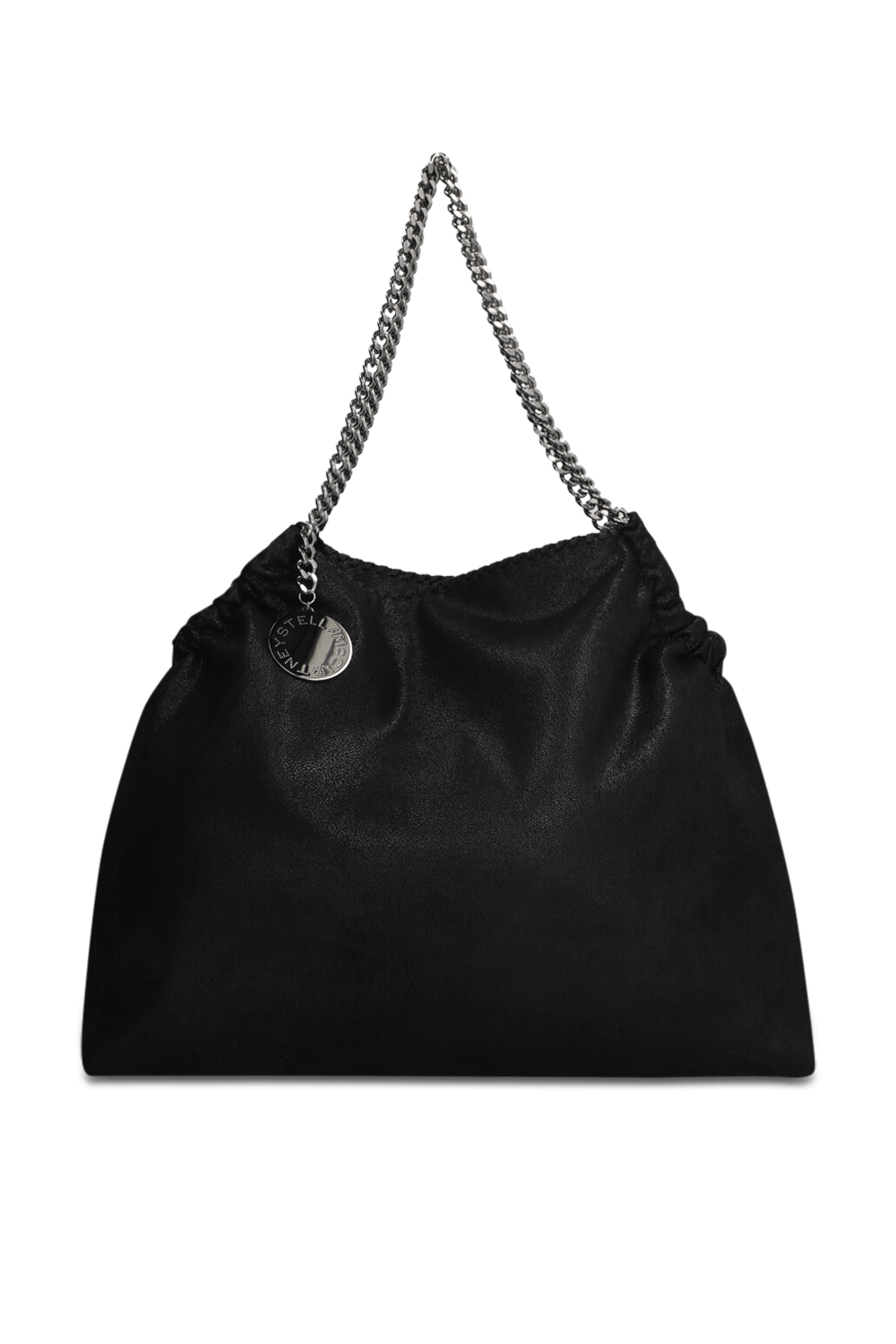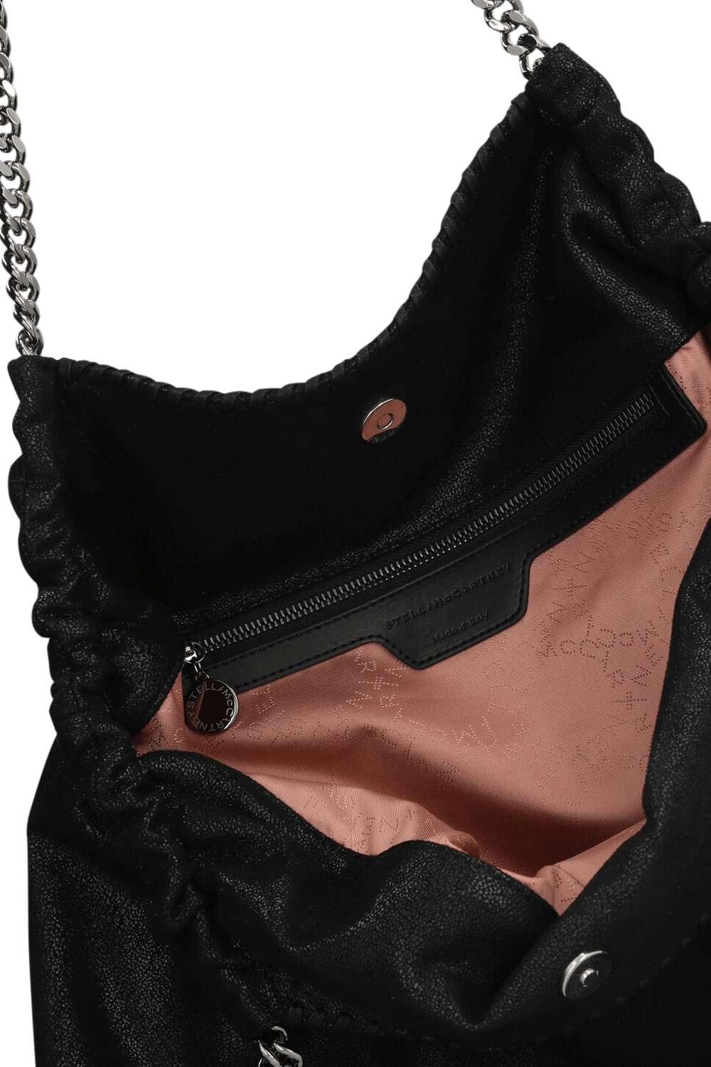 תיק Tote במראה שק מבית Stella McCartney, עשוי פוליאסטר בצבע שחור ובמראה וינטג', עם תא מרכזי מרווח ובו בטנת סאטן ורודה. לתיק רצועת נשיאה עשויה שרשראות כסופות.